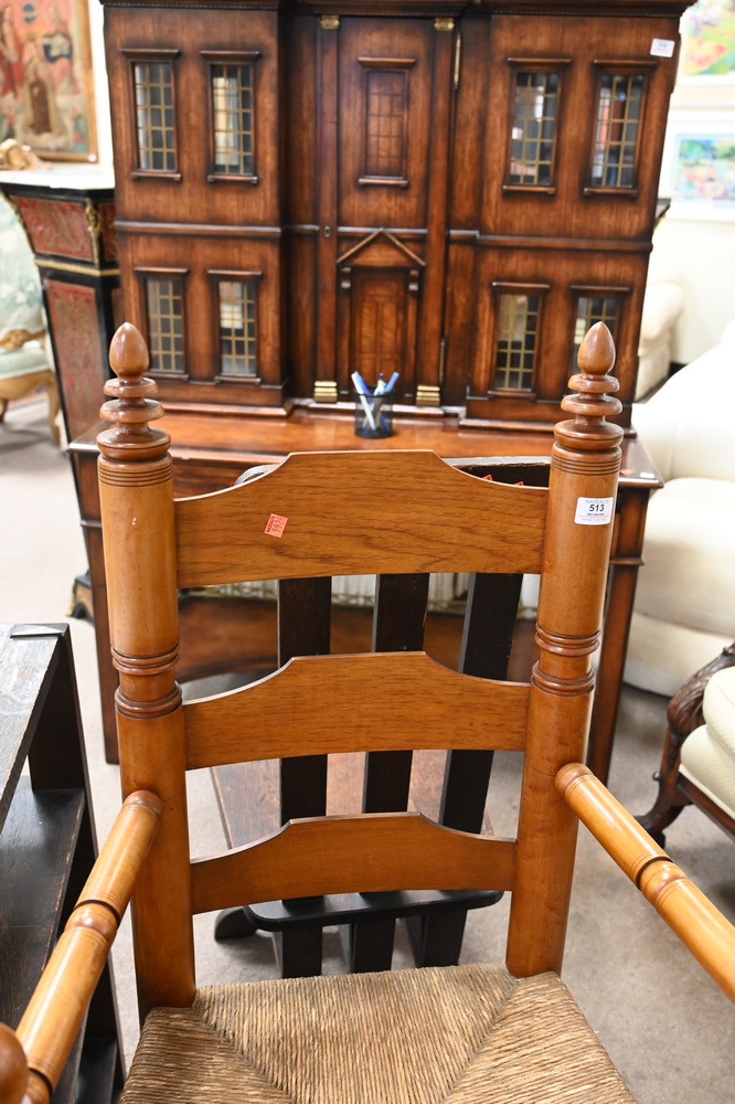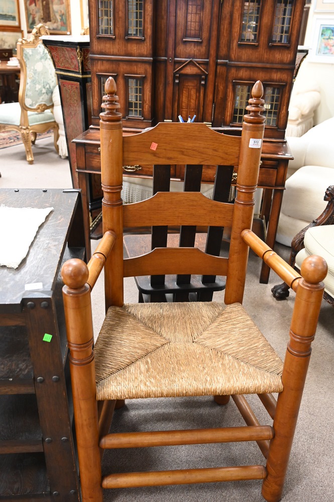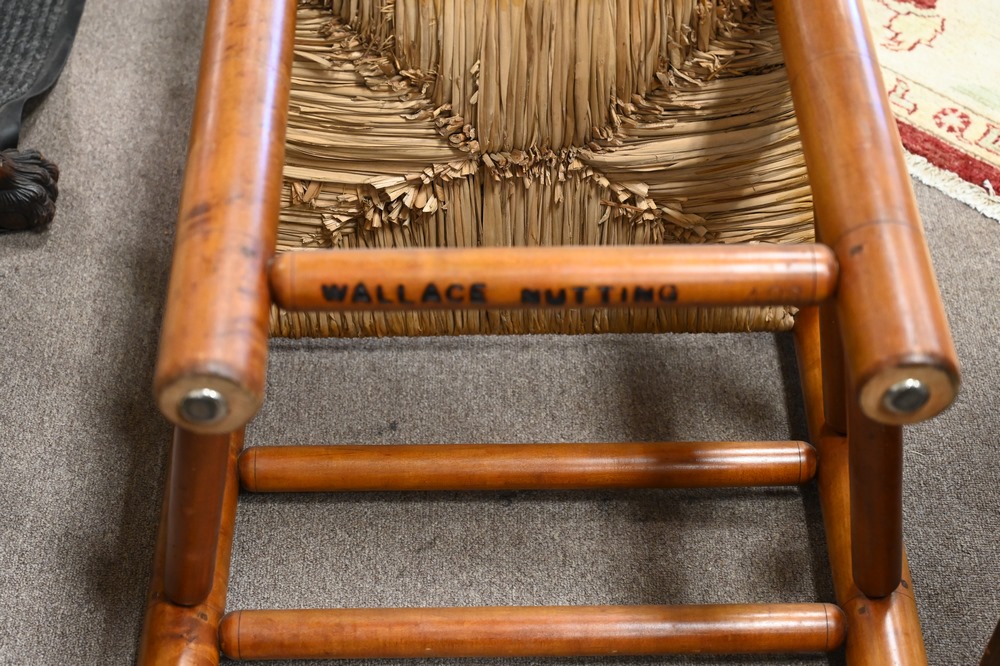 Lot 513: Wallace Nutting (Carver) Armchair, having three slats and rush seat, signed in block letters, height 47 inches.