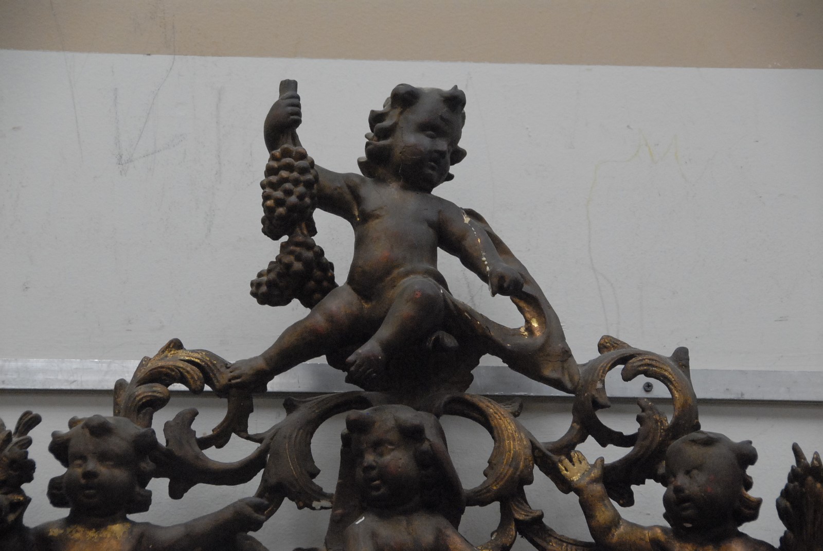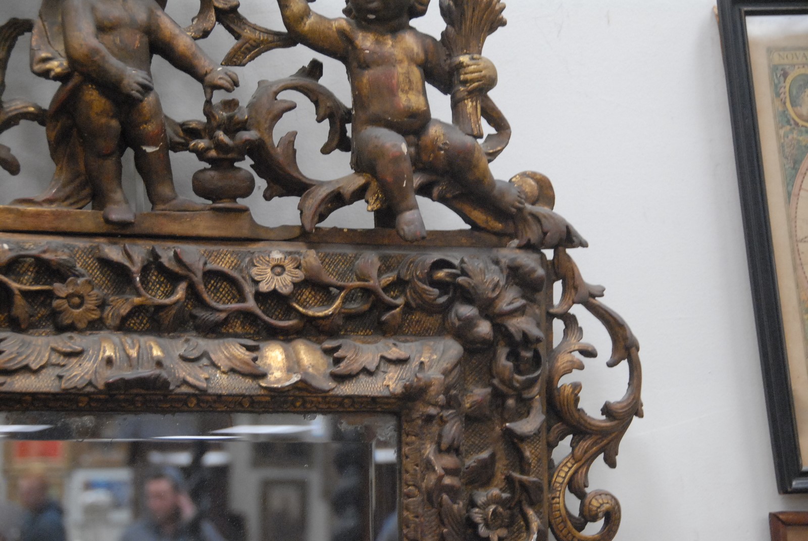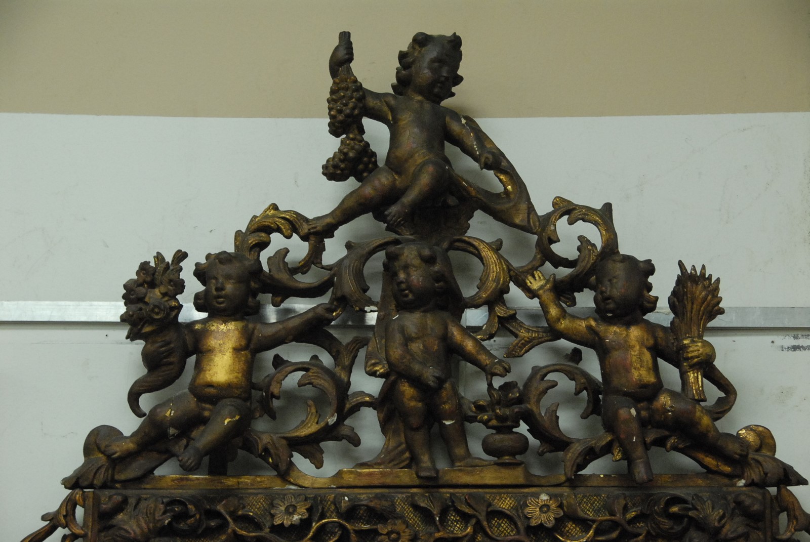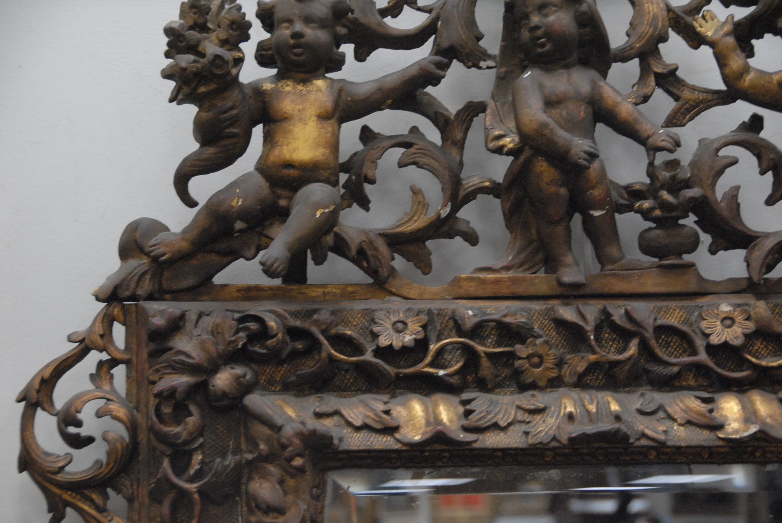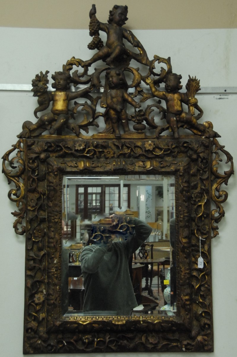 Lot 514: Continental Baroque gilt gesso and carved wood mirror surmounted by four putti, the frame with foliate decoration, 18th/19th century with later mirror plate. ht. 56in. wd. 38in.