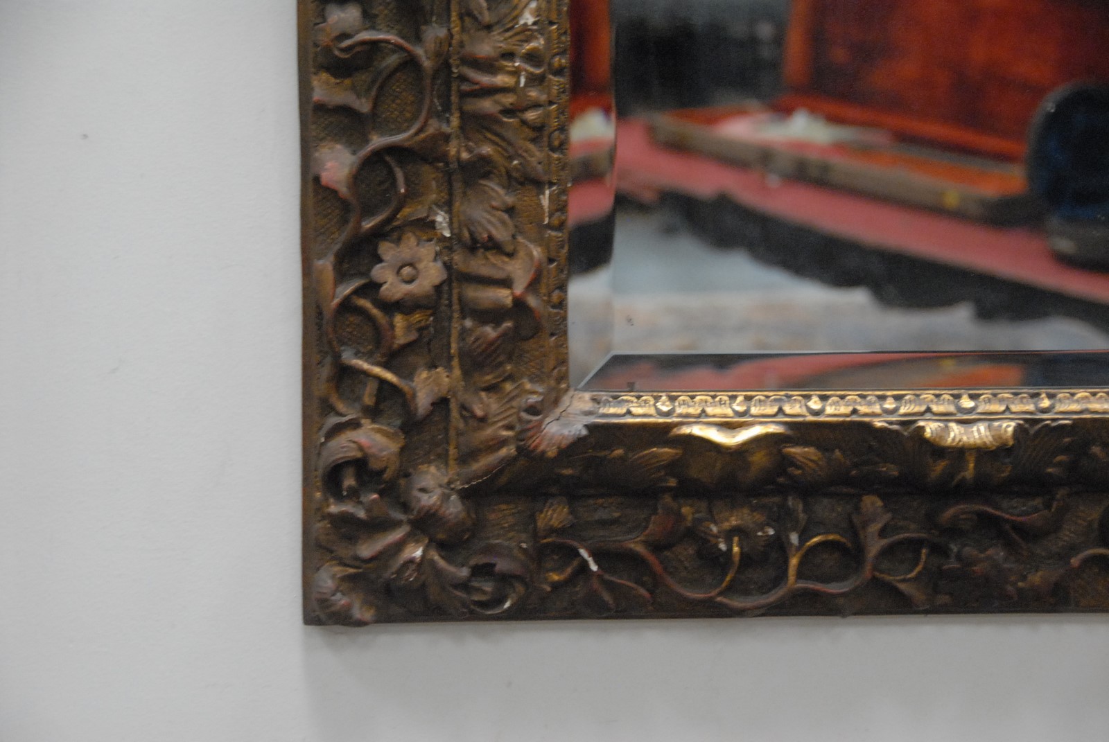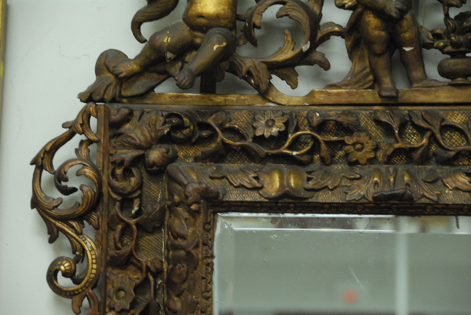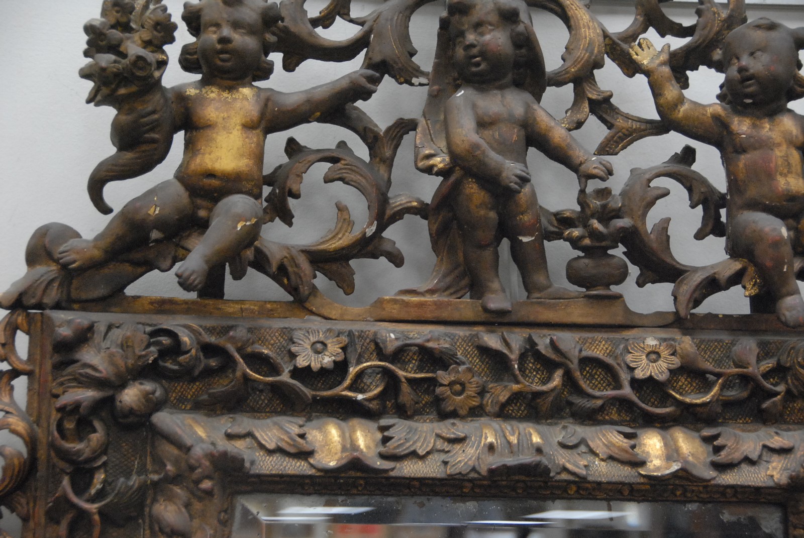 Continental Baroque gilt gesso and carved wood mirror surmounted by four putti, the frame with foliate decoration, 18th/19th century with later mirror plate. ht. 56in. wd. 38in.