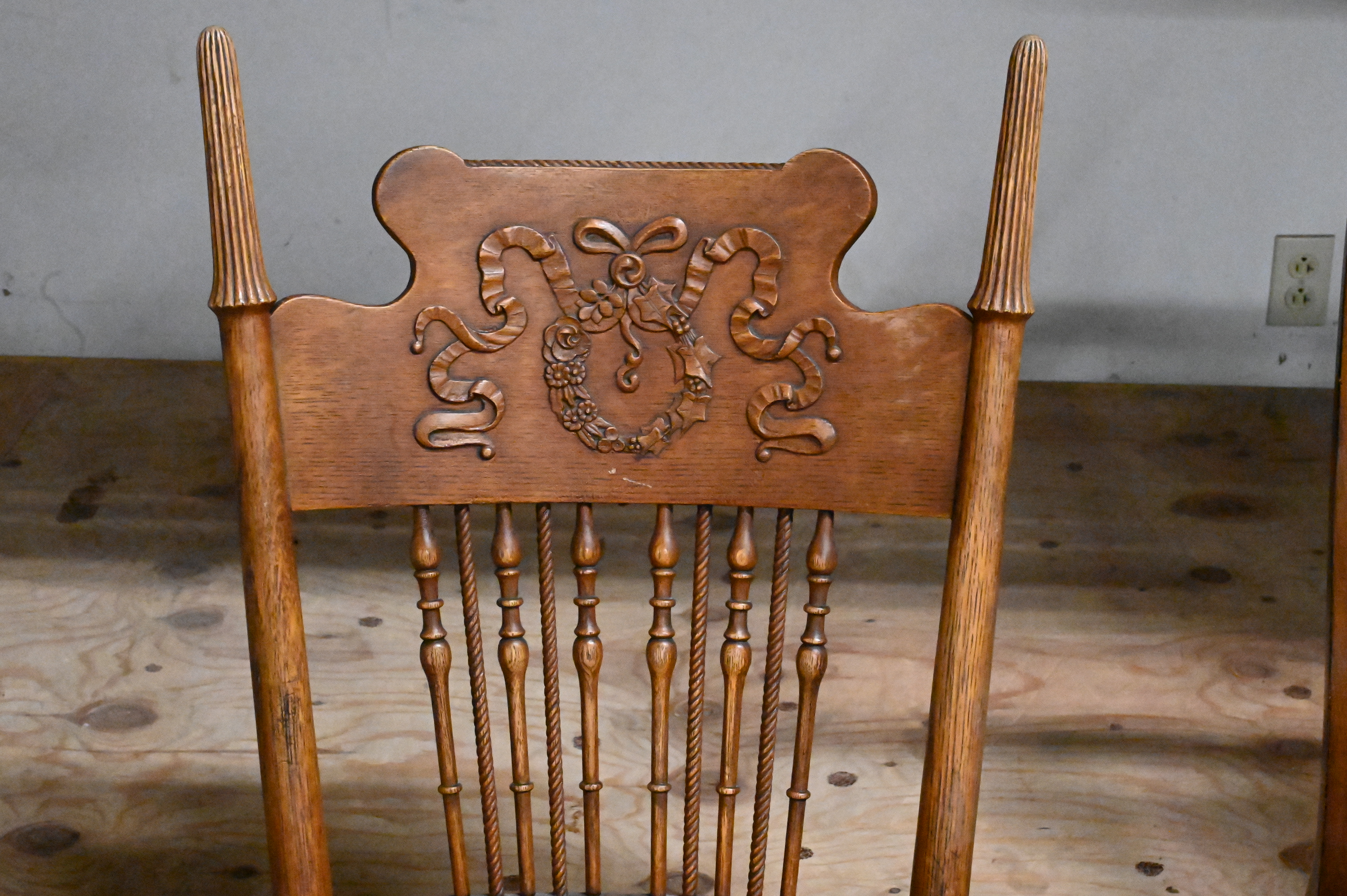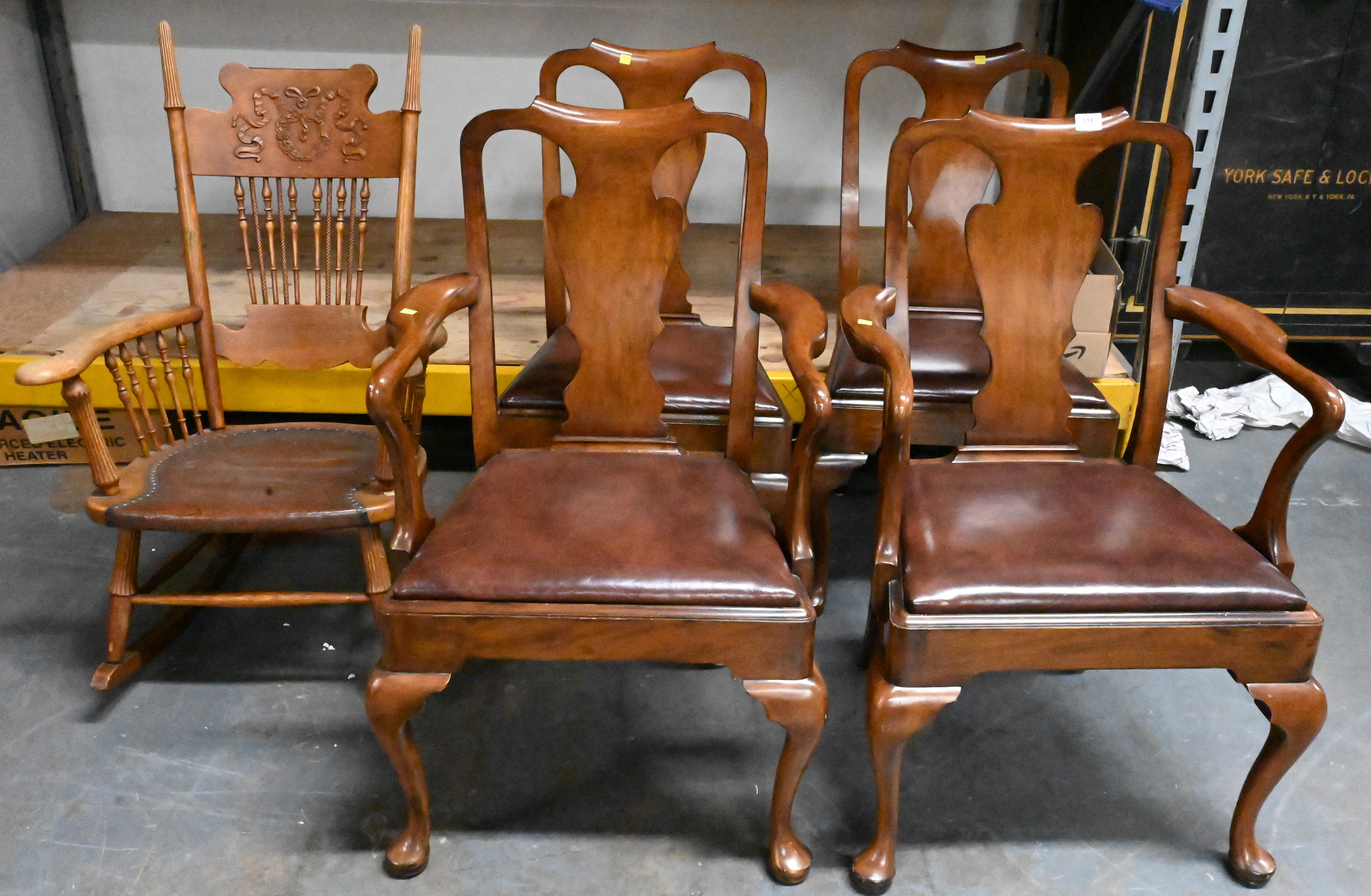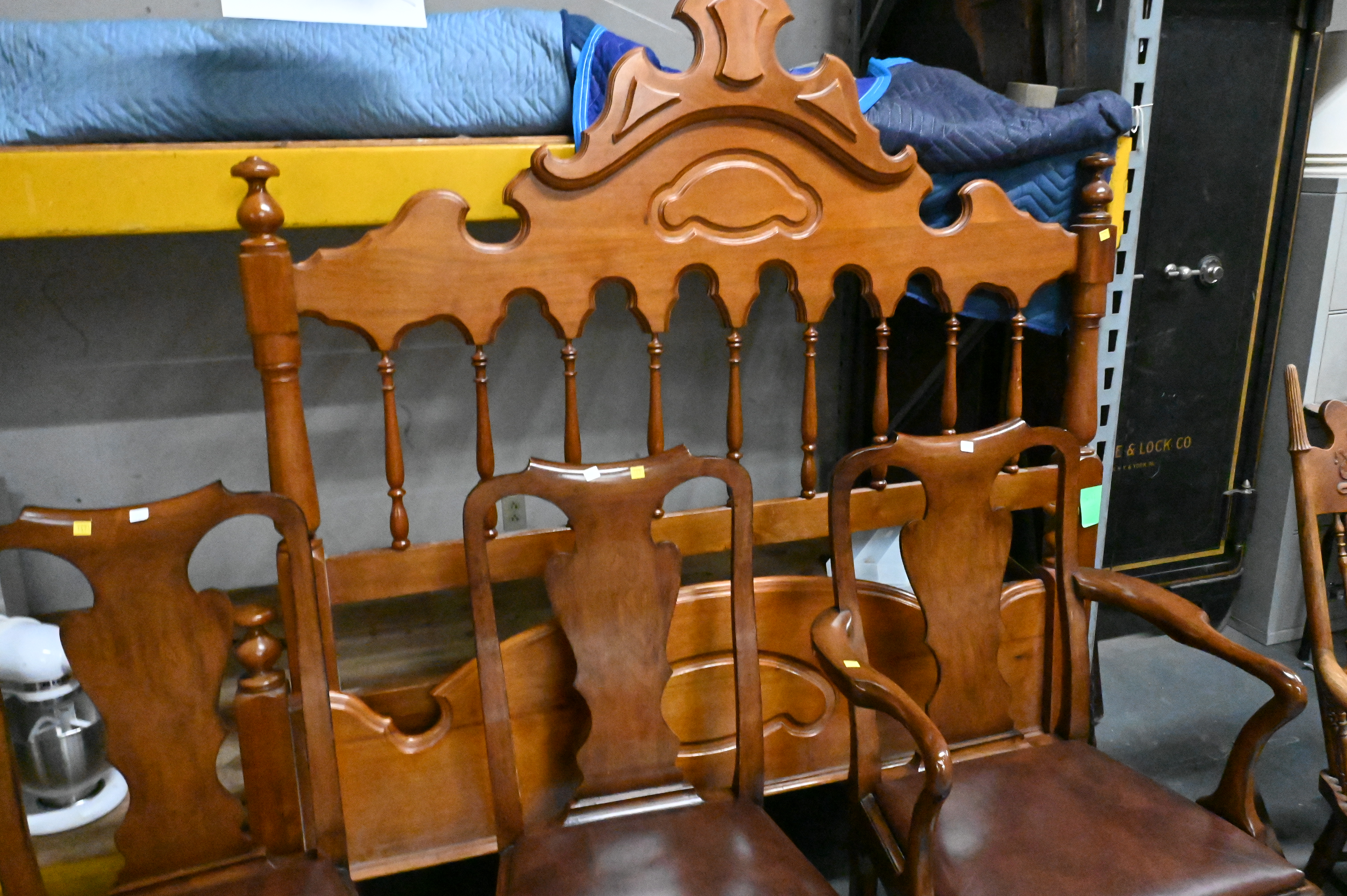 Ten Piece Group of Furniture, to include a set of four chairs, oak rocking chair, tiger maple drop leaf, chase and stool, height 39 inches; along with a full size maple bed and tufted ottoman.