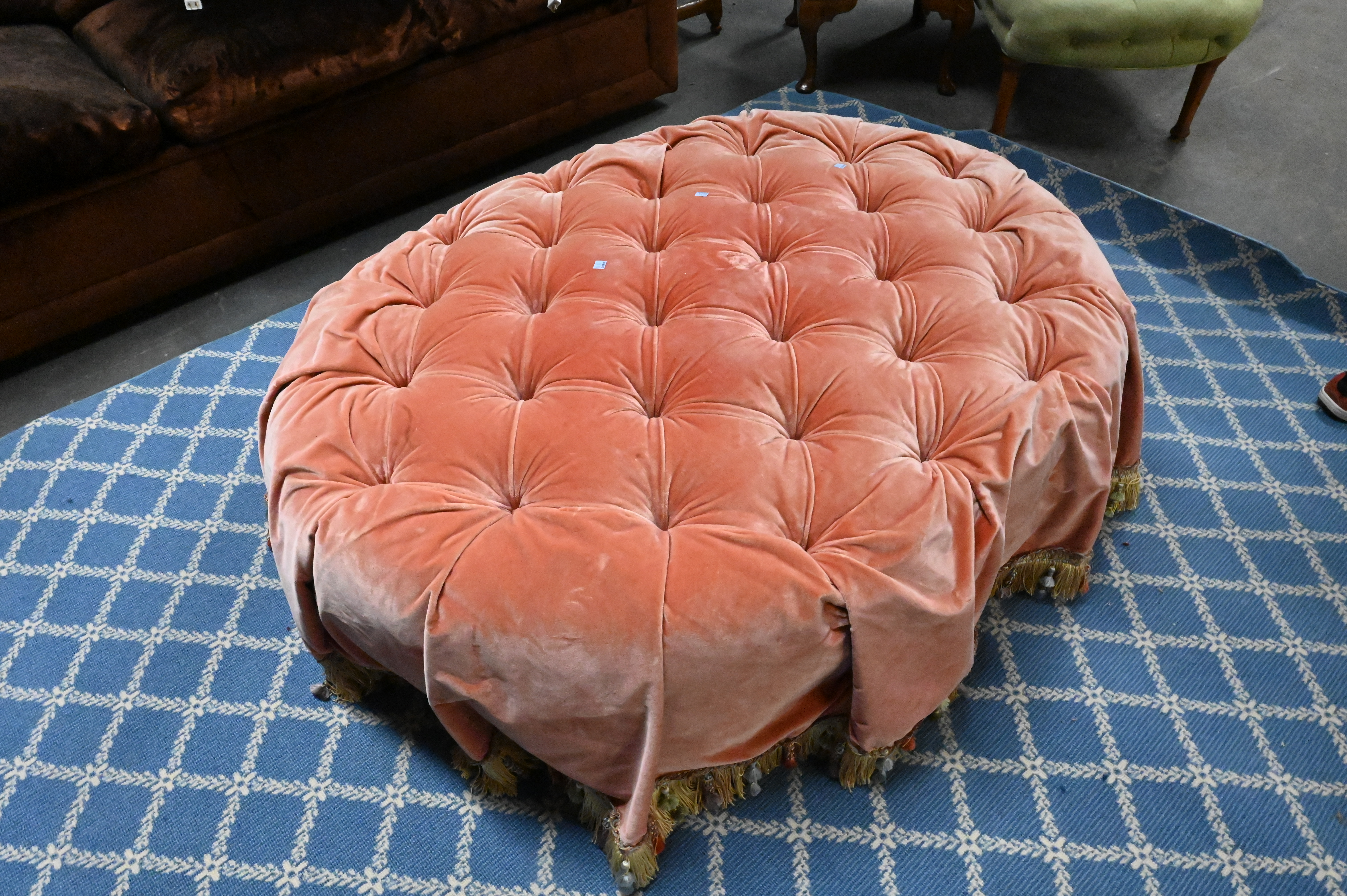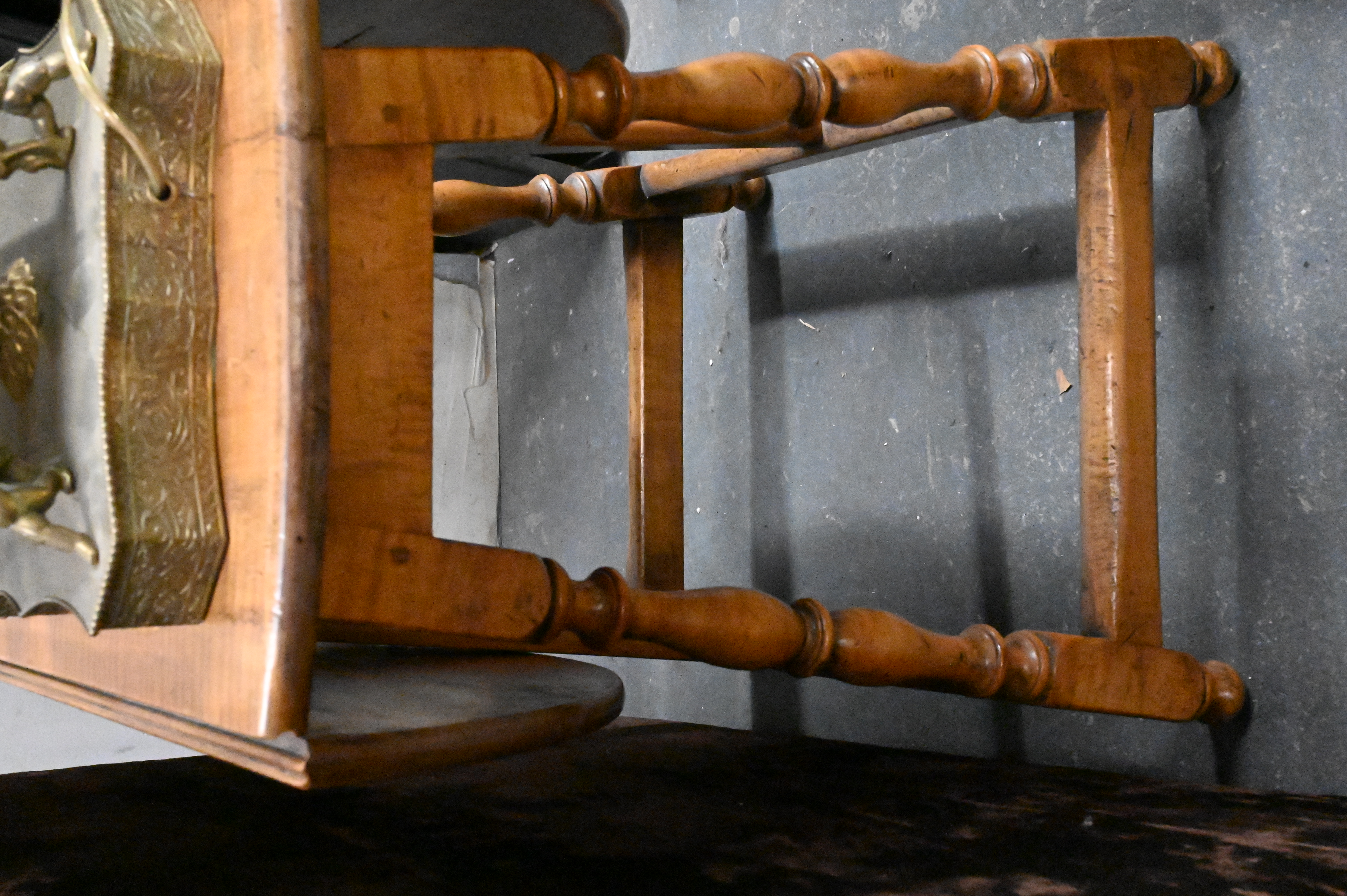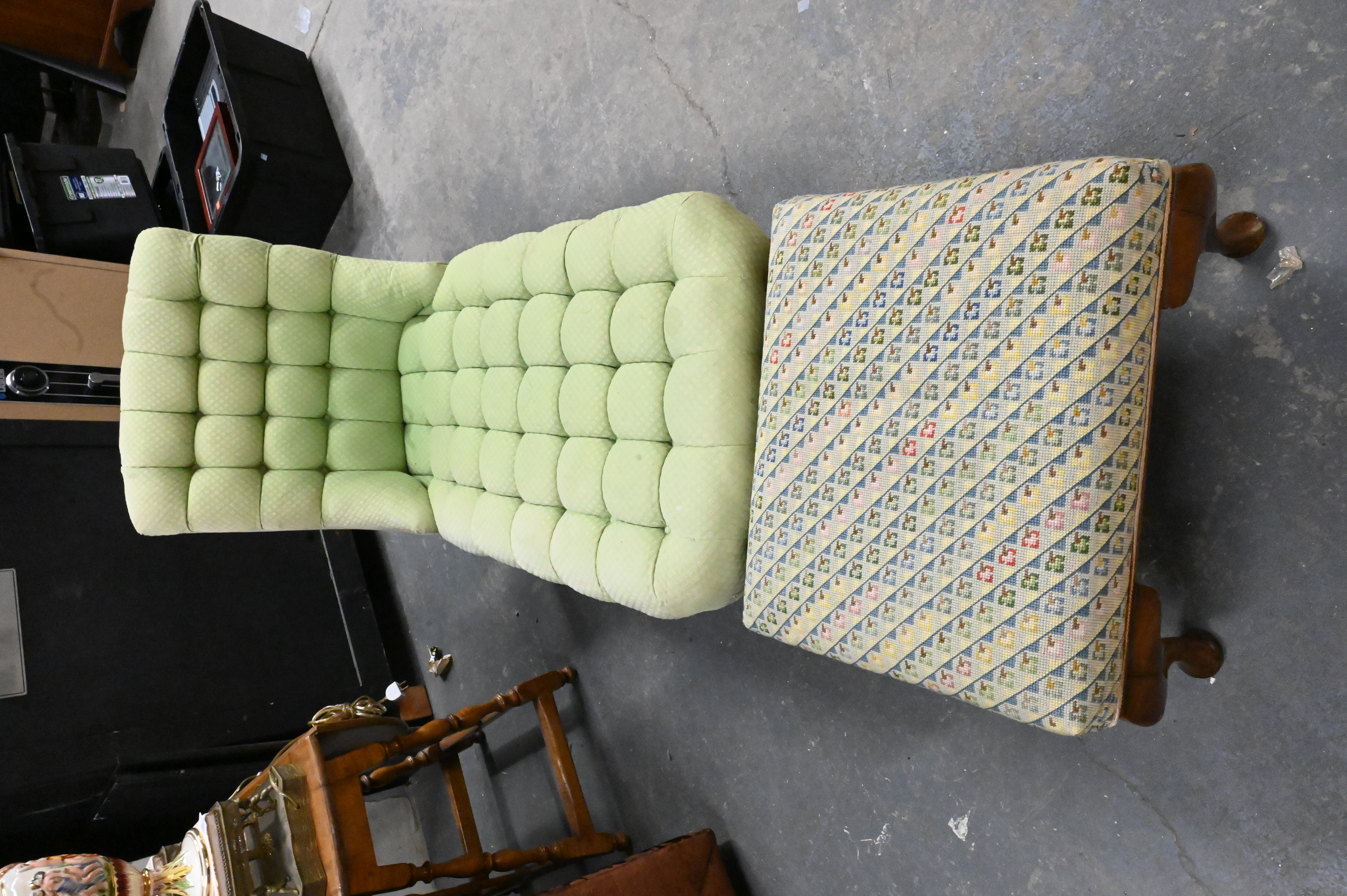 Ten Piece Group of Furniture, to include a set of four chairs, oak rocking chair, tiger maple drop leaf, chase and stool, height 39 inches; along with a full size maple bed and tufted ottoman.