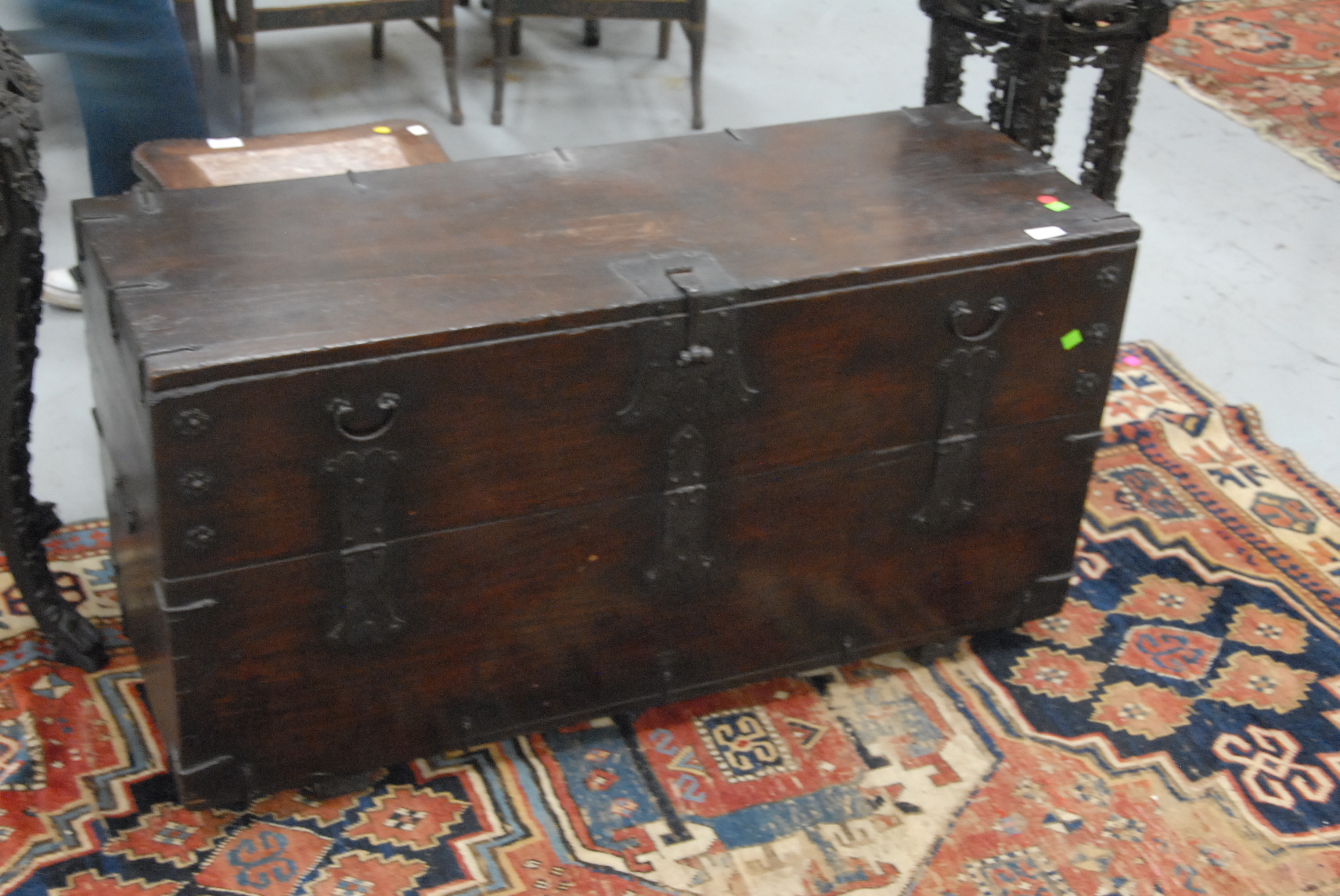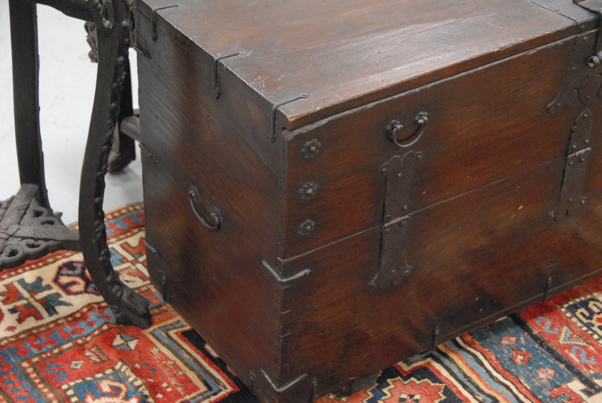 Lot 514: Large low hardwood chest Bandaji with iron hardware, single compartment with front-opening hinged panel, walnut or possibly zelkova wood, Korea, Joseon Dynasty, 19th century or older. ht. 21in. lg. 42 1/2in. wd. 16in.