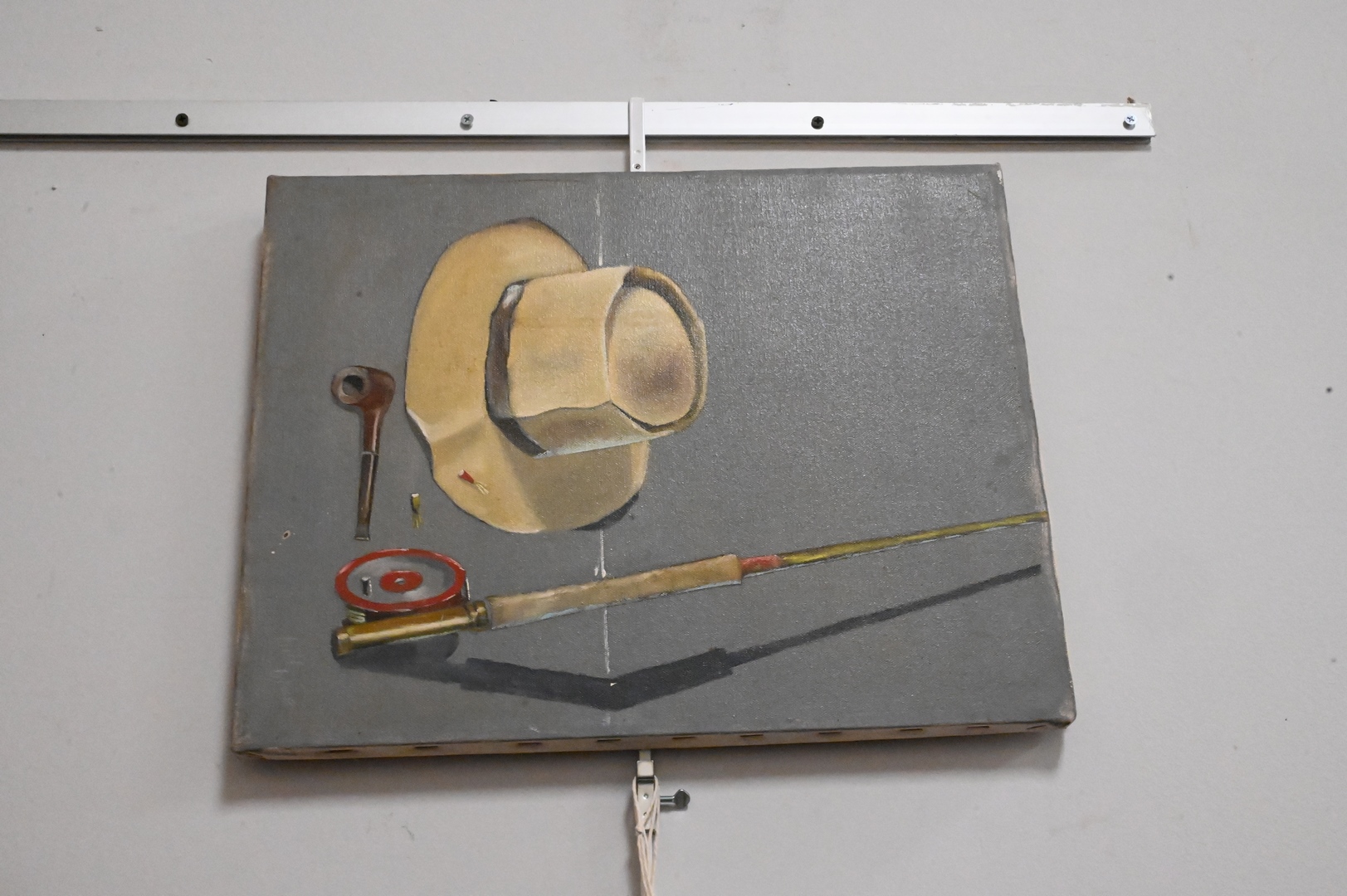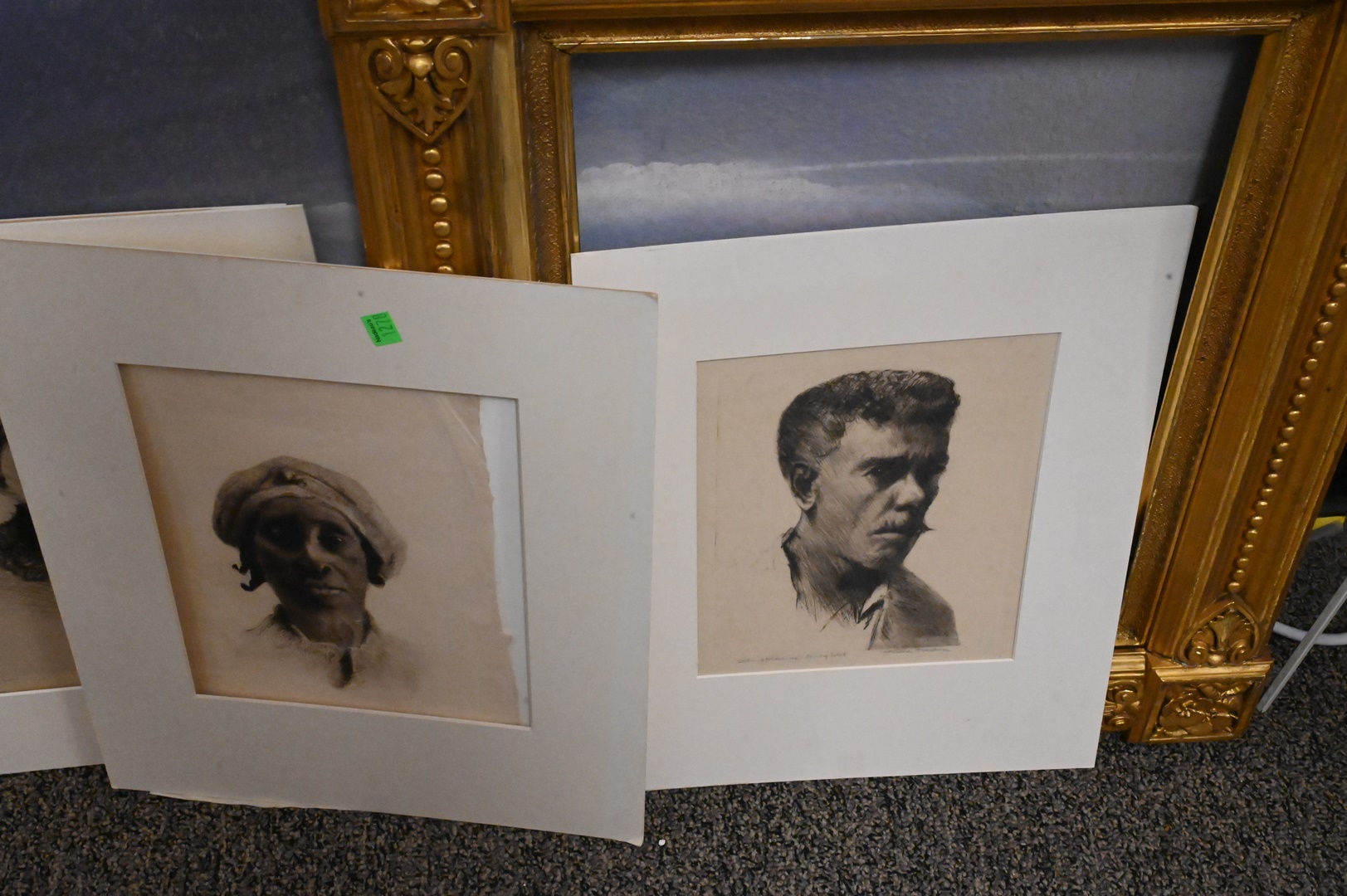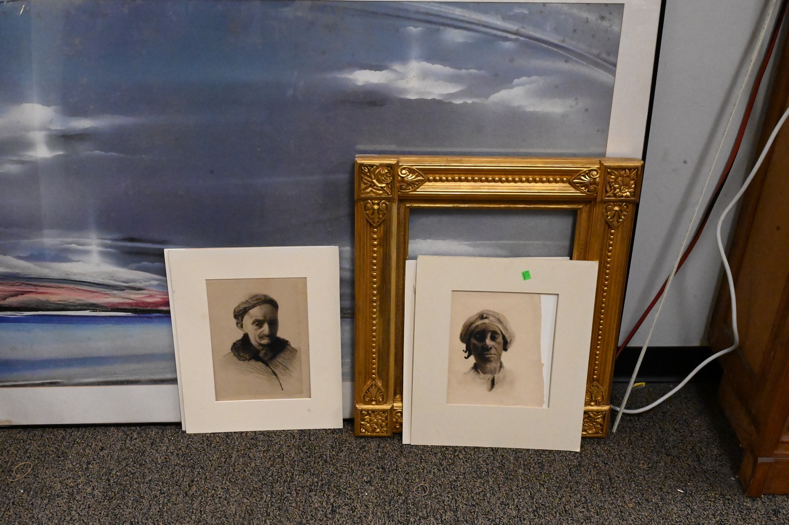 Nine Piece Art Lot, to include 3 Cadwallader Lincoln Washburn etchings, large 32 x 53 landscape as is, etching of ducks marked “F.W.B.19” signed lower left, watercolor on canvas painting of geese, oil on canvas painting still life, signed “Bill Blue”, etching of woman signed lower right “Etienne” along with a gilt frame. Provenance: Estate of Peter Tillou, Litchfield, Connecticut.