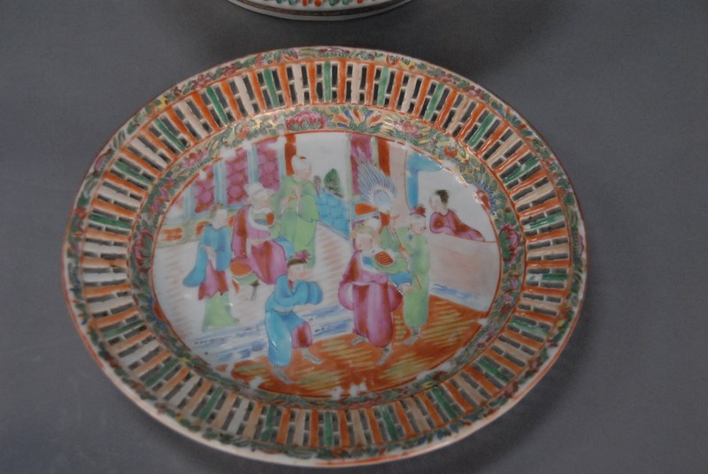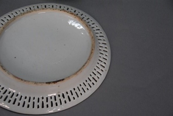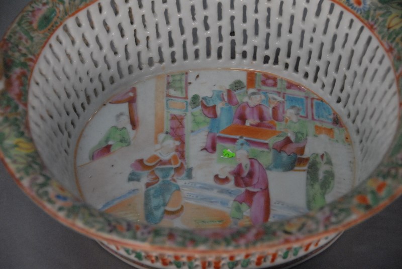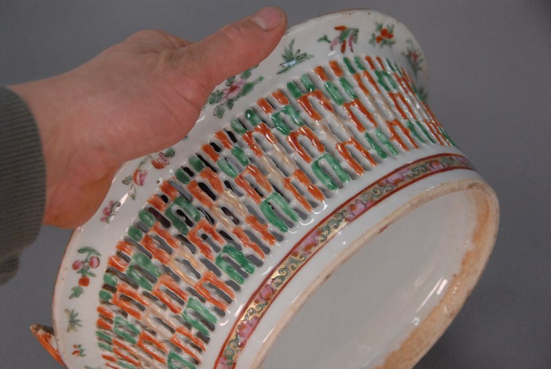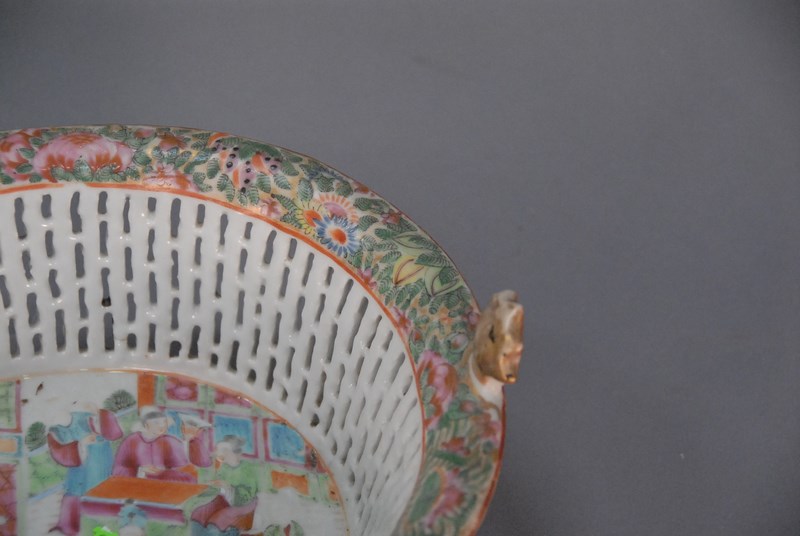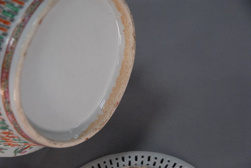 Lot 514: Rose Famille reticulated oval basket and under plate. basket 9 1/2 x 10 3/4 ht. with handle 5 1/4in.