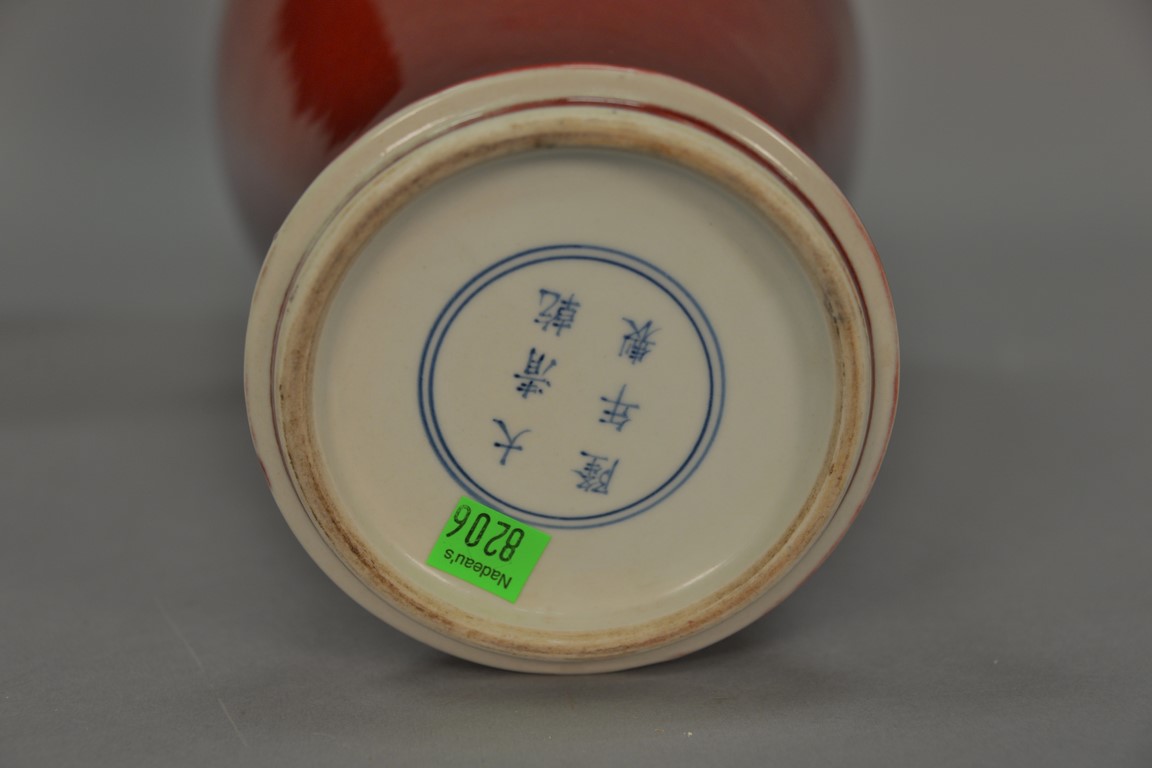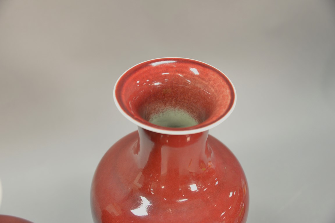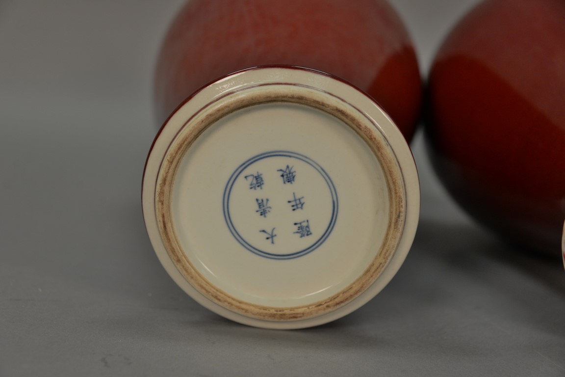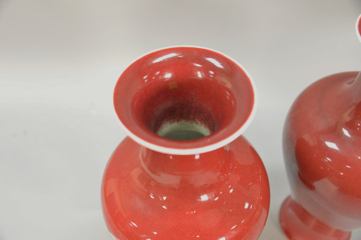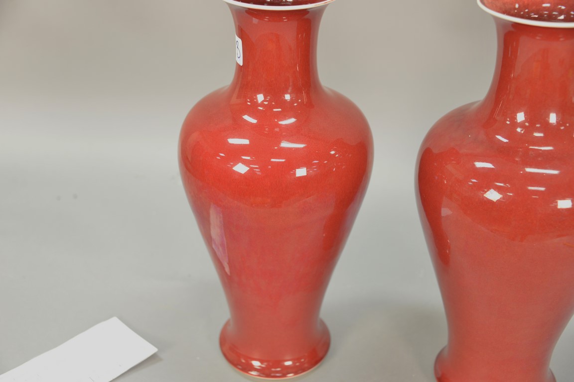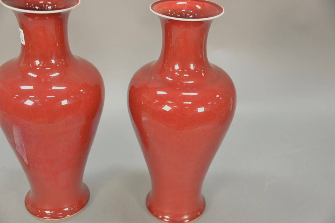 Lot 514B: Pair of Chinese Sang de Boeuf porcelain vases in baluster form with flared white top rim, marked on bottom. ht. 17in.