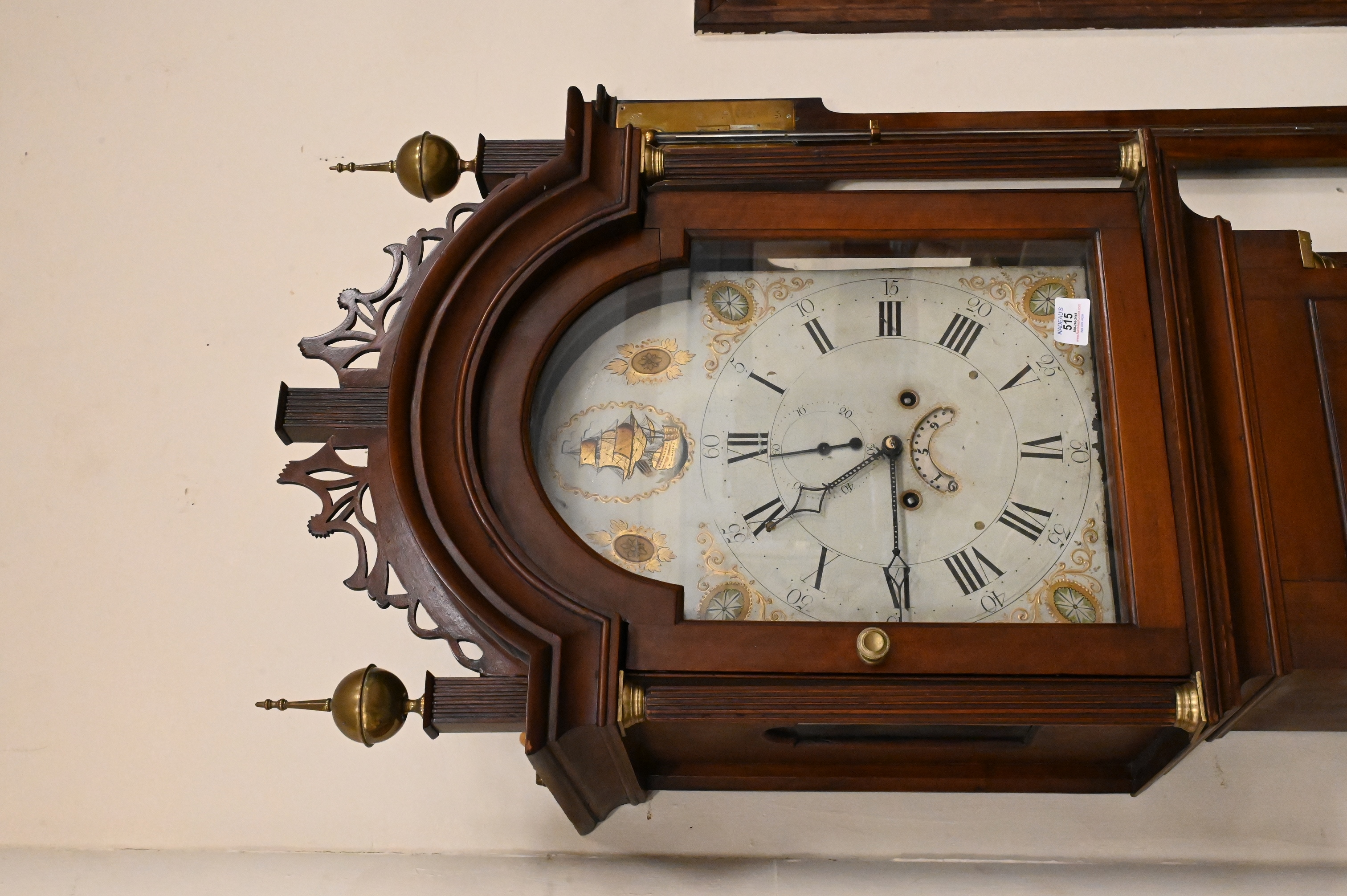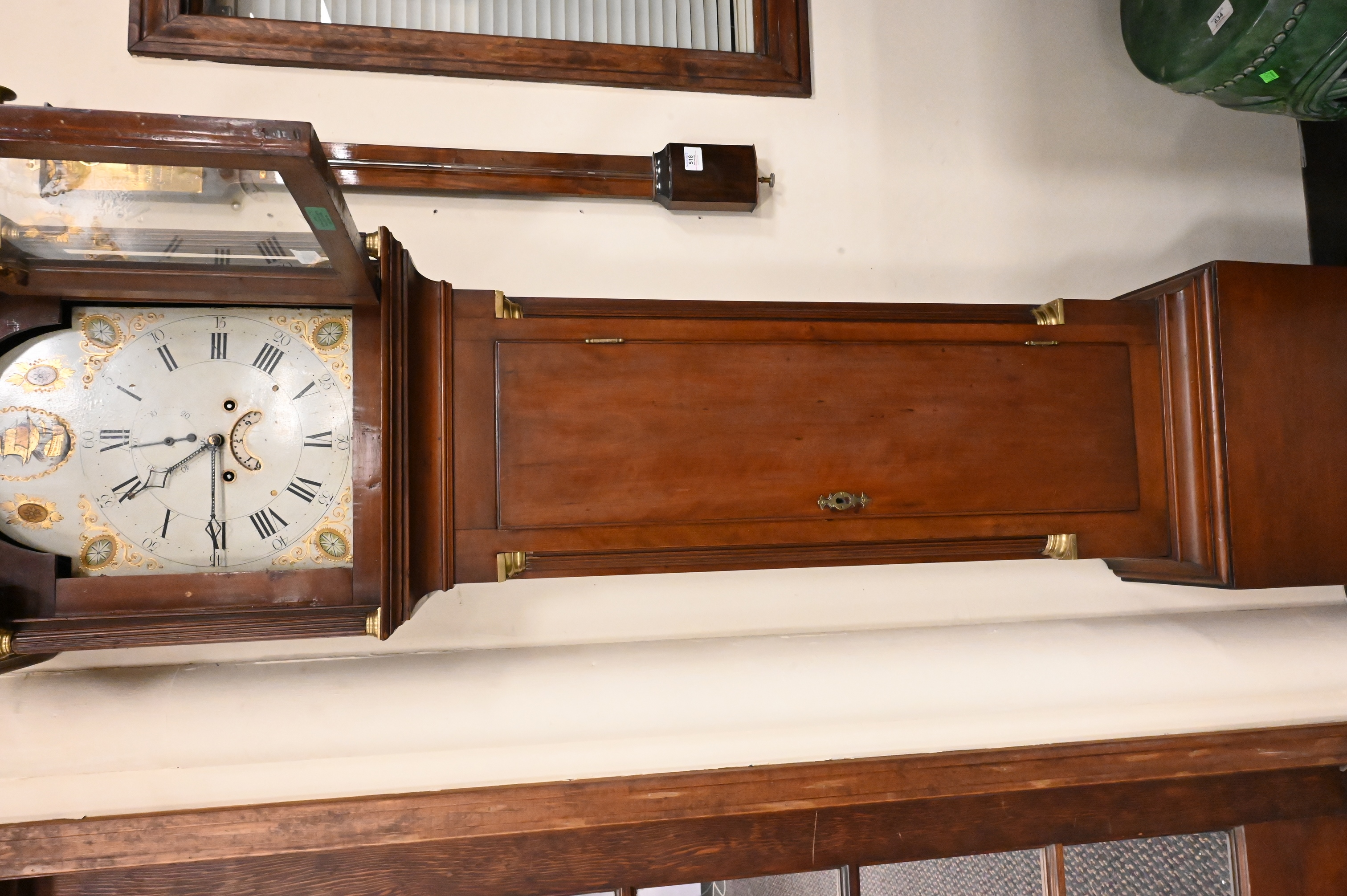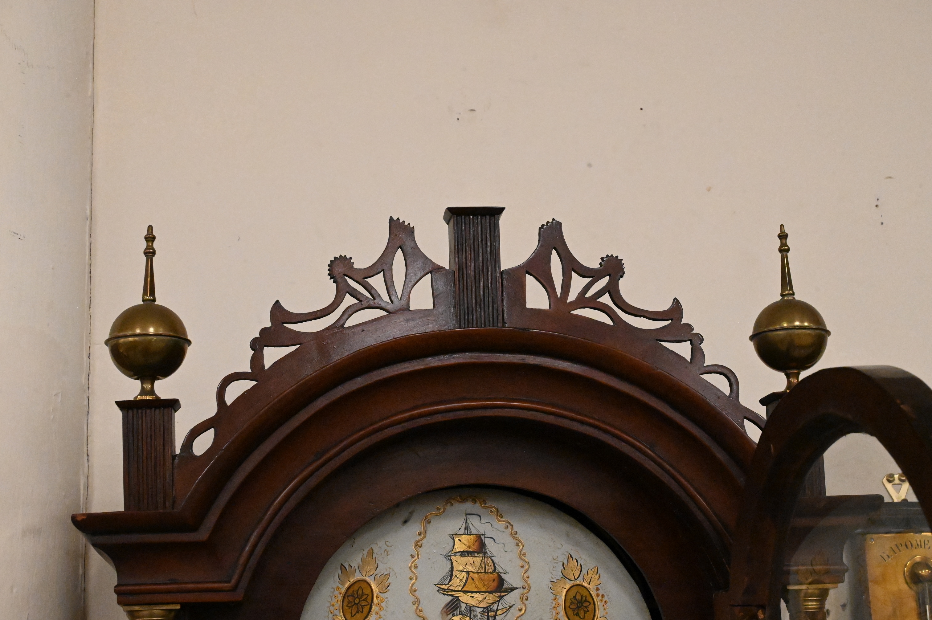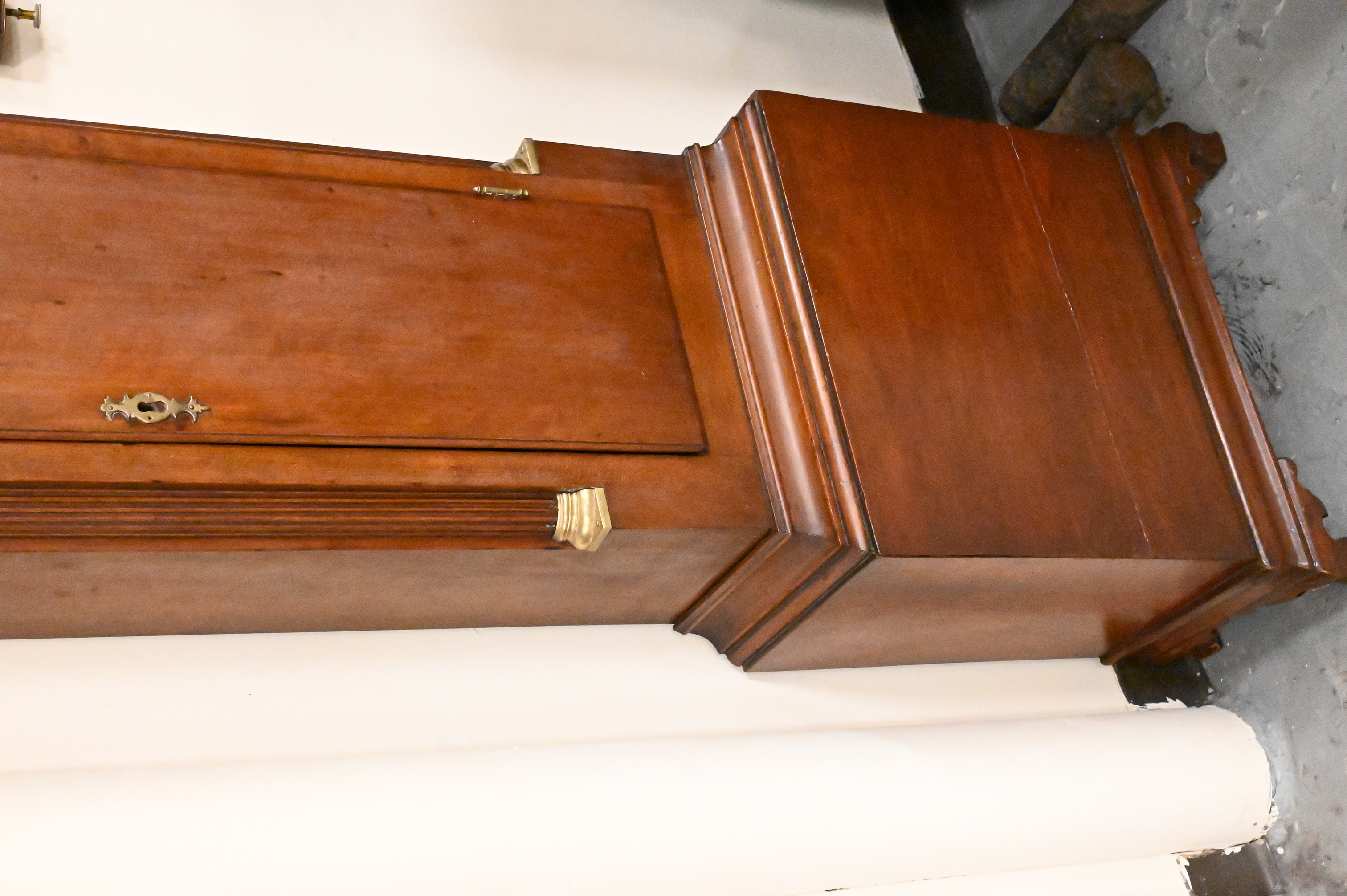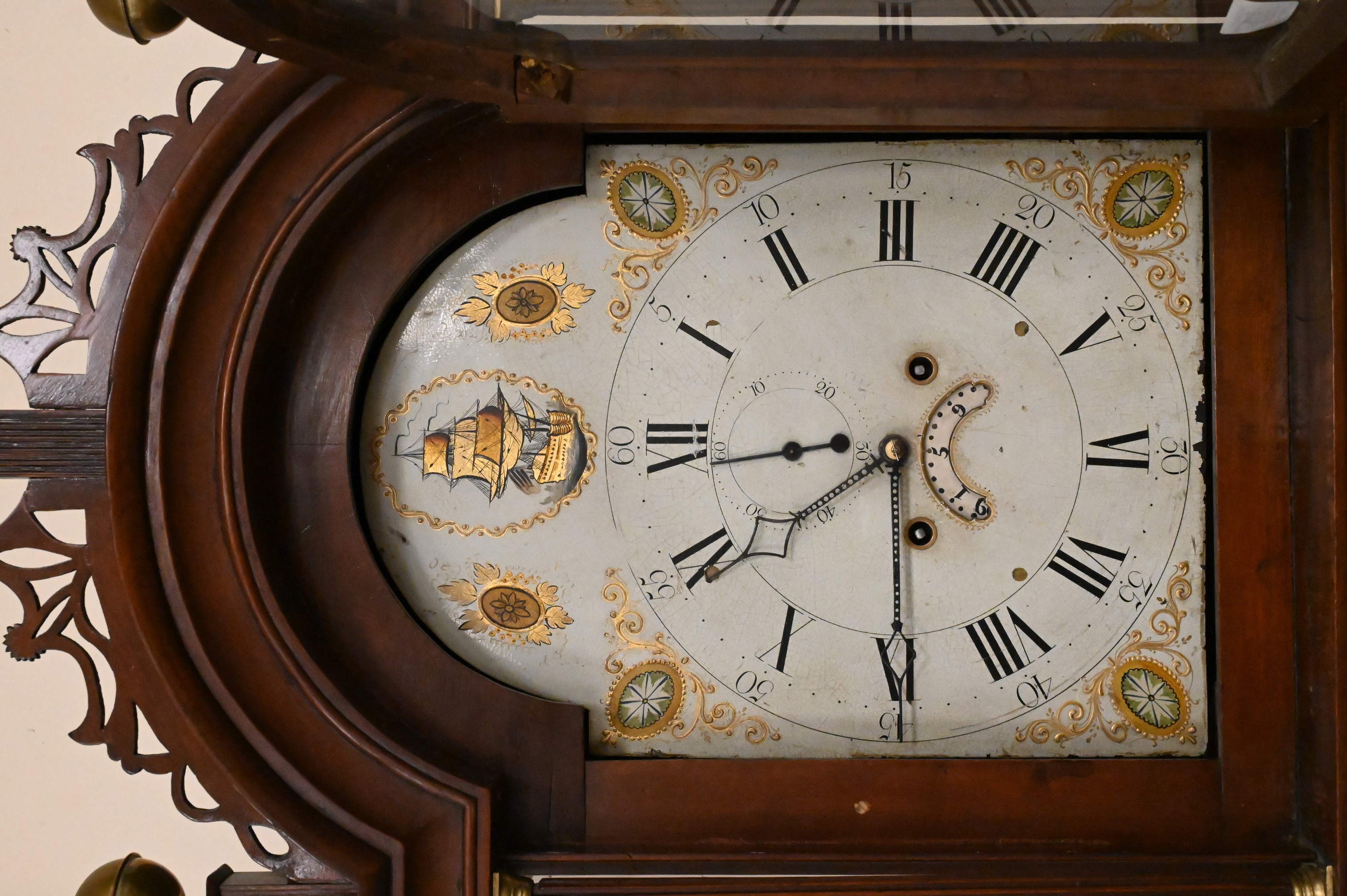 having openwork fretwork over tombstone door flanked by fluted columns, over waist door, flanked by fluted columns all set on ogee feet, metal dial with second hand, calendar, and brass works, American circa 1780