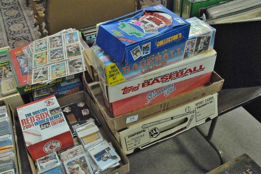 Collection of baseball, football, and hockey cards from 1950’s – 1990’s, factory unopened sets, sealed packs, Topps, Donruss, Upper Deck, etc including Joe Montana, Michael Jordan, Rickey Henderson, etc.