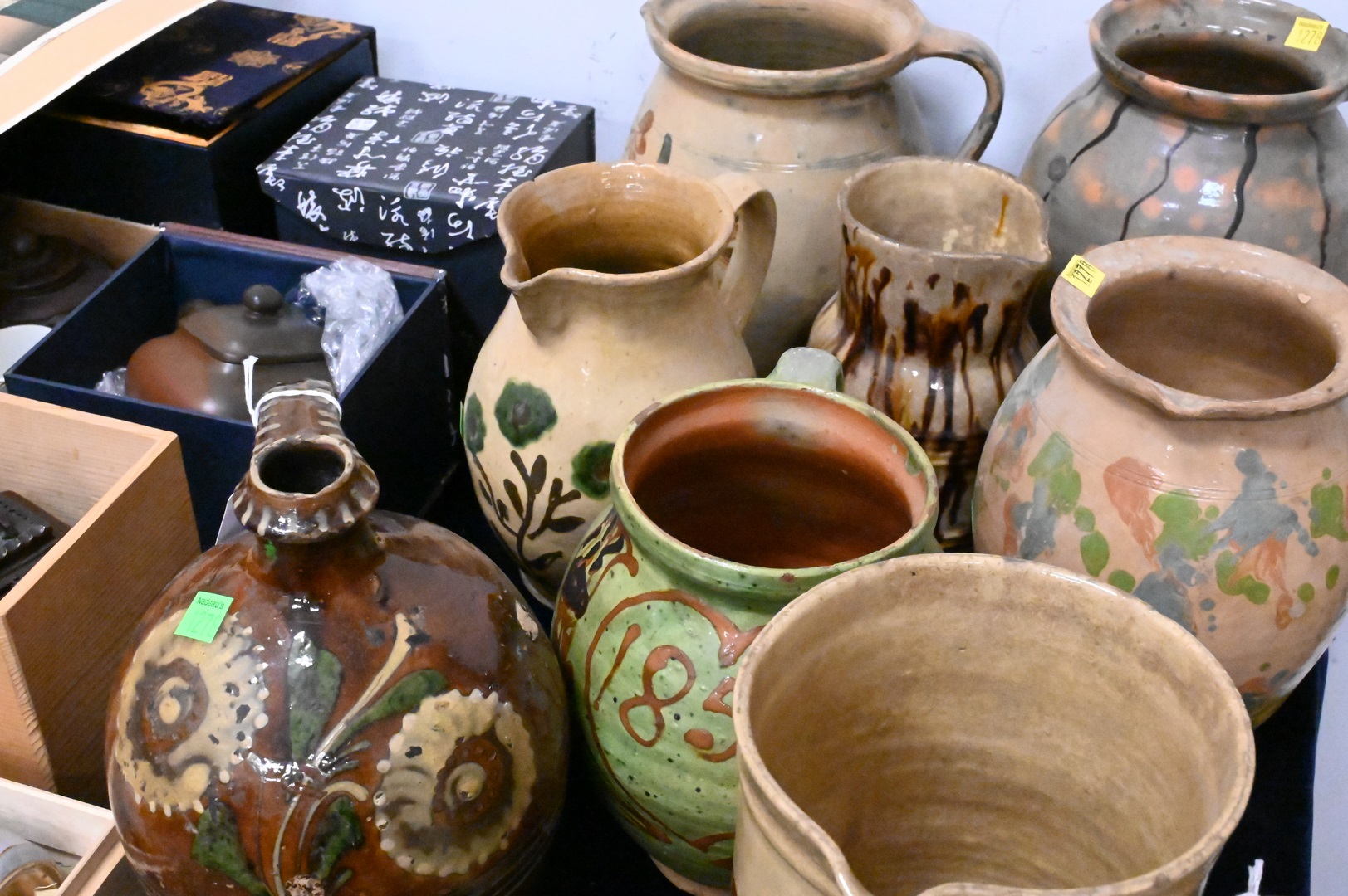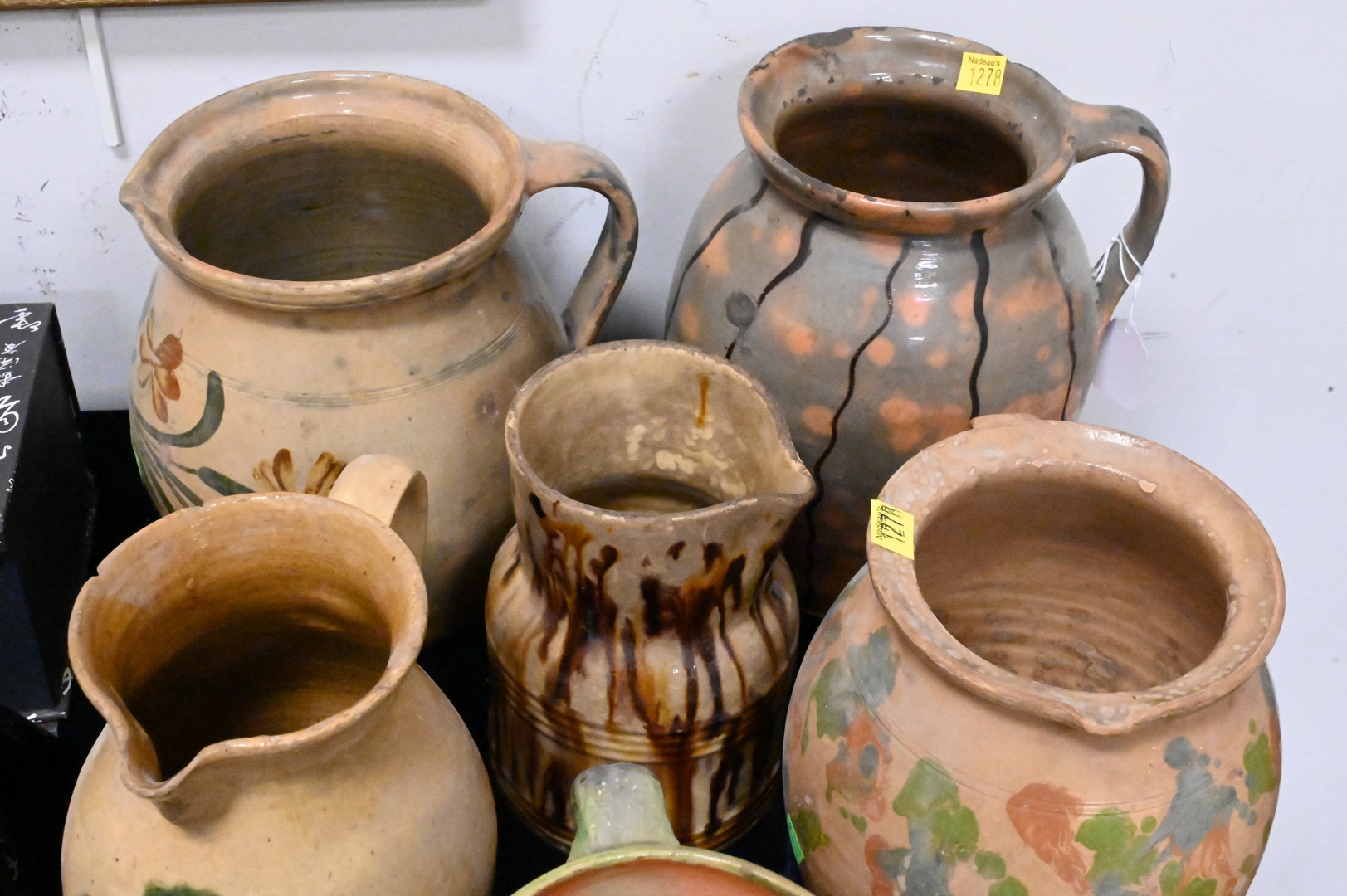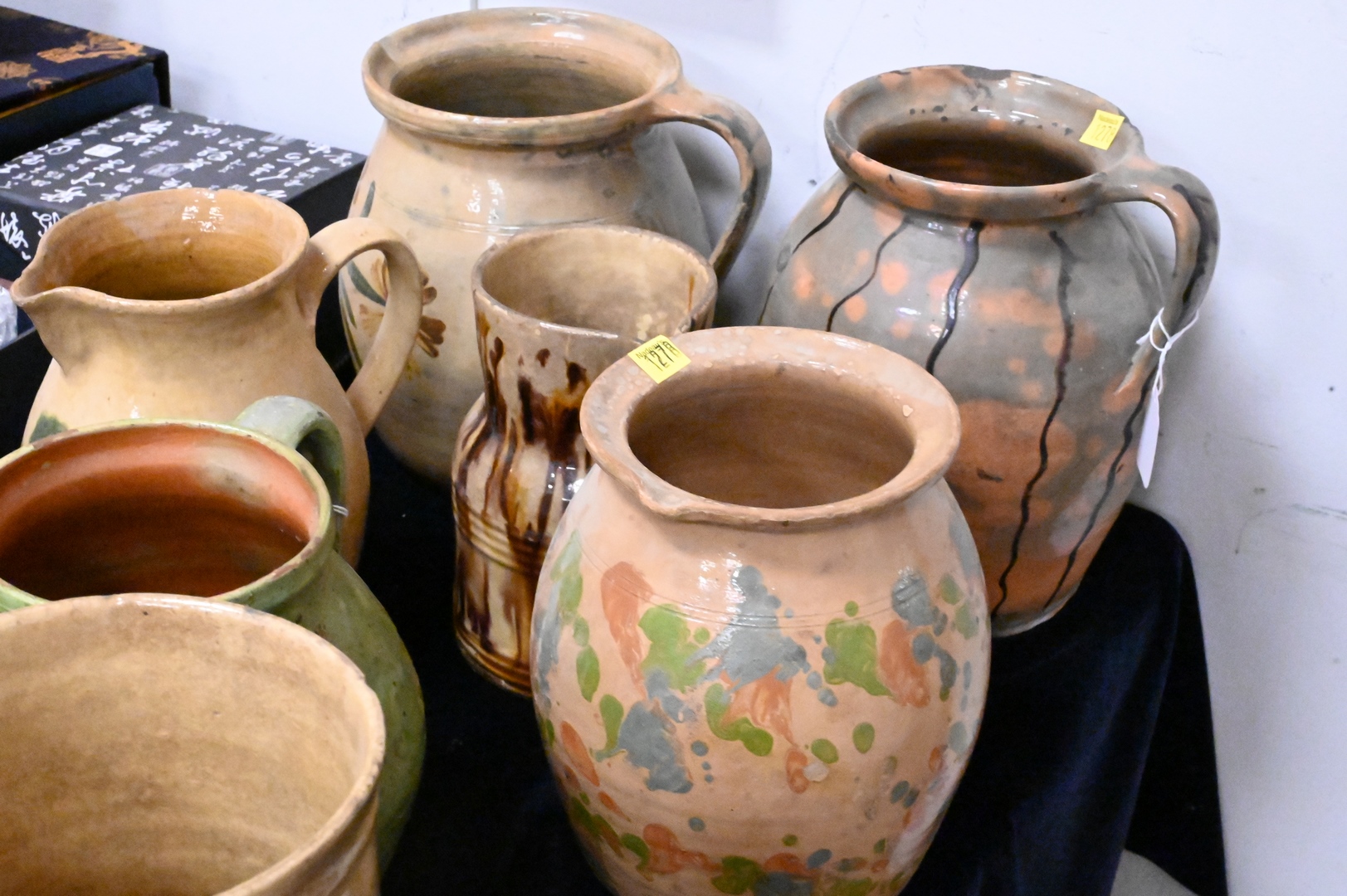Eight Pottery and Stoneware Pitchers, brown glazed with flowers, brown and green glazed, worm glazed, etc., tallest 10 inches. Provenance: Estate of Peter Tillou, Litchfield, Connecticut.