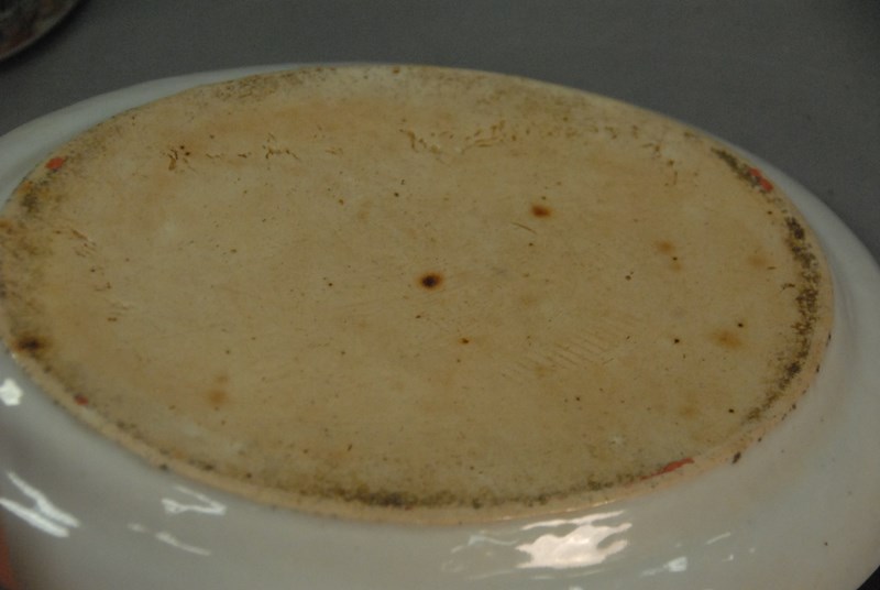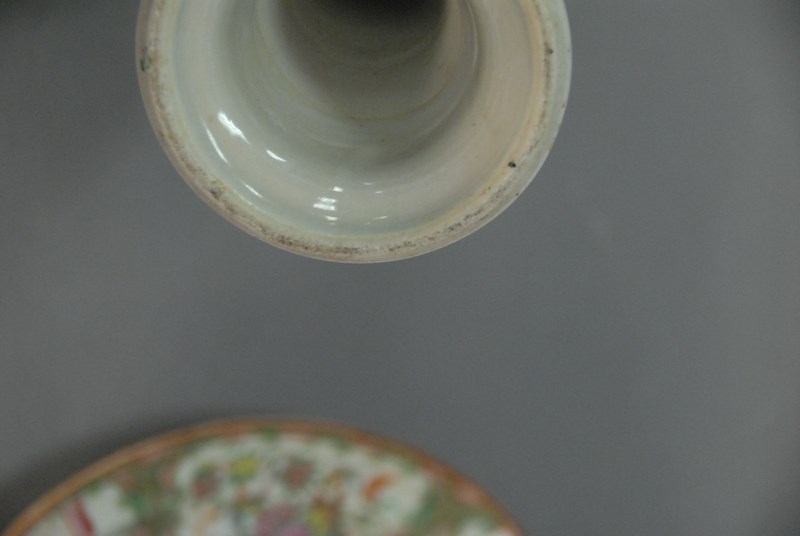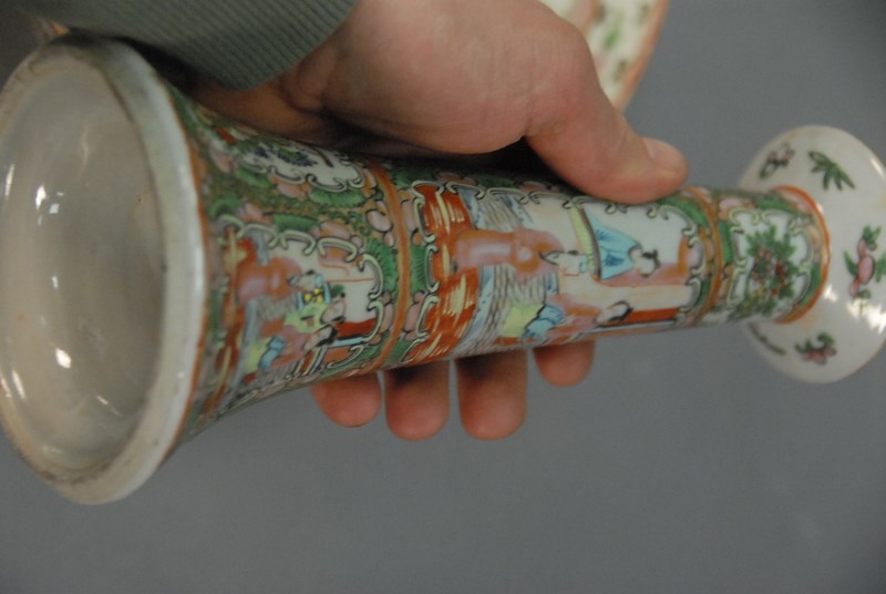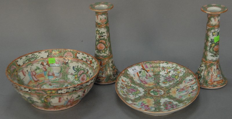 Four piece lot of Rose Famille including pair of candlesticks, bowl, and platter. candlesticks: ht. 9 1/2in. bowl: dia. 10 1/4in. platter: 9 1/2 x 12 1/2