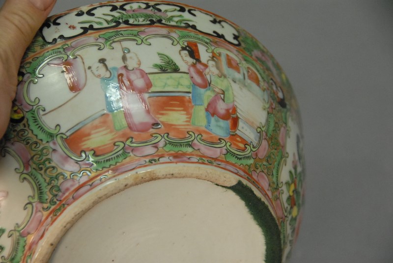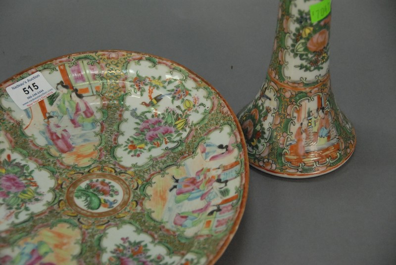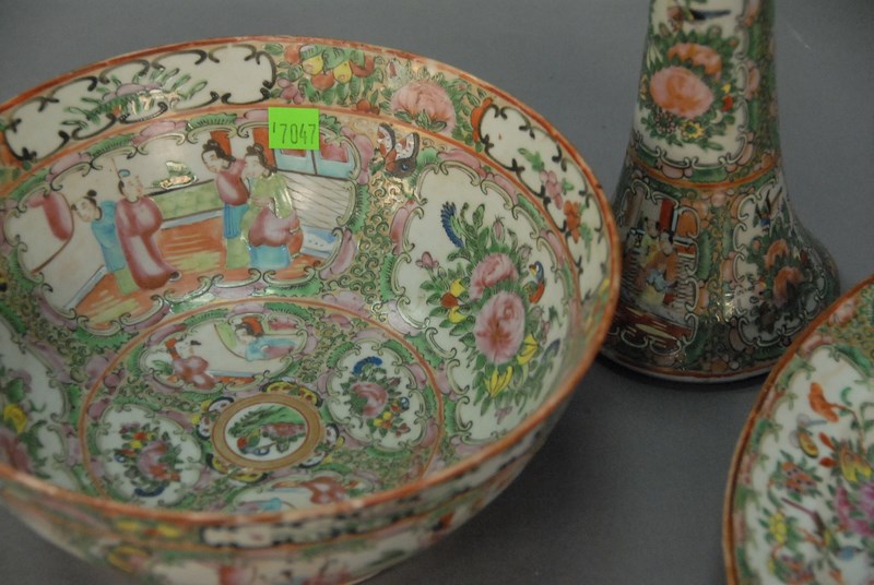 Lot 515: Four piece lot of Rose Famille including pair of candlesticks, bowl, and platter. candlesticks: ht. 9 1/2in. bowl: dia. 10 1/4in. platter: 9 1/2 x 12 1/2