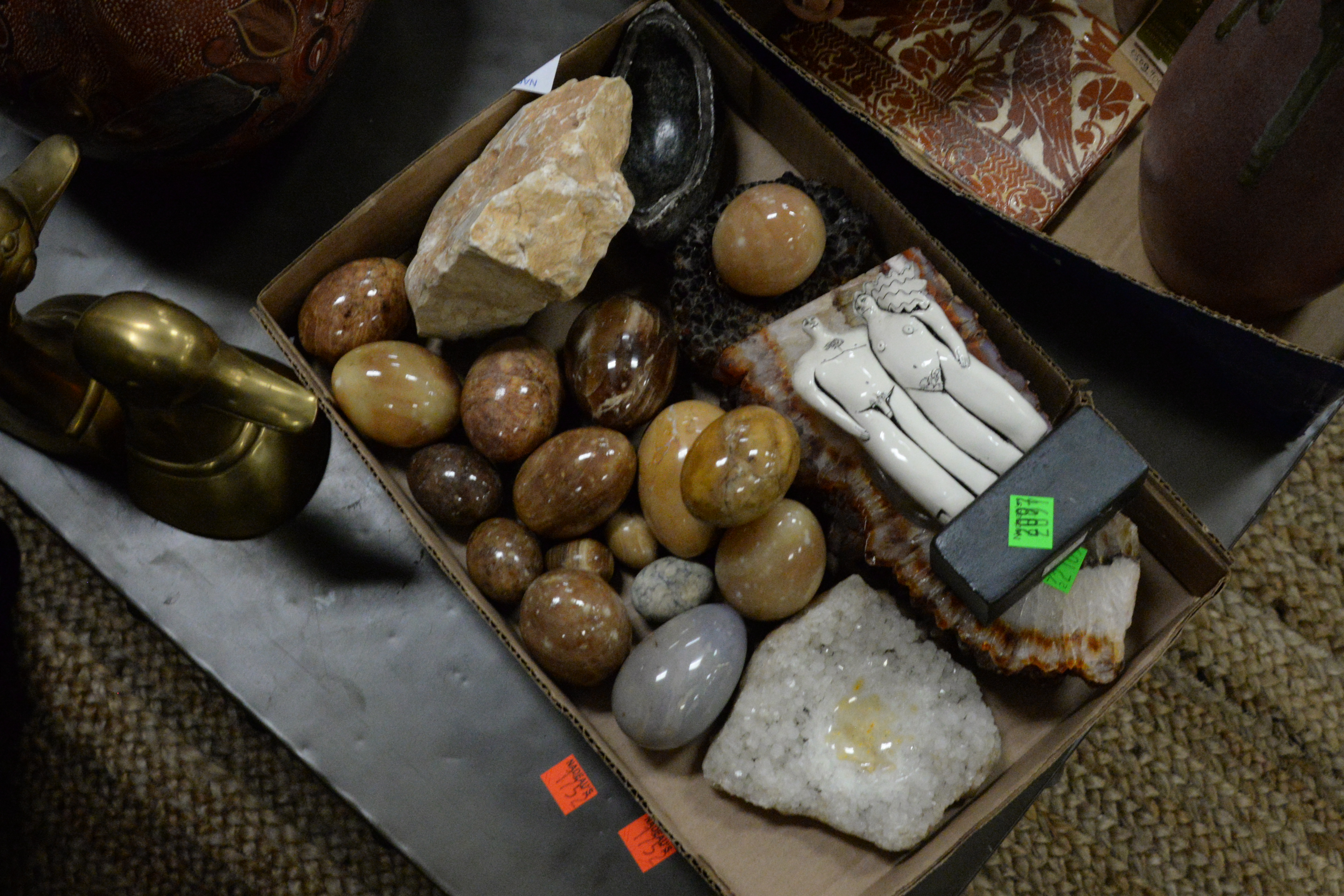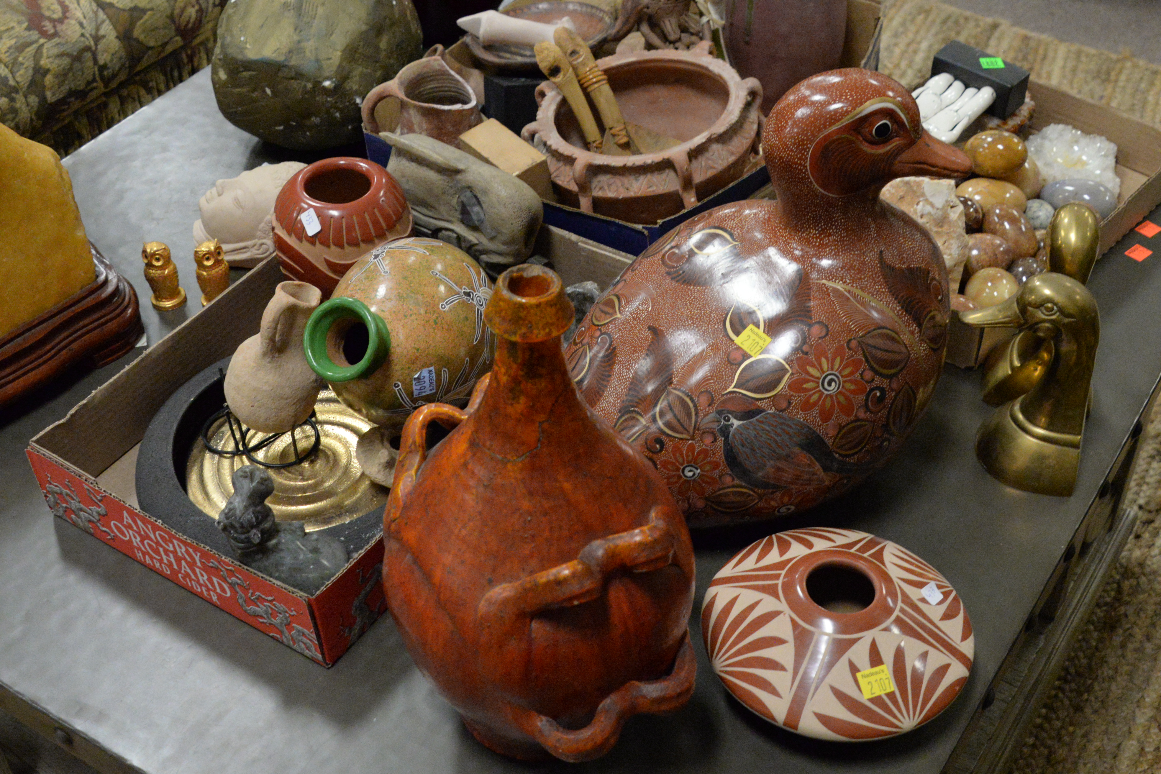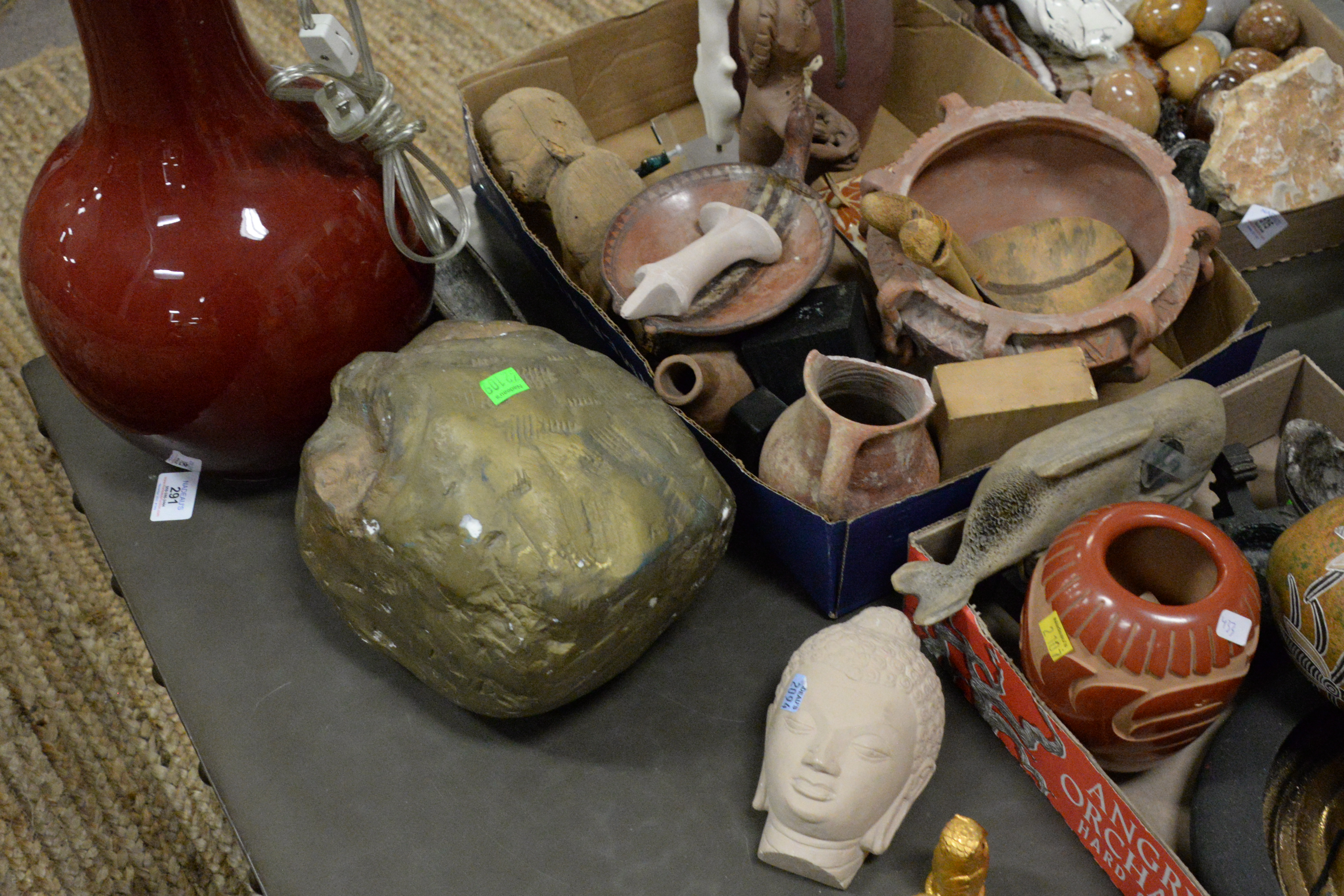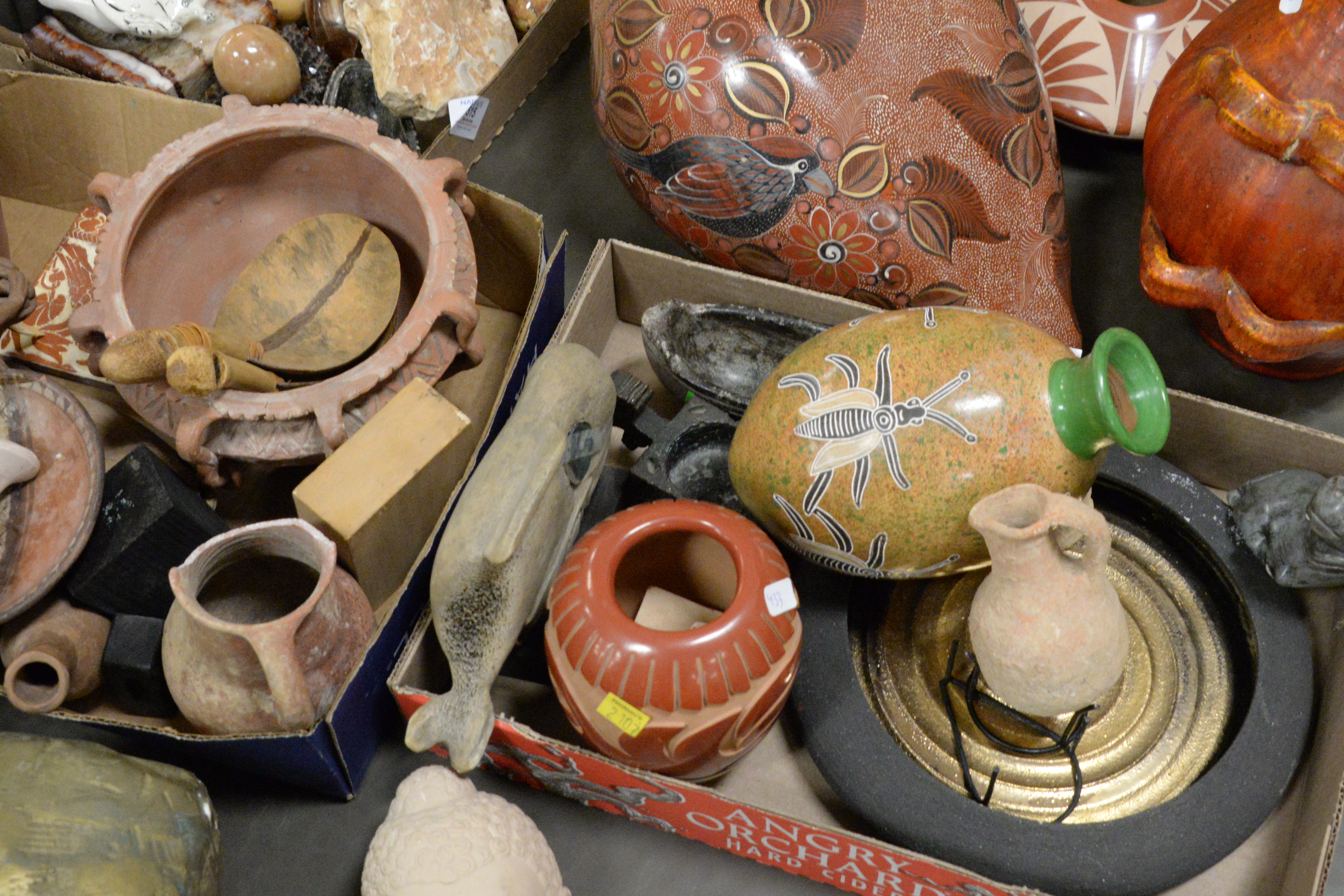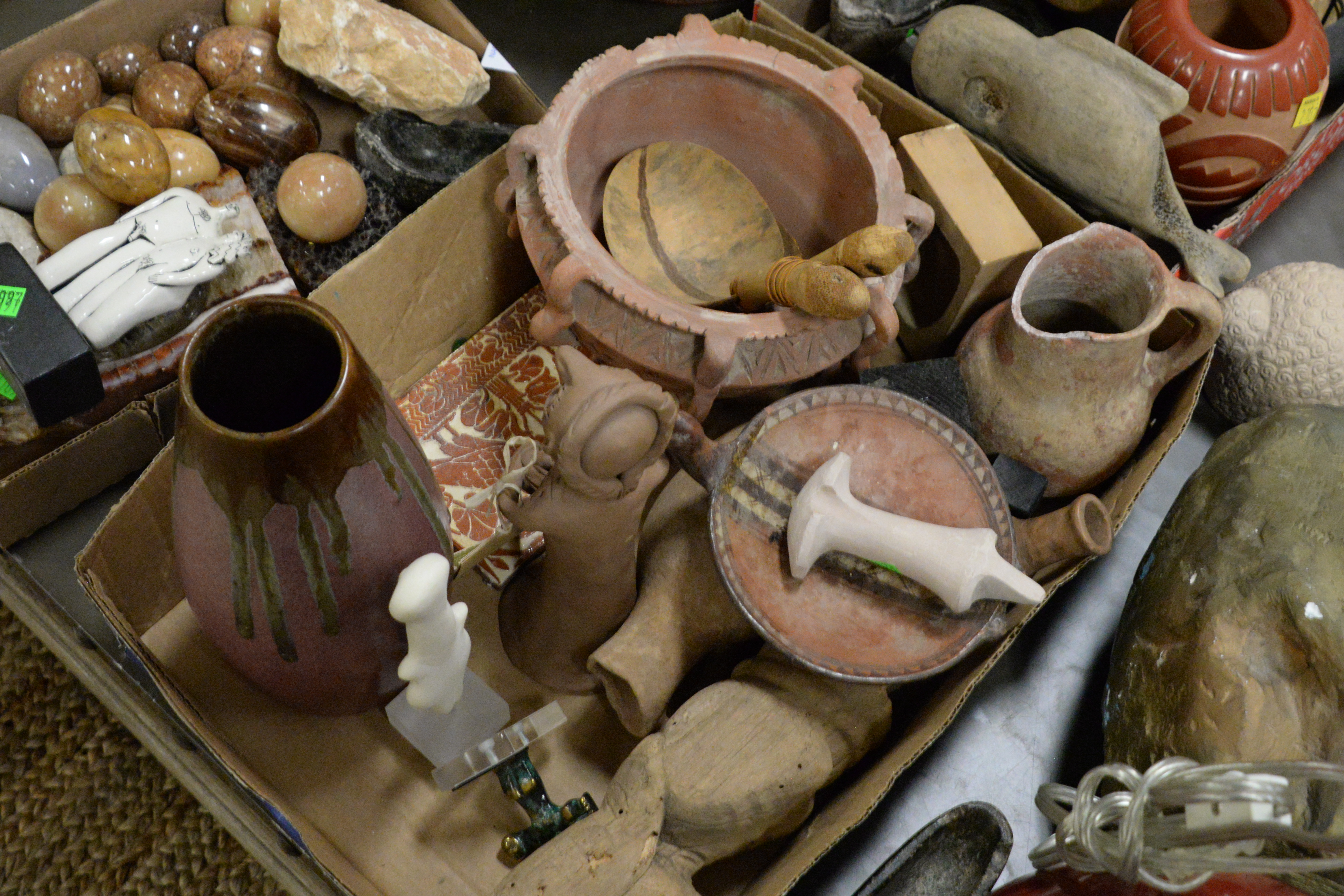Four Tray Lots of Antiquities and Oddities, to include, clay pots, wooden figures, carved stone, oil lamp, hardstone eggs, tallest 12 inches