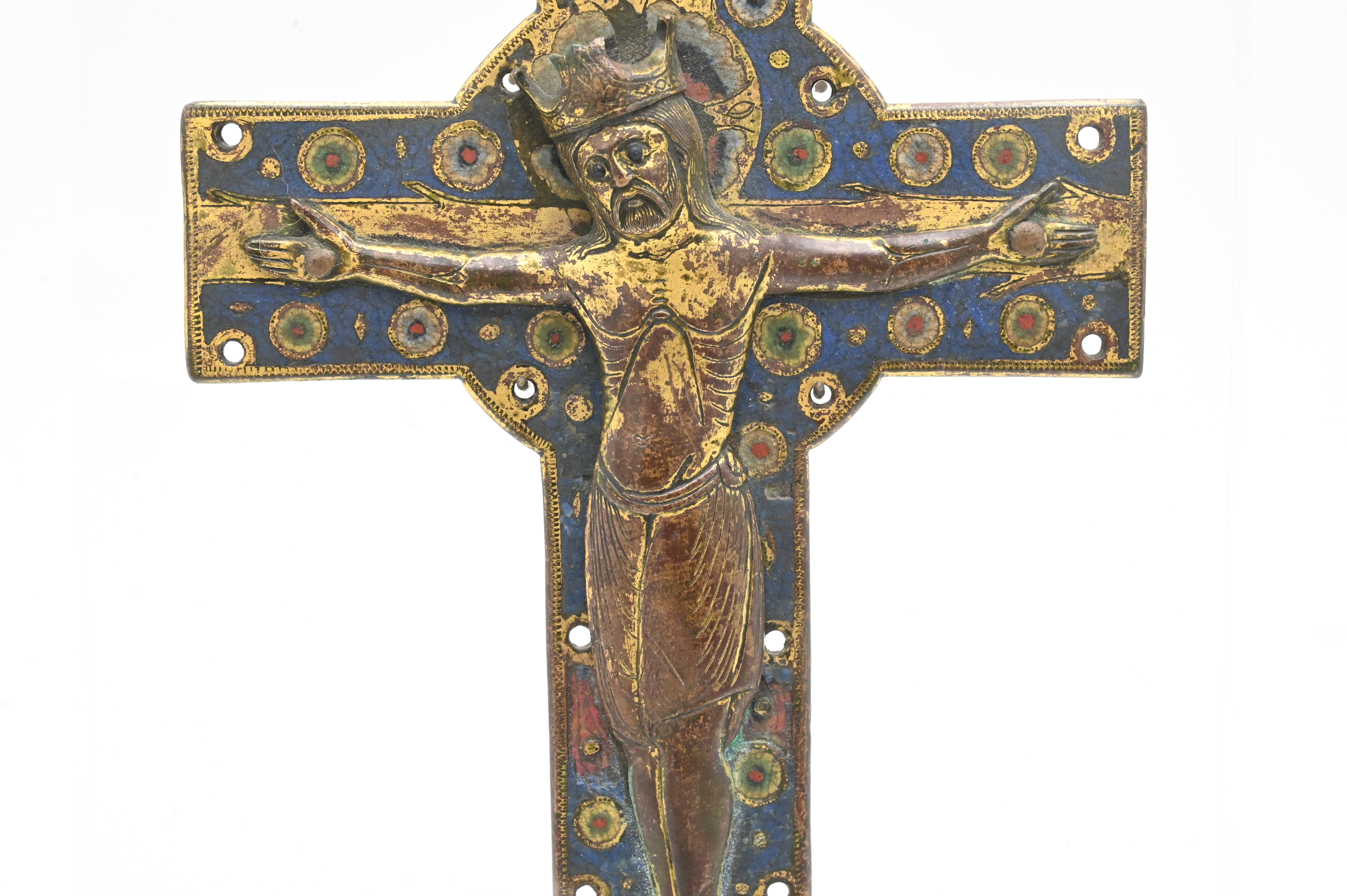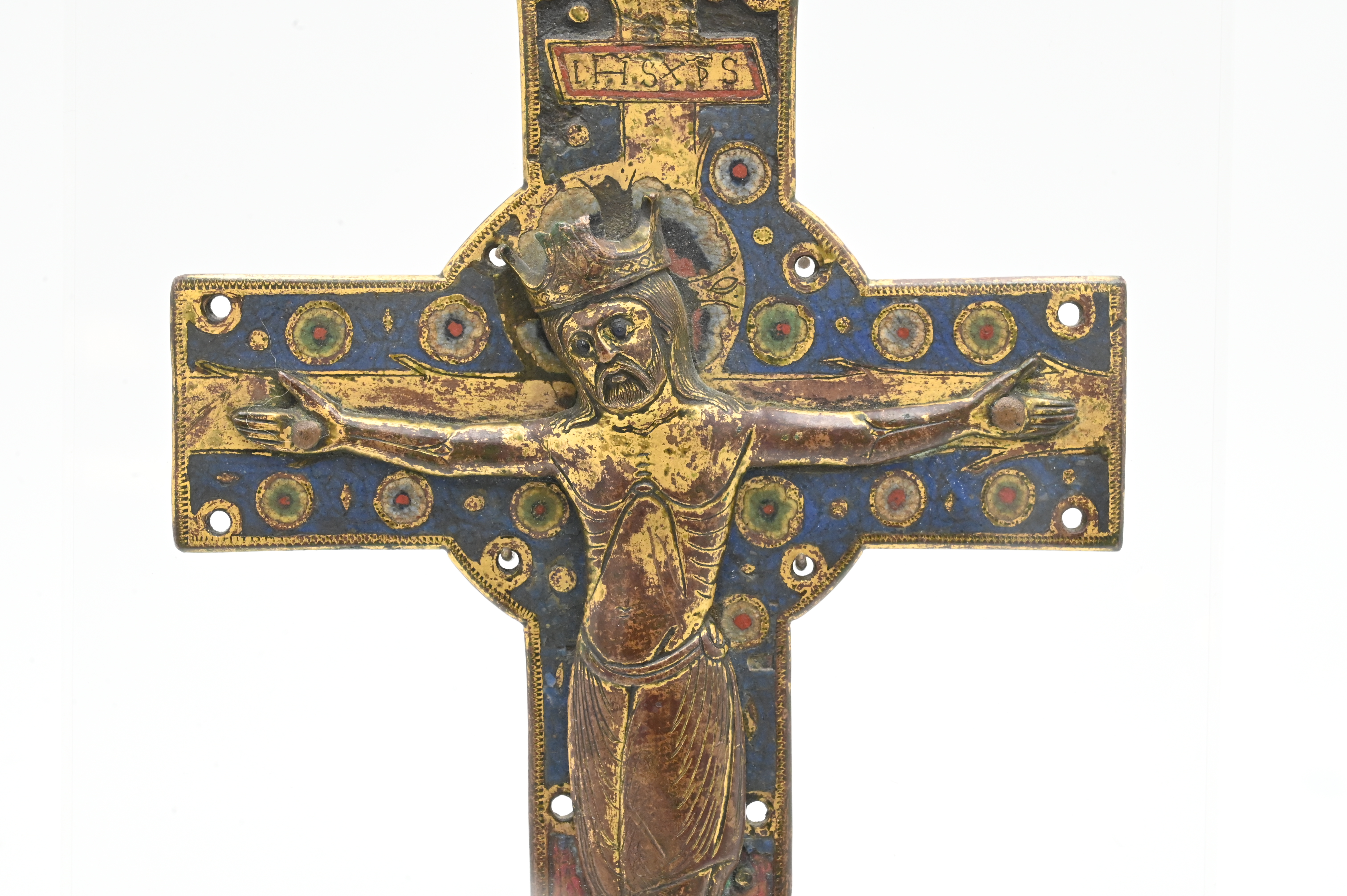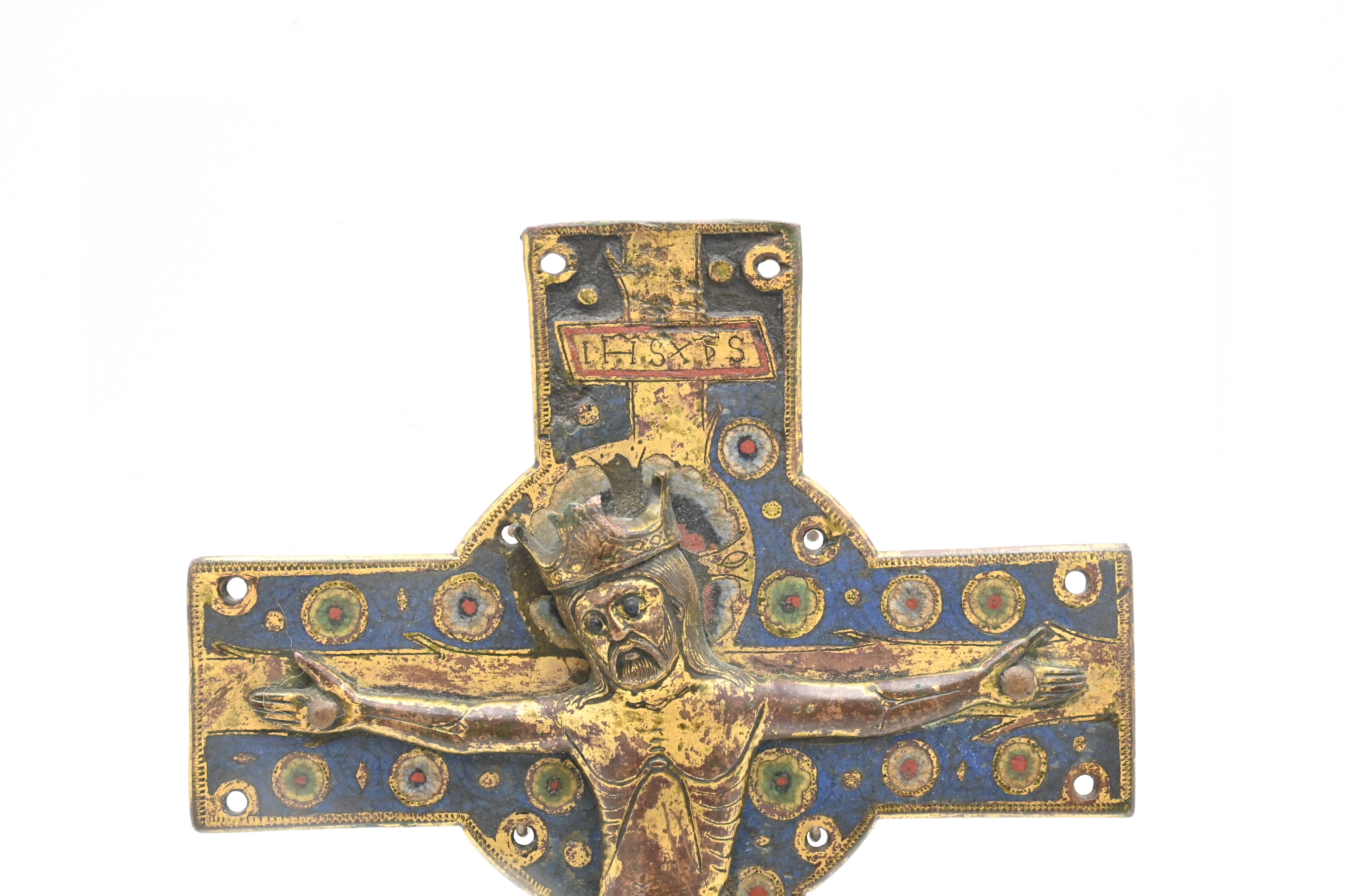 the applied corpus in high relief, which can be classified as belonging to the “Gem group” or “Type II” category referred to in Paul Thoby’s typology, the crowned figure of Christ in repousse copper with enameled decoration at eyes, perizonium and footrest, titulus inscribed IHS XPS, approximately 13th century