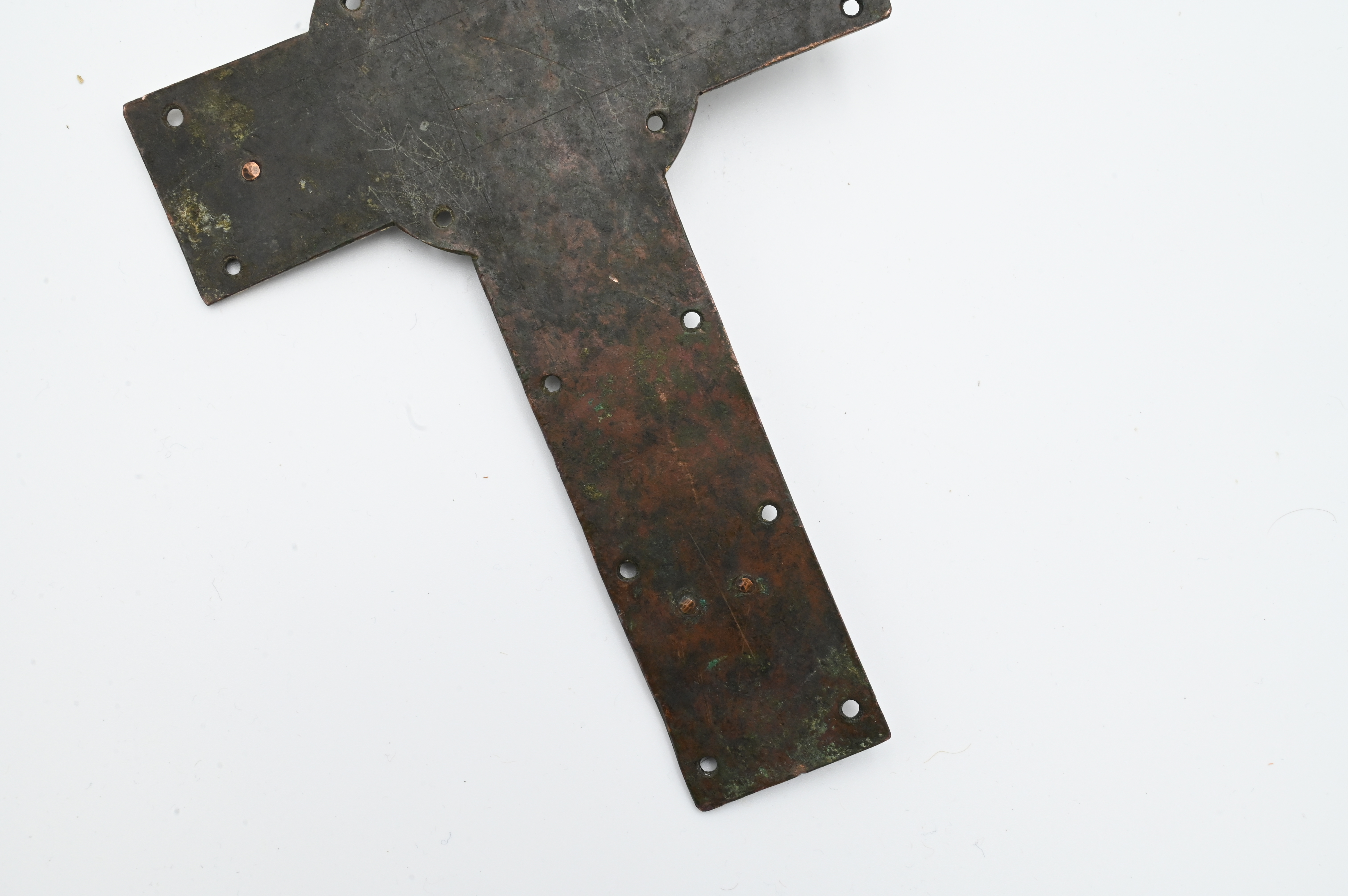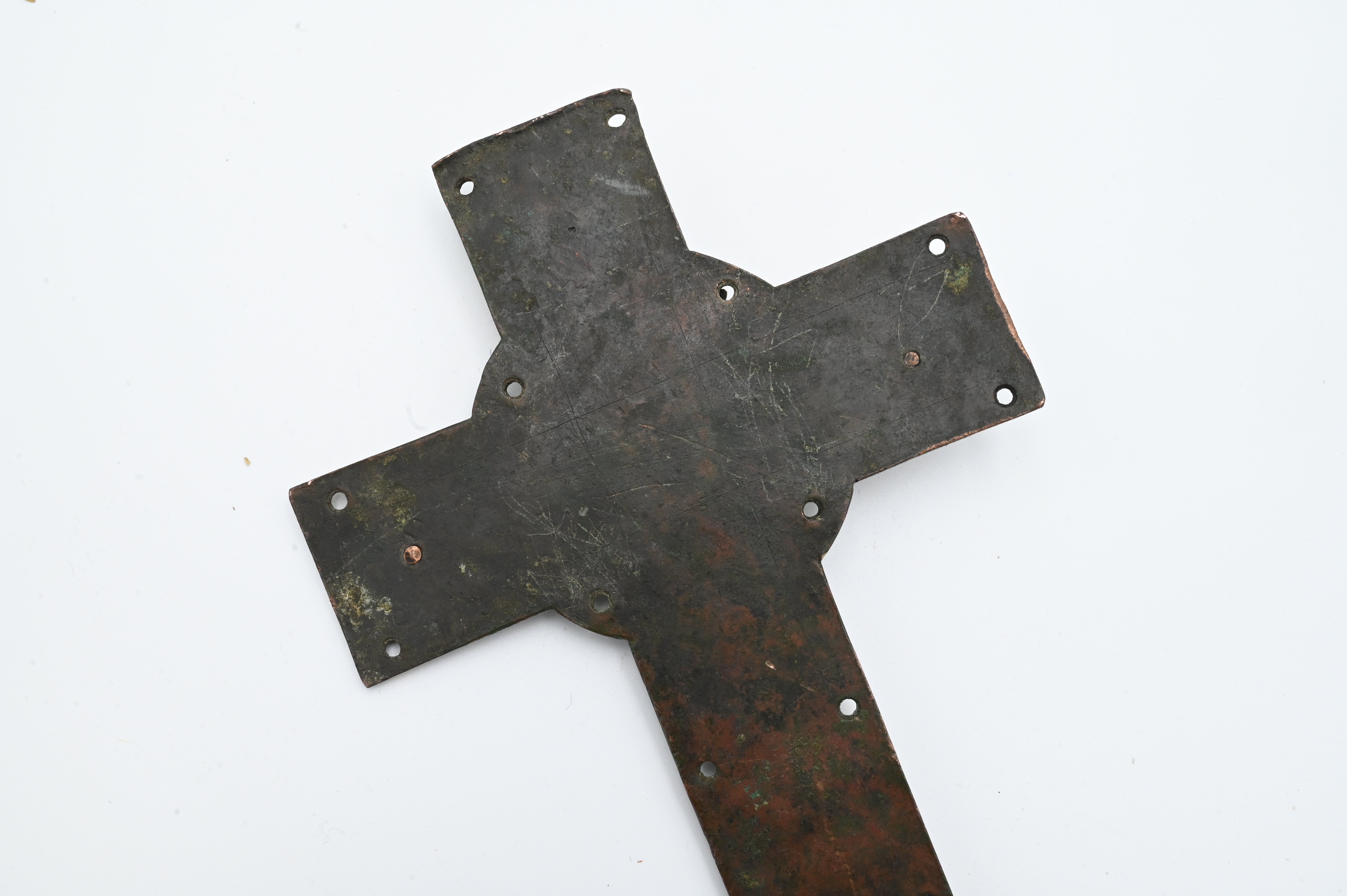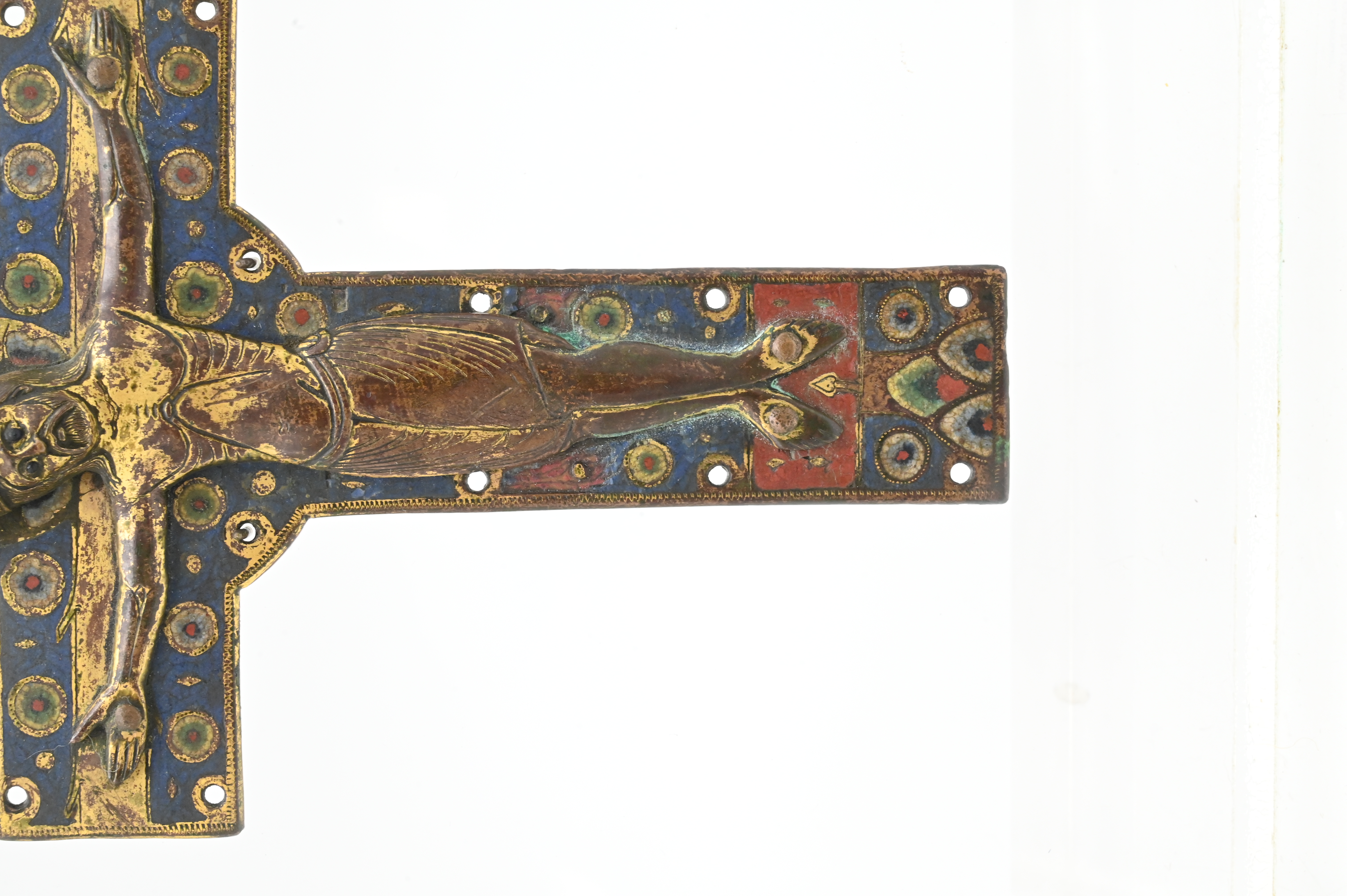 the applied corpus in high relief, which can be classified as belonging to the “Gem group” or “Type II” category referred to in Paul Thoby’s typology, the crowned figure of Christ in repousse copper with enameled decoration at eyes, perizonium and footrest, titulus inscribed IHS XPS, approximately 13th century