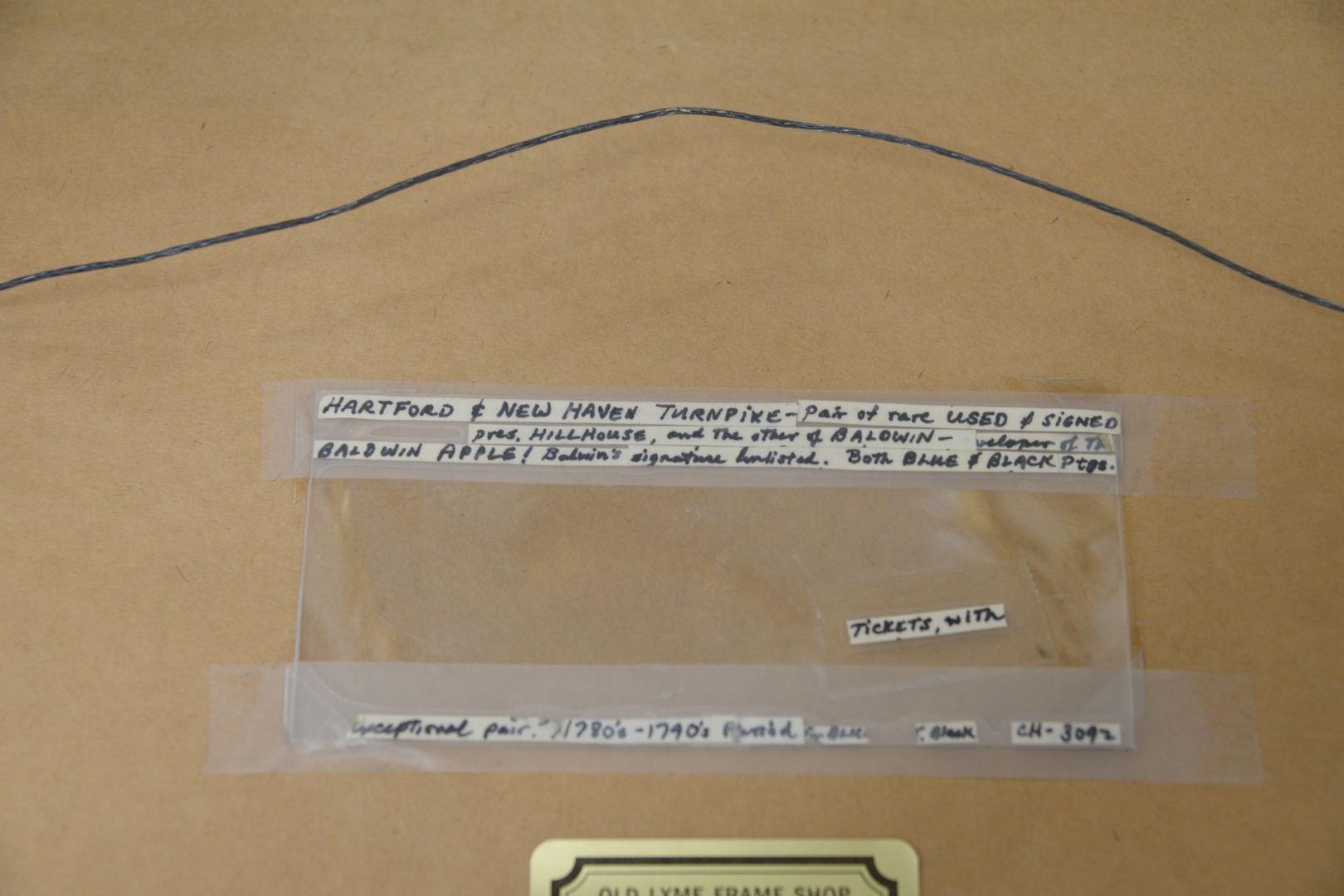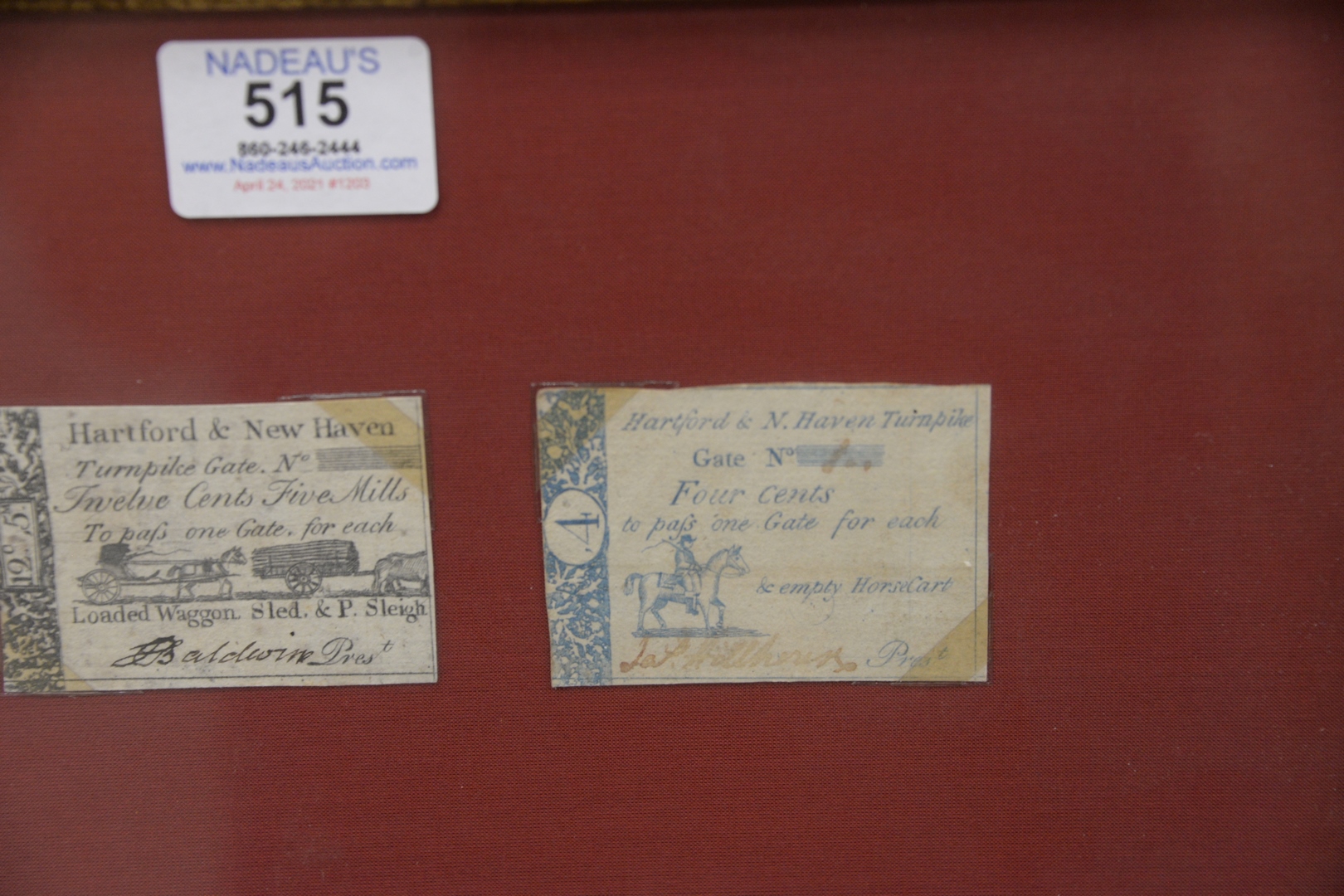 Lot 515: Two Framed Connecticut Colonial Currency, both Hartford and New Haven one engraved 1799, Amos Doolittle twelve cents, five mills, black print to pass one gate for each, loaded wagon, sled and P. Sleigh, Baldwin Press along with 1799, Gate No. four c