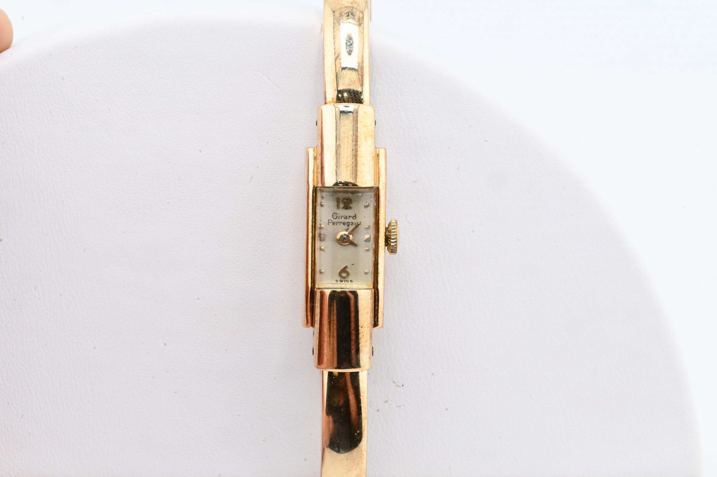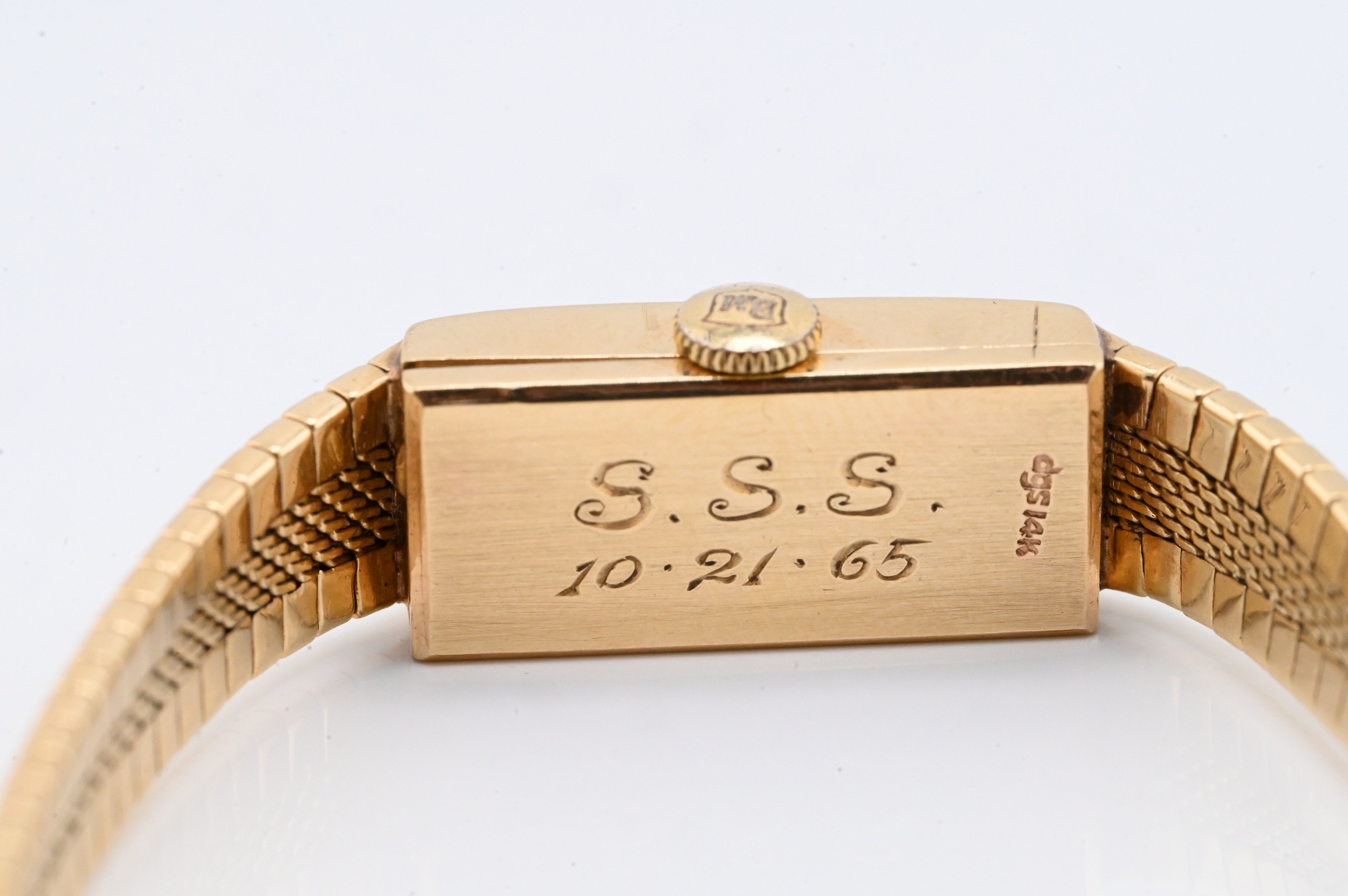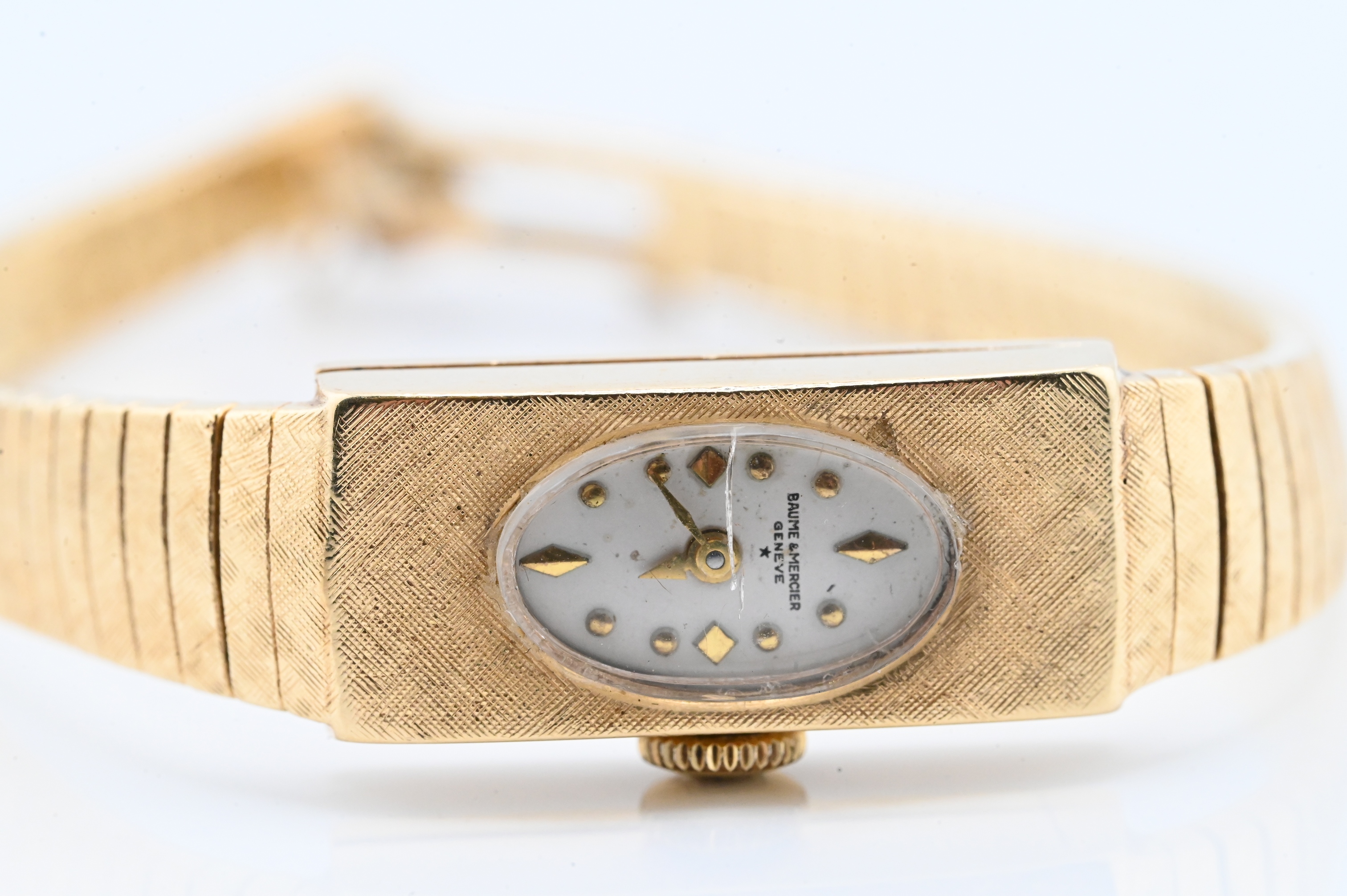 Swiss, mid-20th century an 14K yellow gold ladies wristwatch by Baume & Mercier, Genève, the rectangular textured gold case centering an oval silvered dial with gilt hands and markers, signed BAUME & MERCIER / GENÈVE, the reverse engraved “S.S.S. / 10-21-66”, manual-wind 17-jewel movement (movement and crystal removed for weight), marked UNADJUSTED / SWISS / SEVENTEEN 17 JEWELS / BAUME & MERCIER, accompanied by its integrated 14K yellow gold bracelet