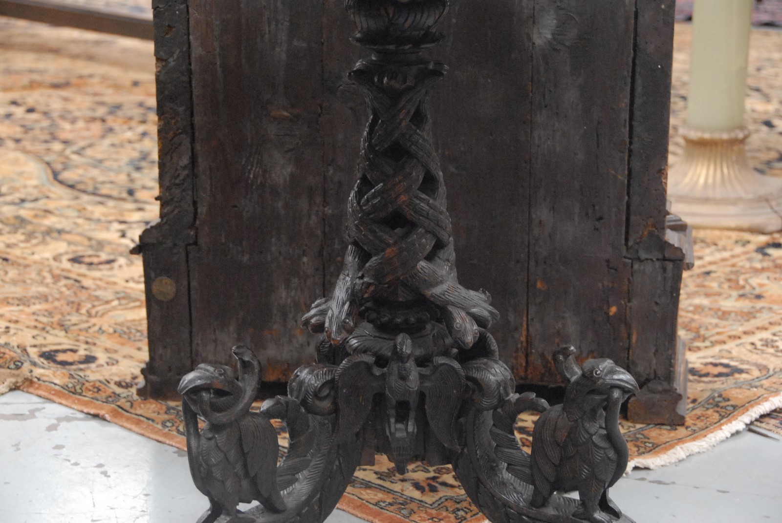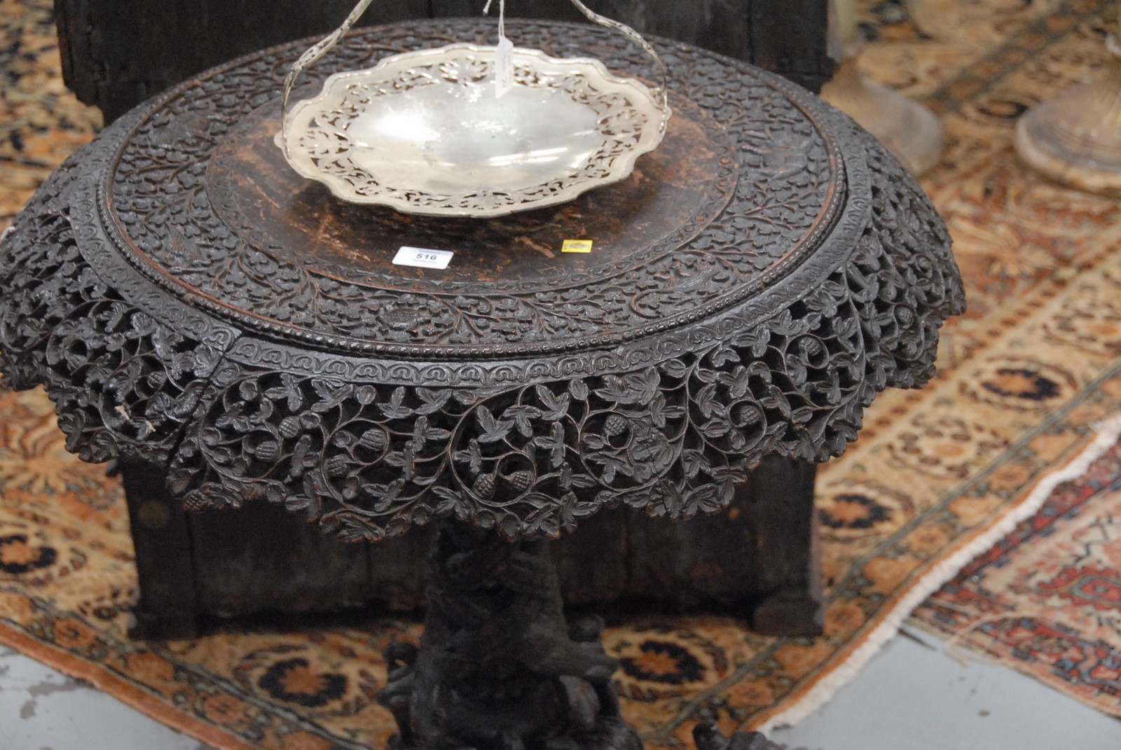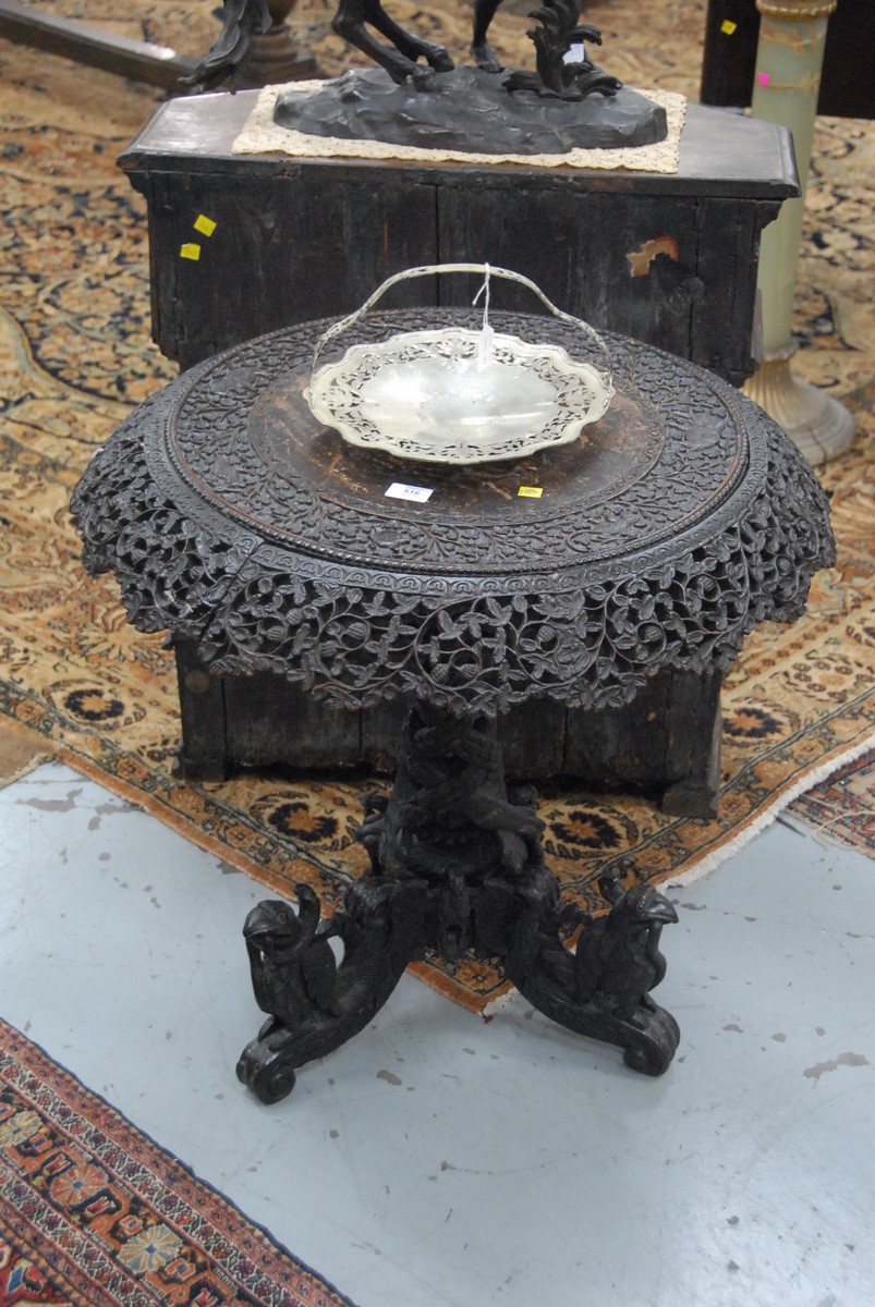 Lot 516: Carved Selanese or Anglo Indian rosewood table, pierce carved edge with carved scrolling vines on openwork pedestal on three legs carved birds with snakes.