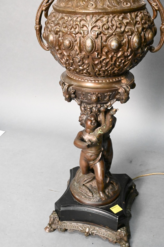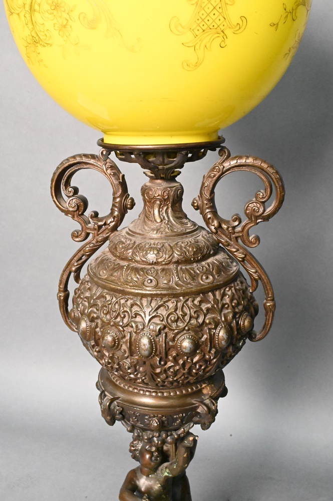 Figural Piano Lamp, having two putti figures holding oil well, yellow glass shade, height 28 inches.