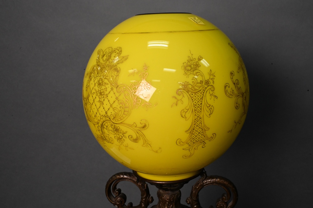 Lot 516: Figural Piano Lamp, having two putti figures holding oil well, yellow glass shade, height 28 inches.