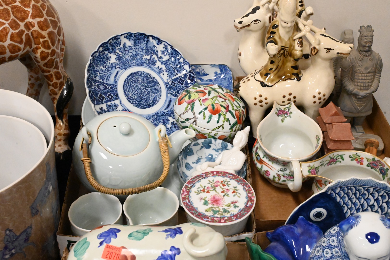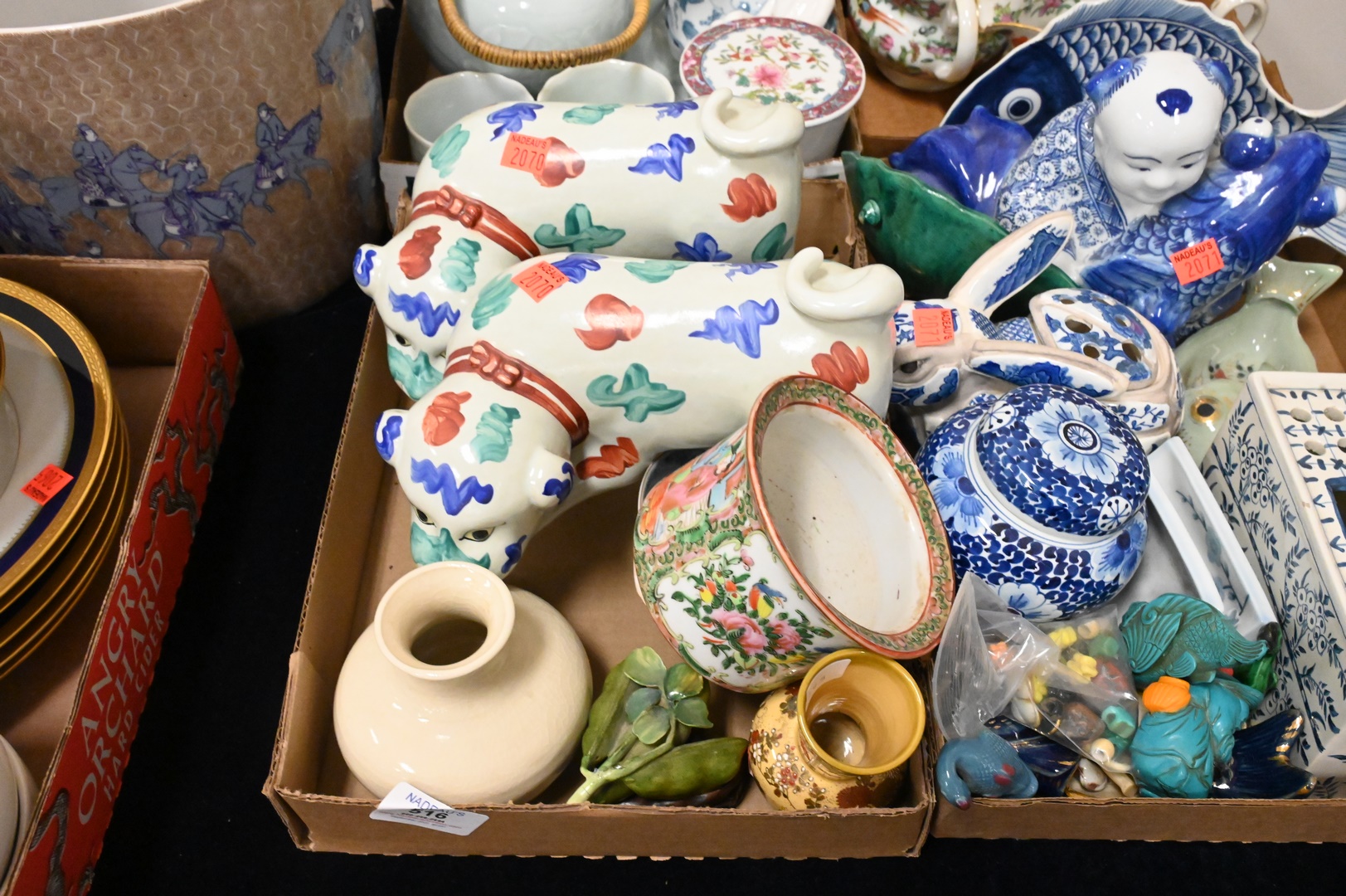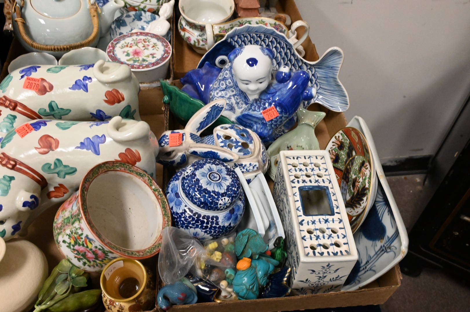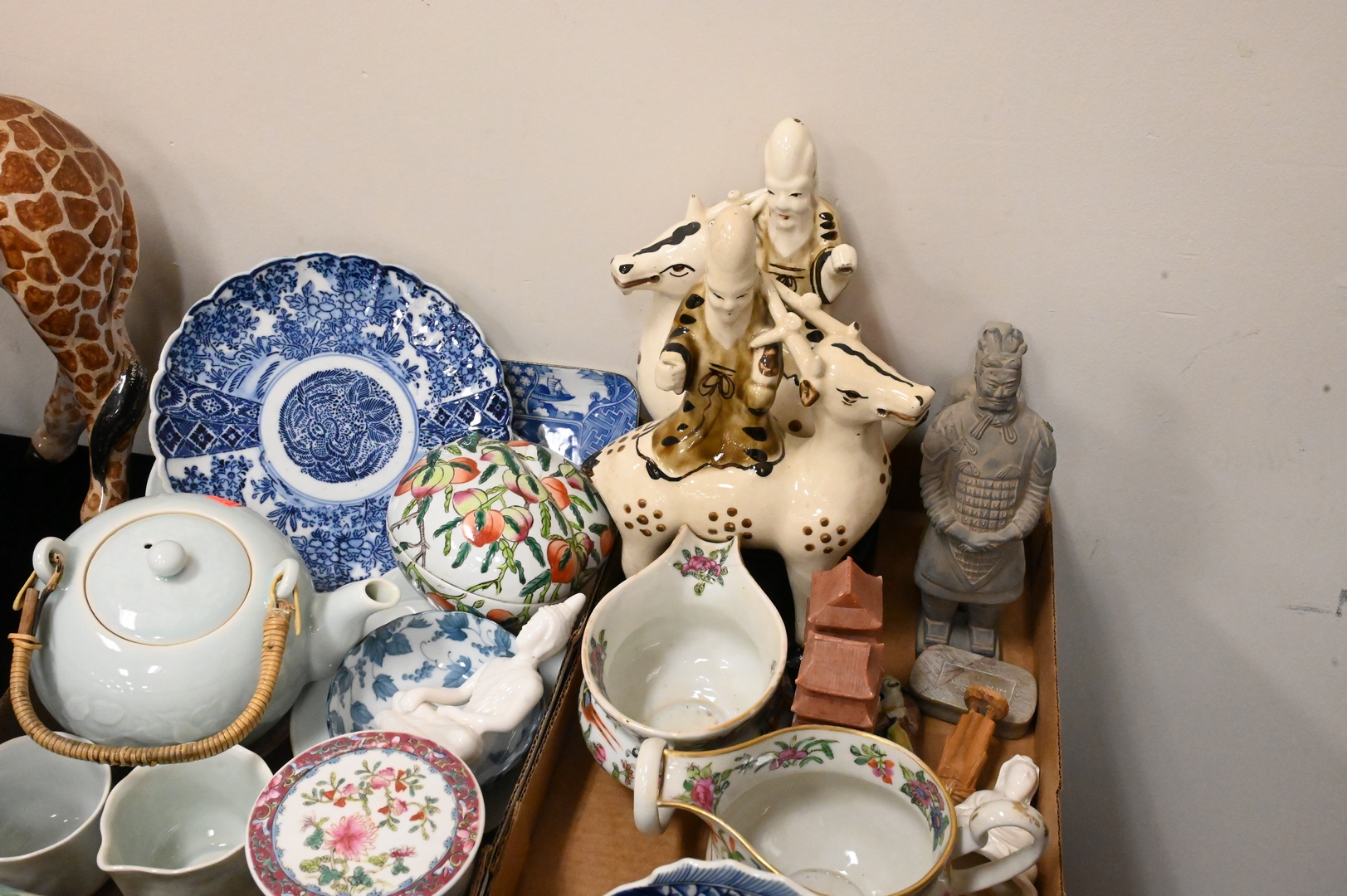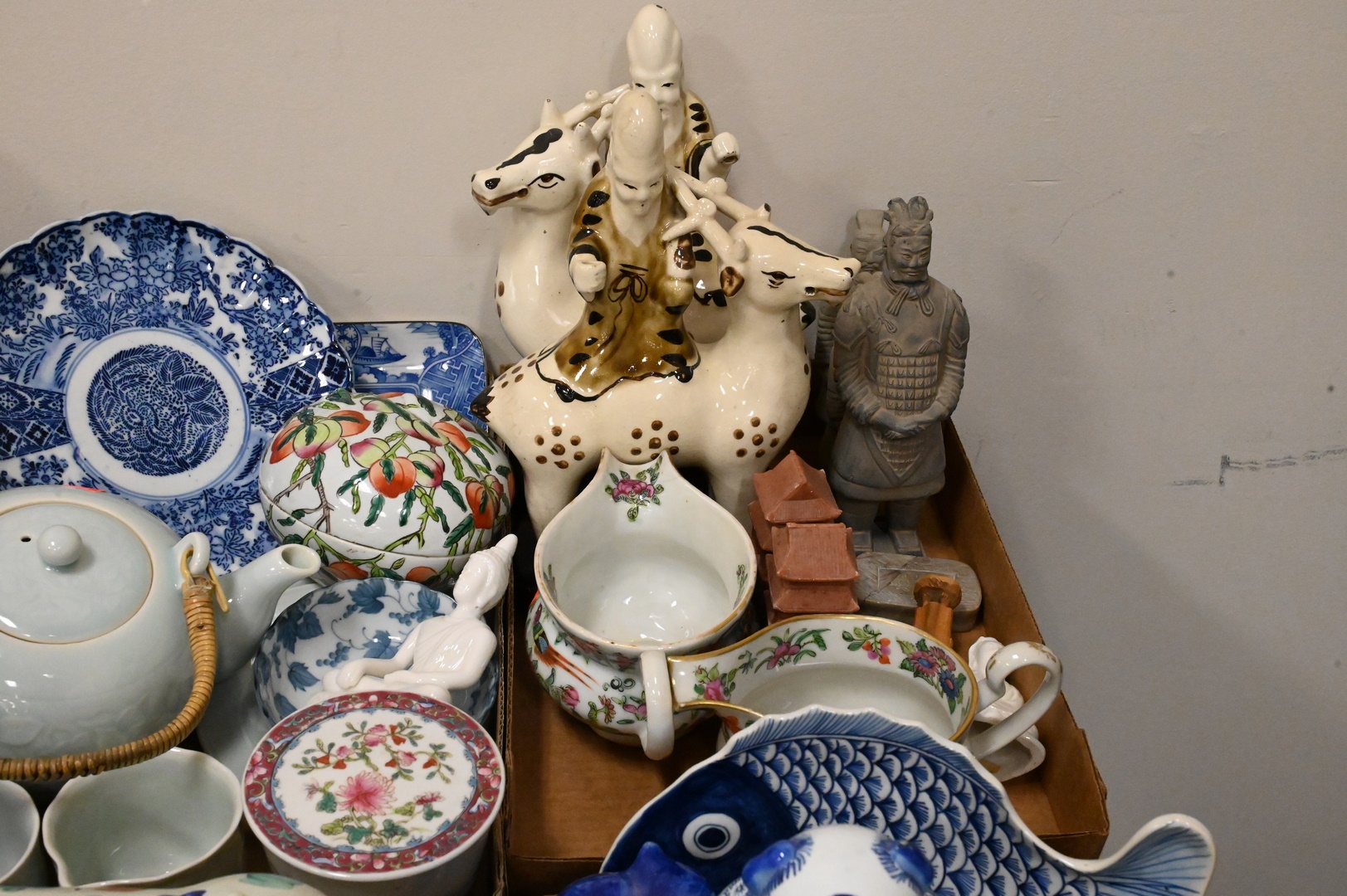 Four Tray Lots of Porcelain and Ceramic, to include assorted Chinese and Asian figures, pots, planters, etc.