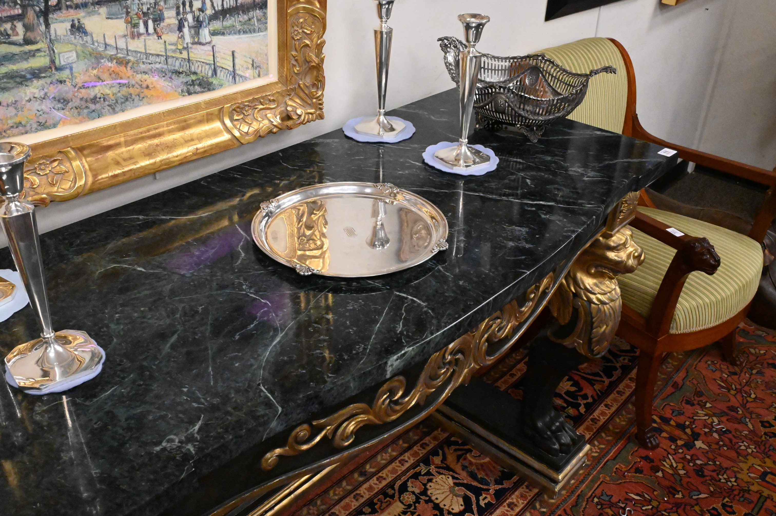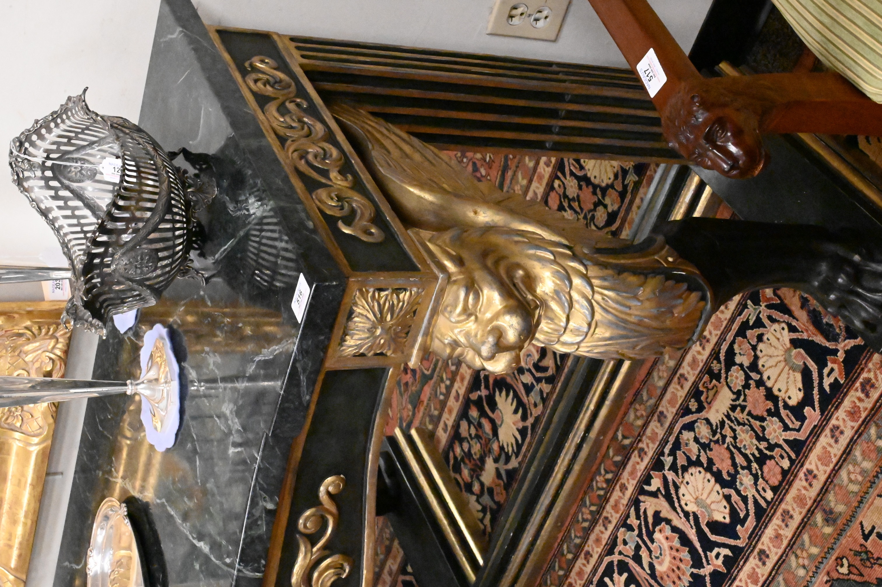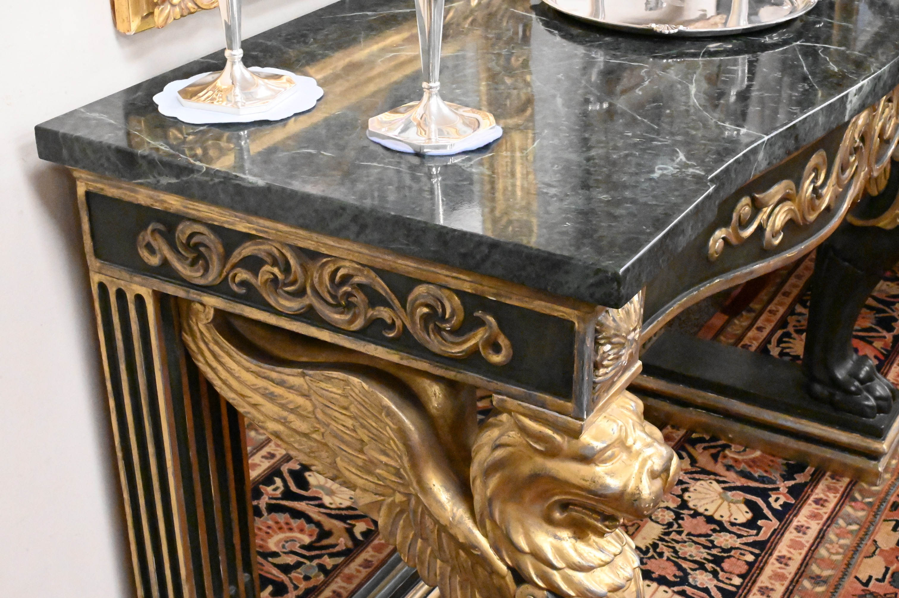 having gilt winged lion monopodia supports, stop fluted columns, with later mirror backing as well as later Verde Antico marble top