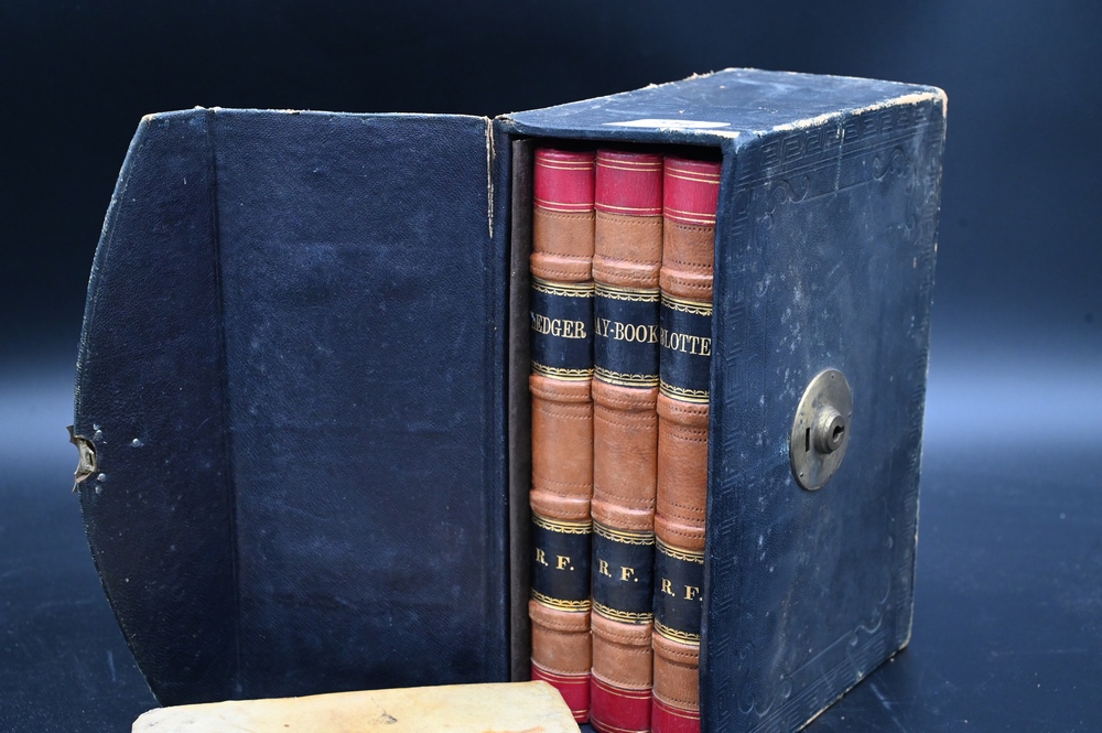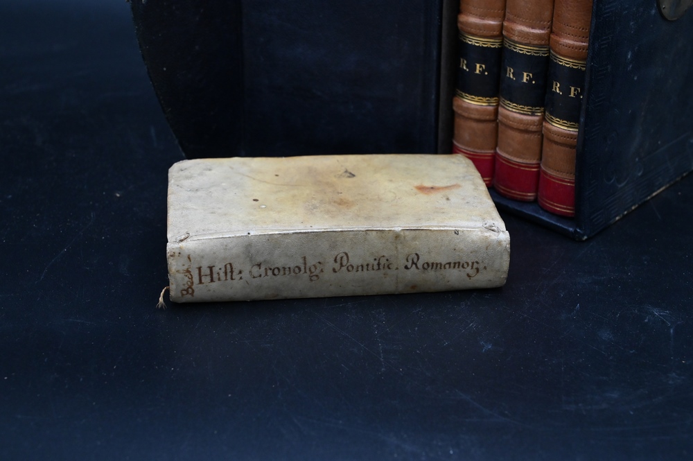 Group of Books, to include 1663 Francisco Carriere Chronological; a three volume set; ledger; leather bound daybook; blotter, in fitted box.