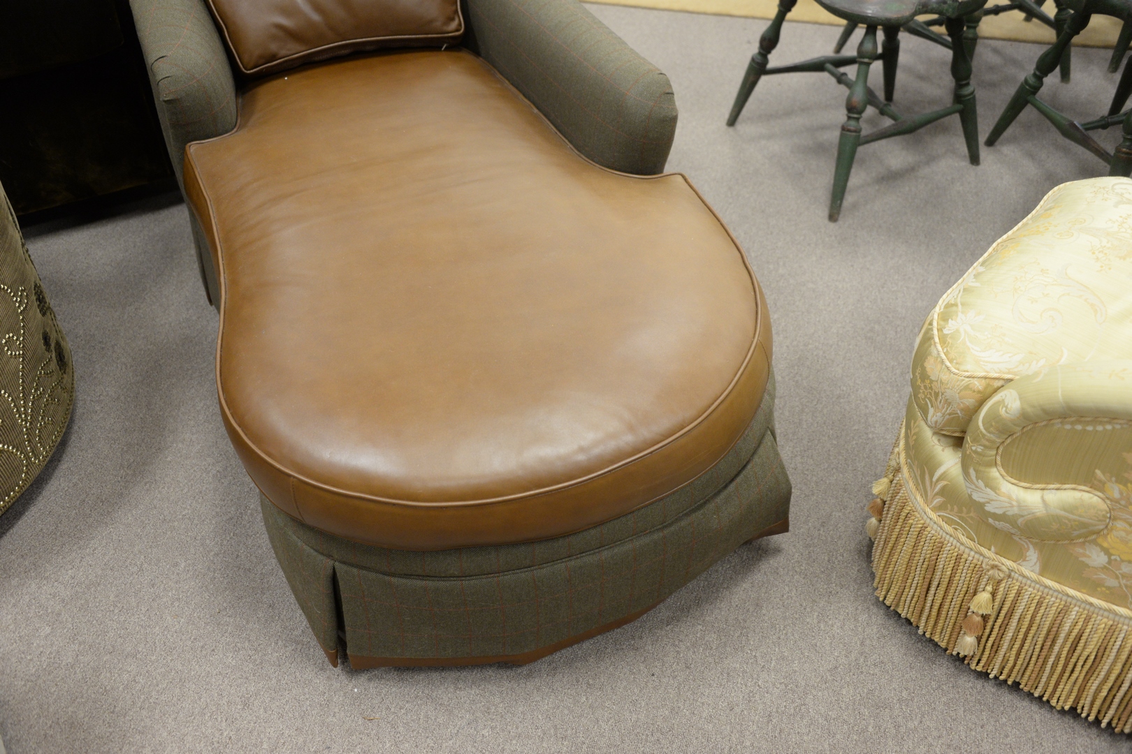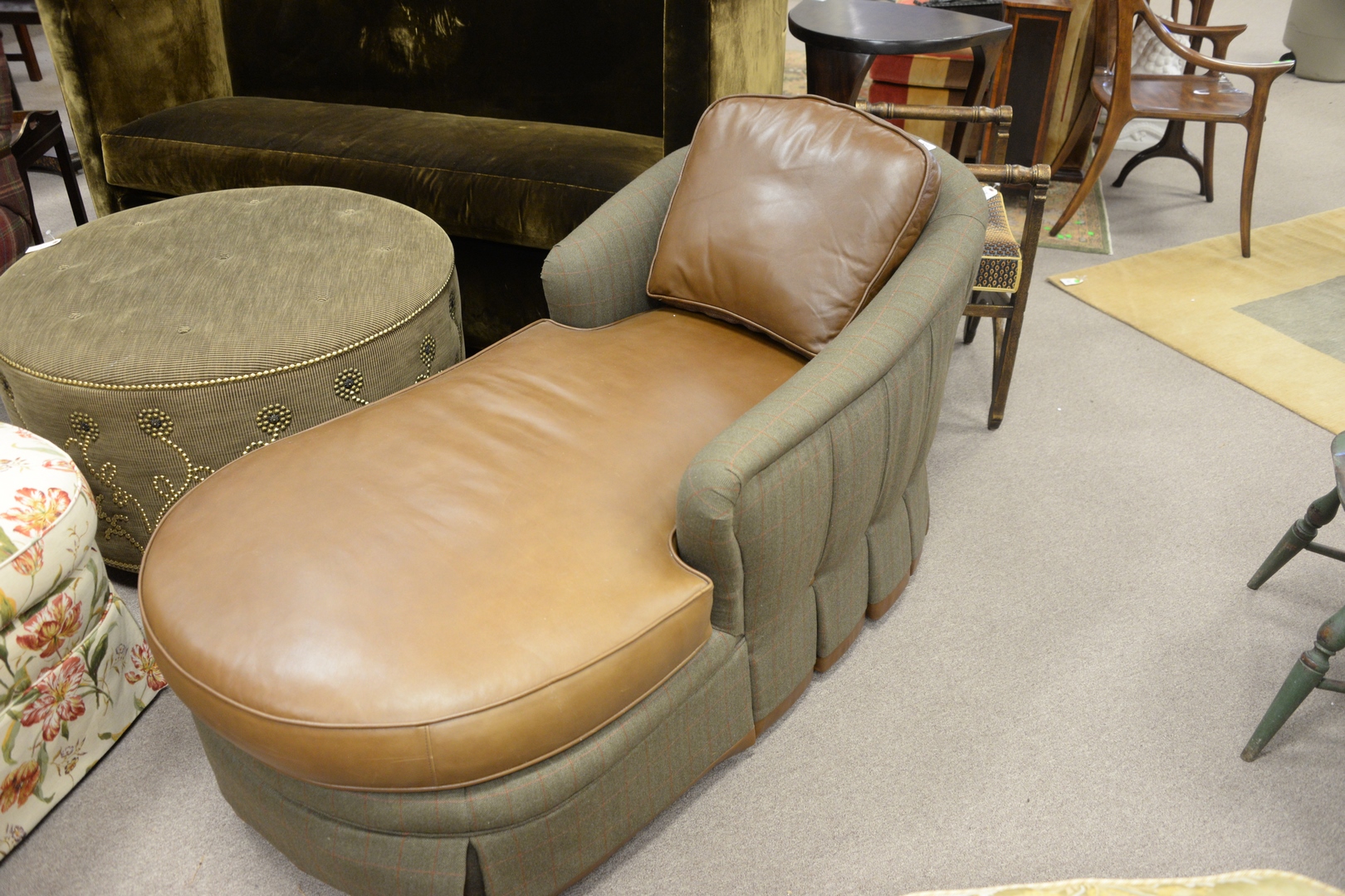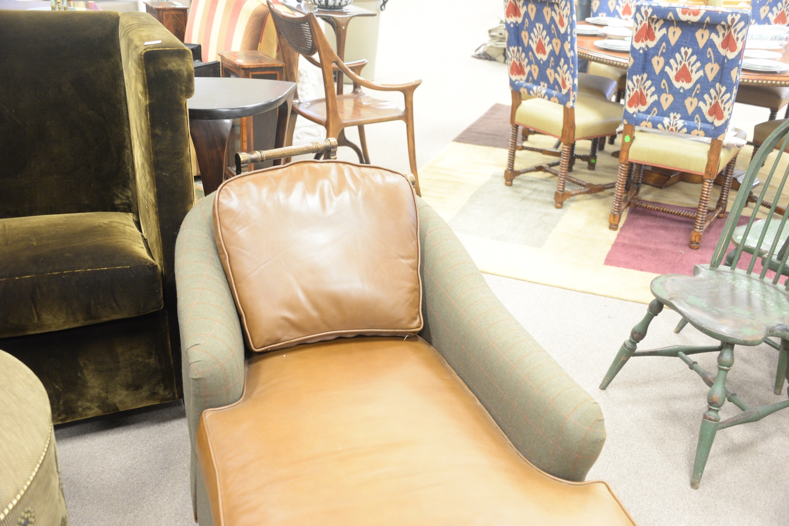 Lot 516: Jessica Charles Custom Leather and Cloth Upholstered Chaise Lounge, height 29 inches, length 62 inches, width 29 inches. Provenance: David and Cynthia Kim, 22 Stoney Wylde Lane, Greenwich, Connecticut. View home by visiting: https://www.zillow.com/homedetails/22-Stoney-Wylde-Ln-Greenwich-CT-06830/177238281_zpid/