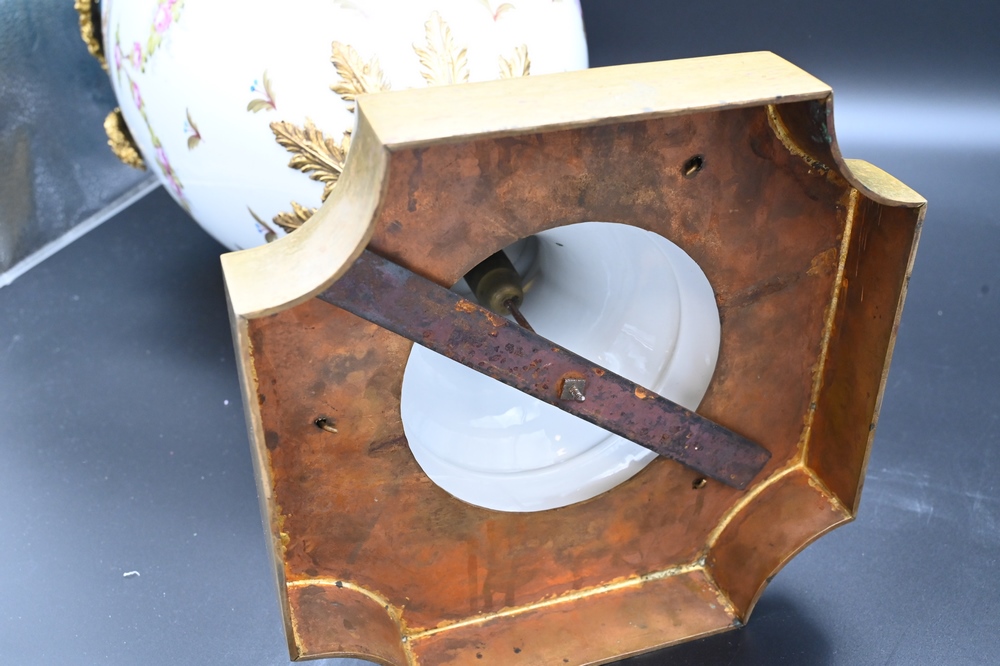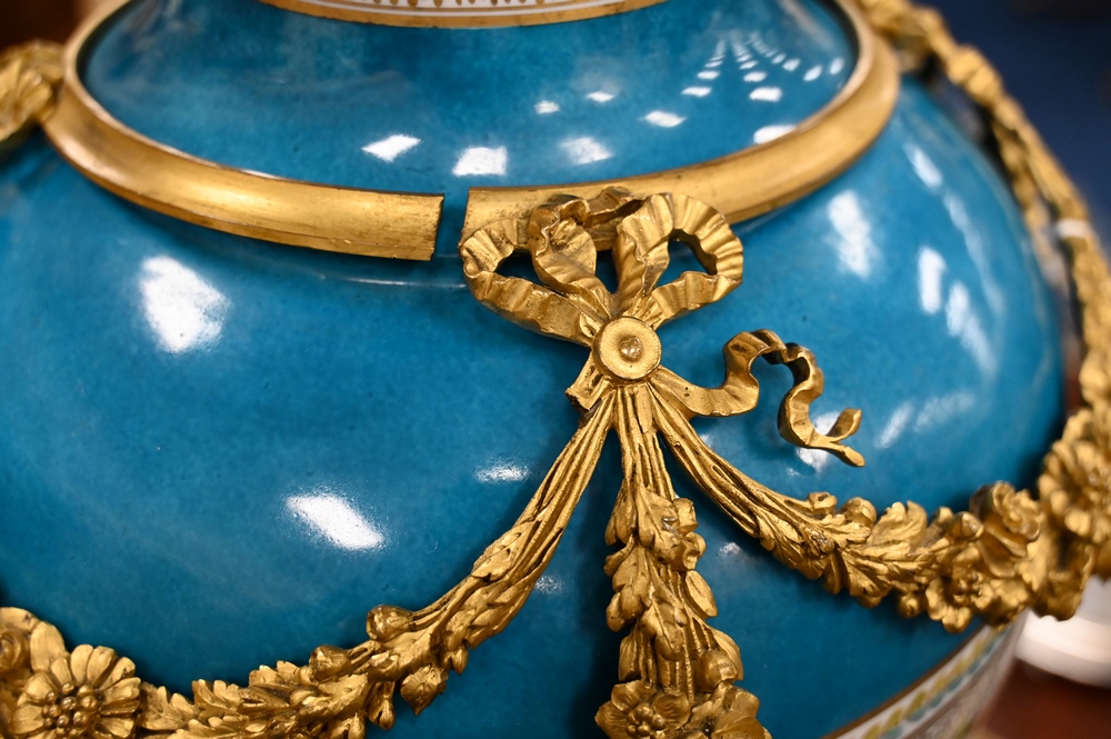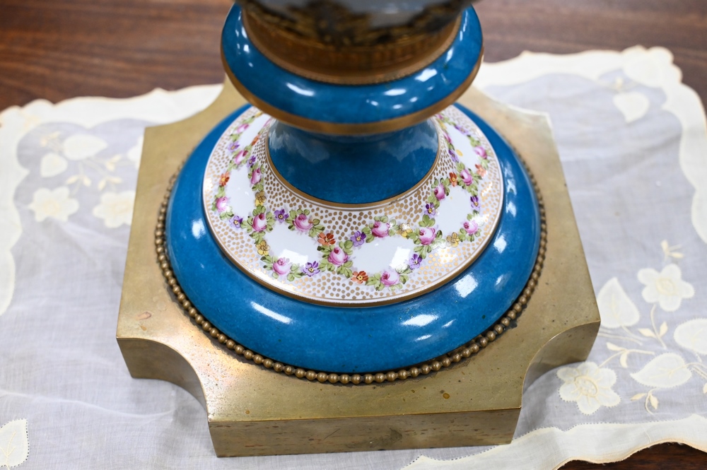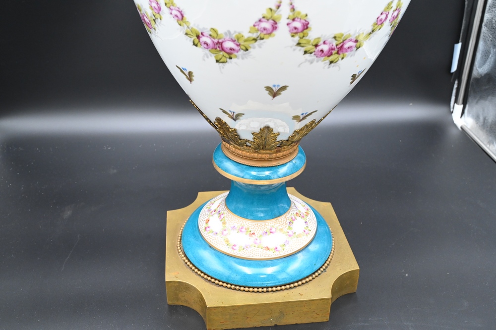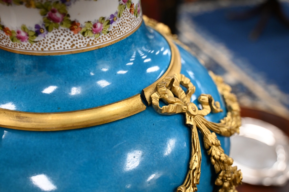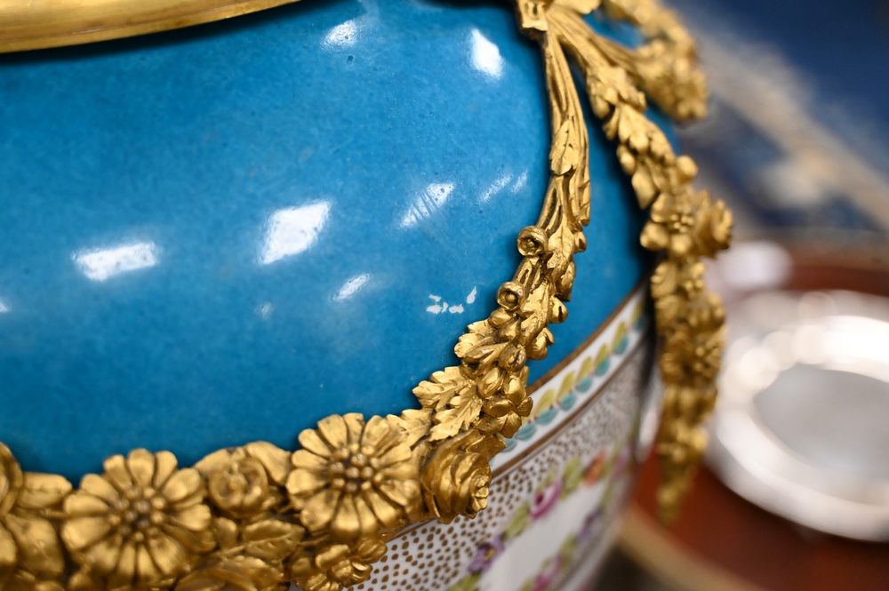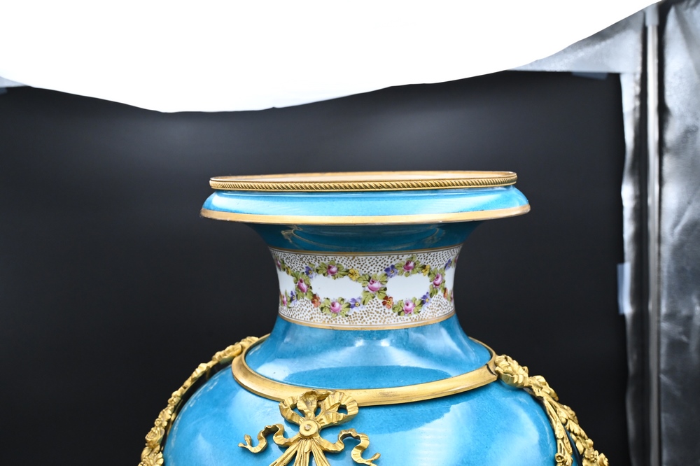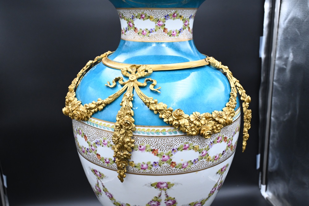 Lot 516: Monumental French Porcelain Vase, having flared rim and ormolu mounts, blue and white ground with painted flowers on bronze footed b…