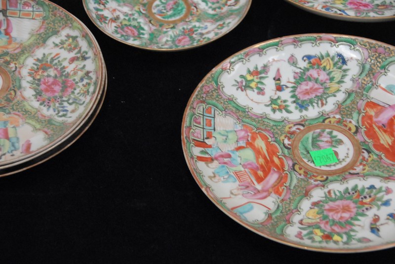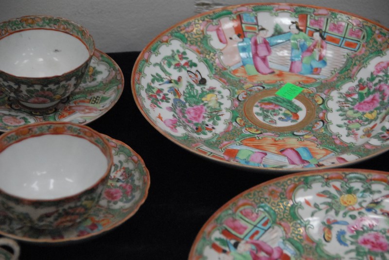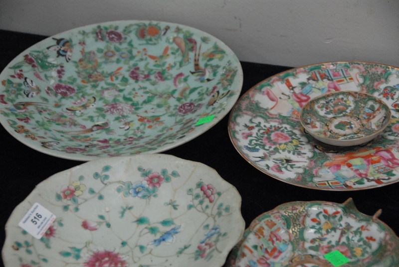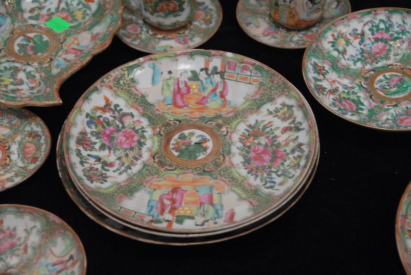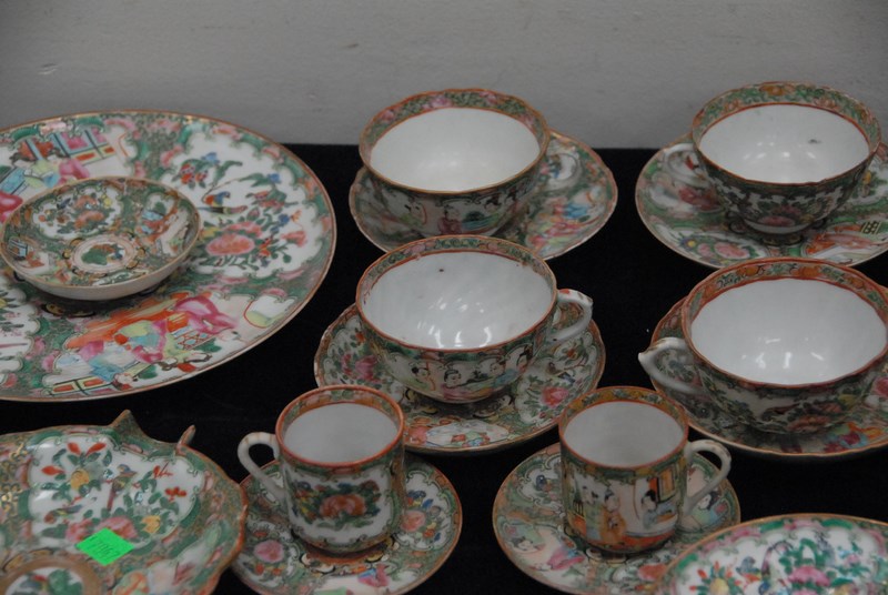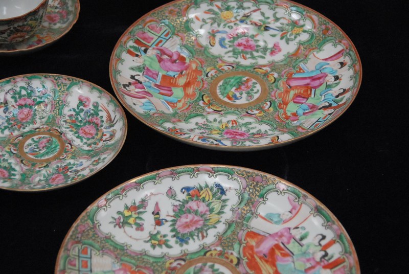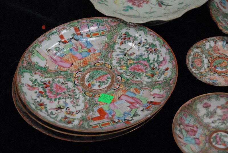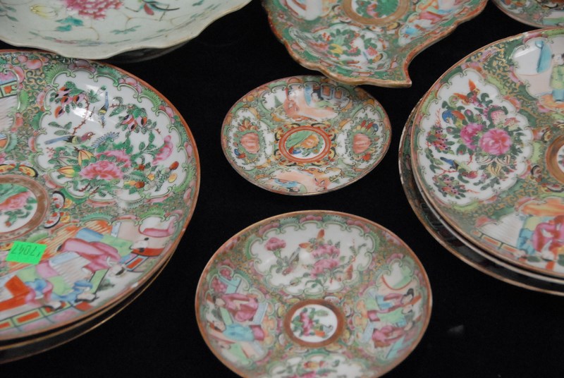 Lot 516: Rose Famille, twenty-nine piece lot including deep plates, plates, cups and saucers, leaf dish, and two celadon shallow bowls cracked, minor chips. deep plates: dia. 9 3/4in.