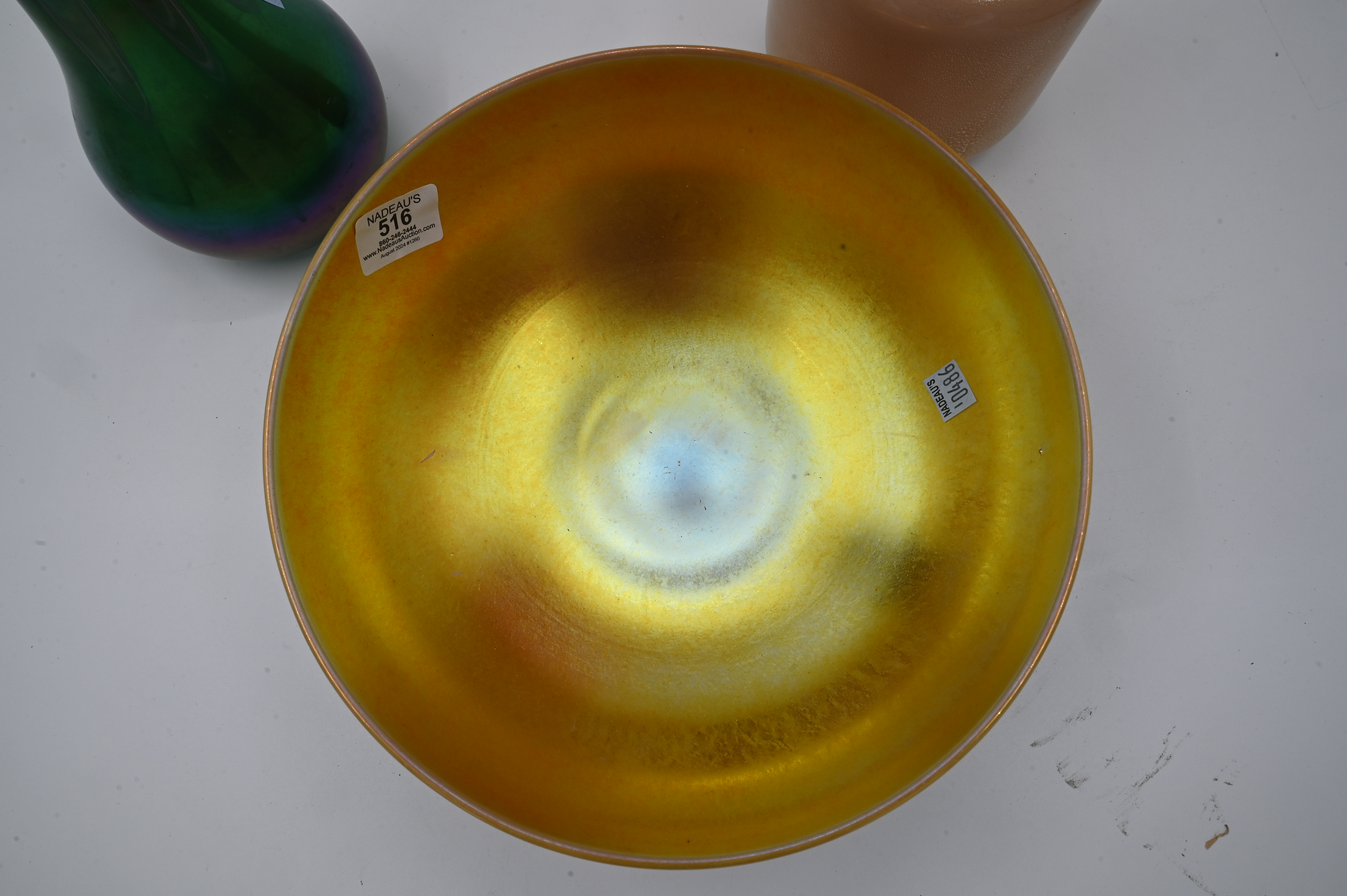 Aurene bowl, Loetz style vase, and murano vase signed