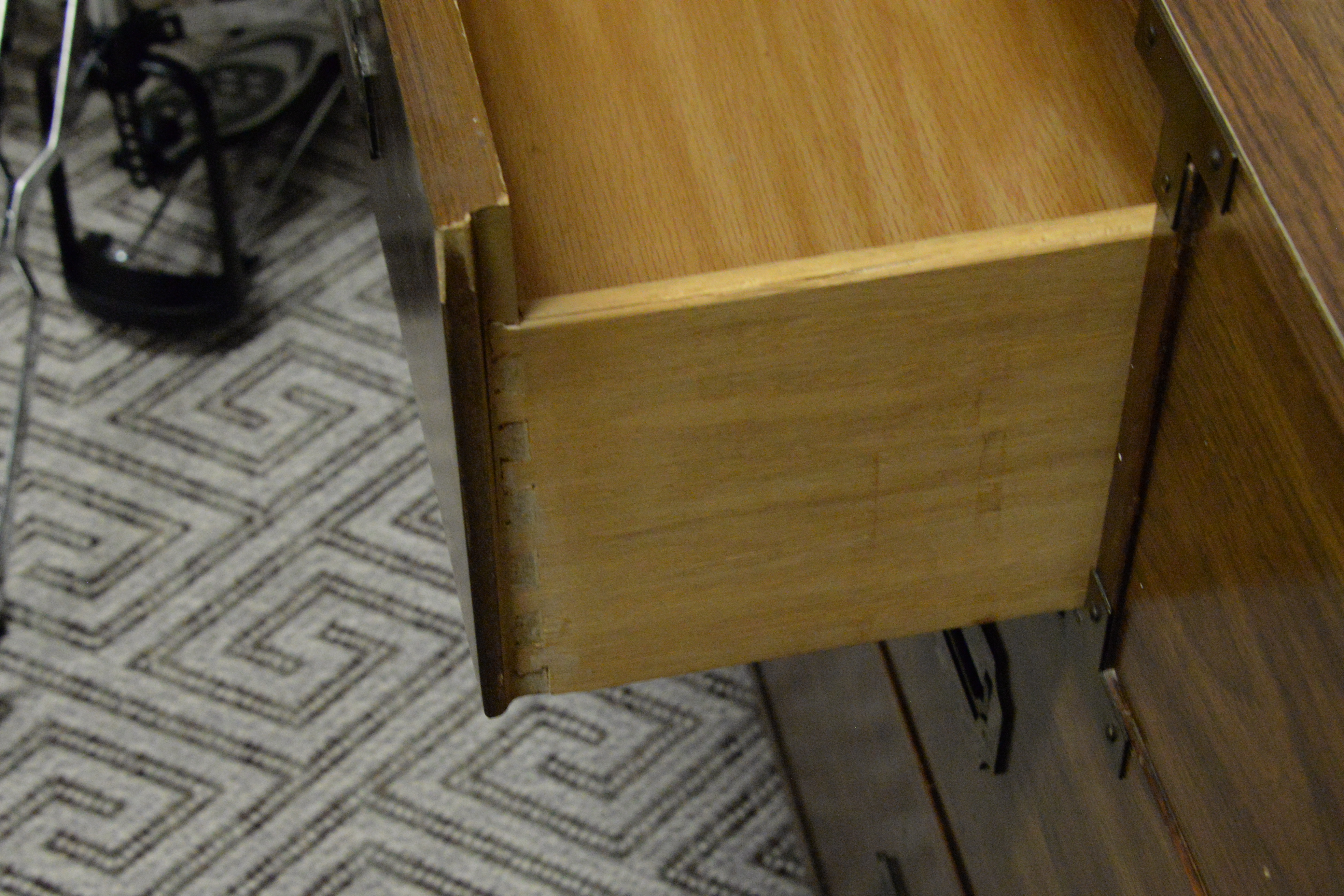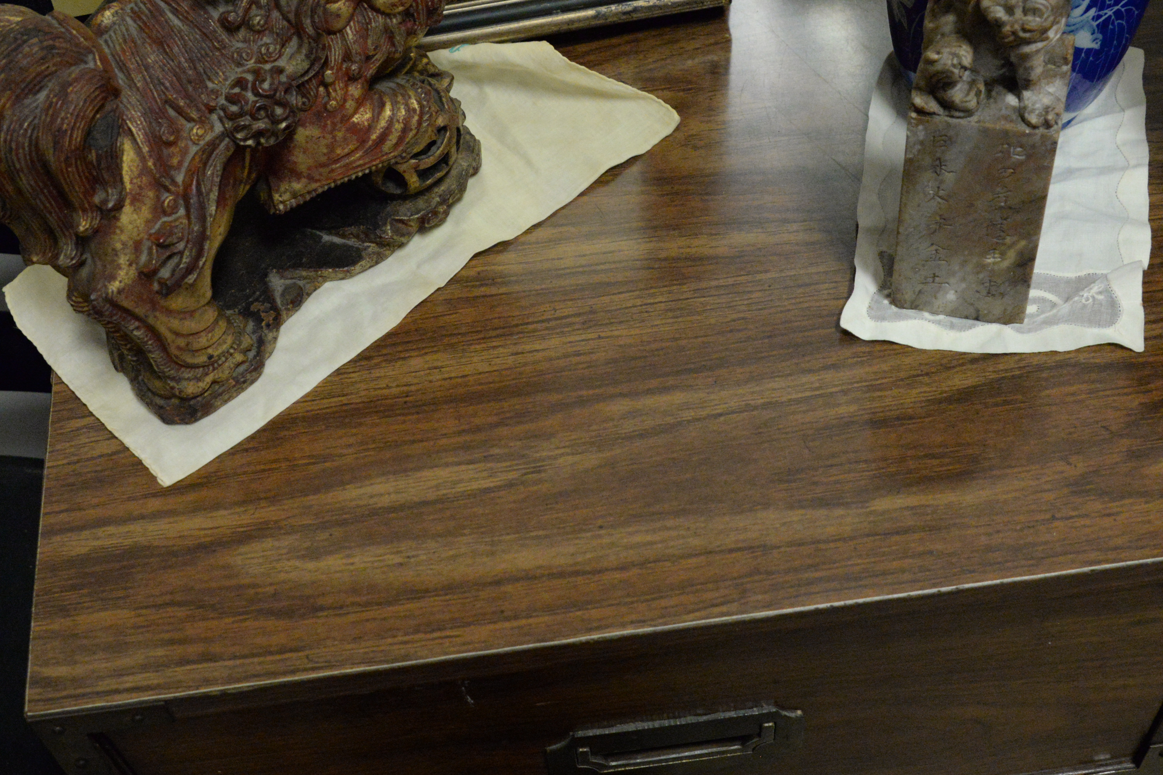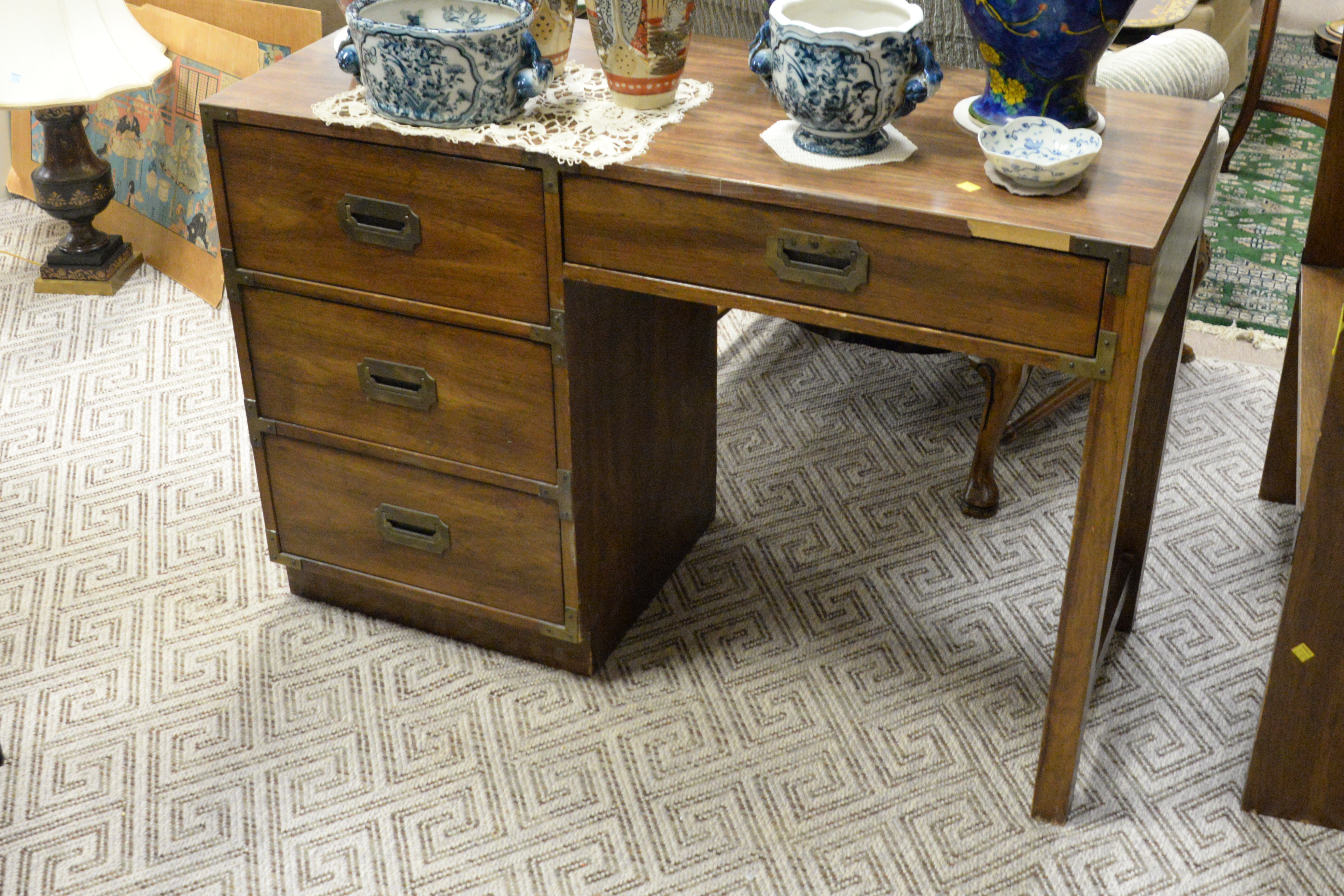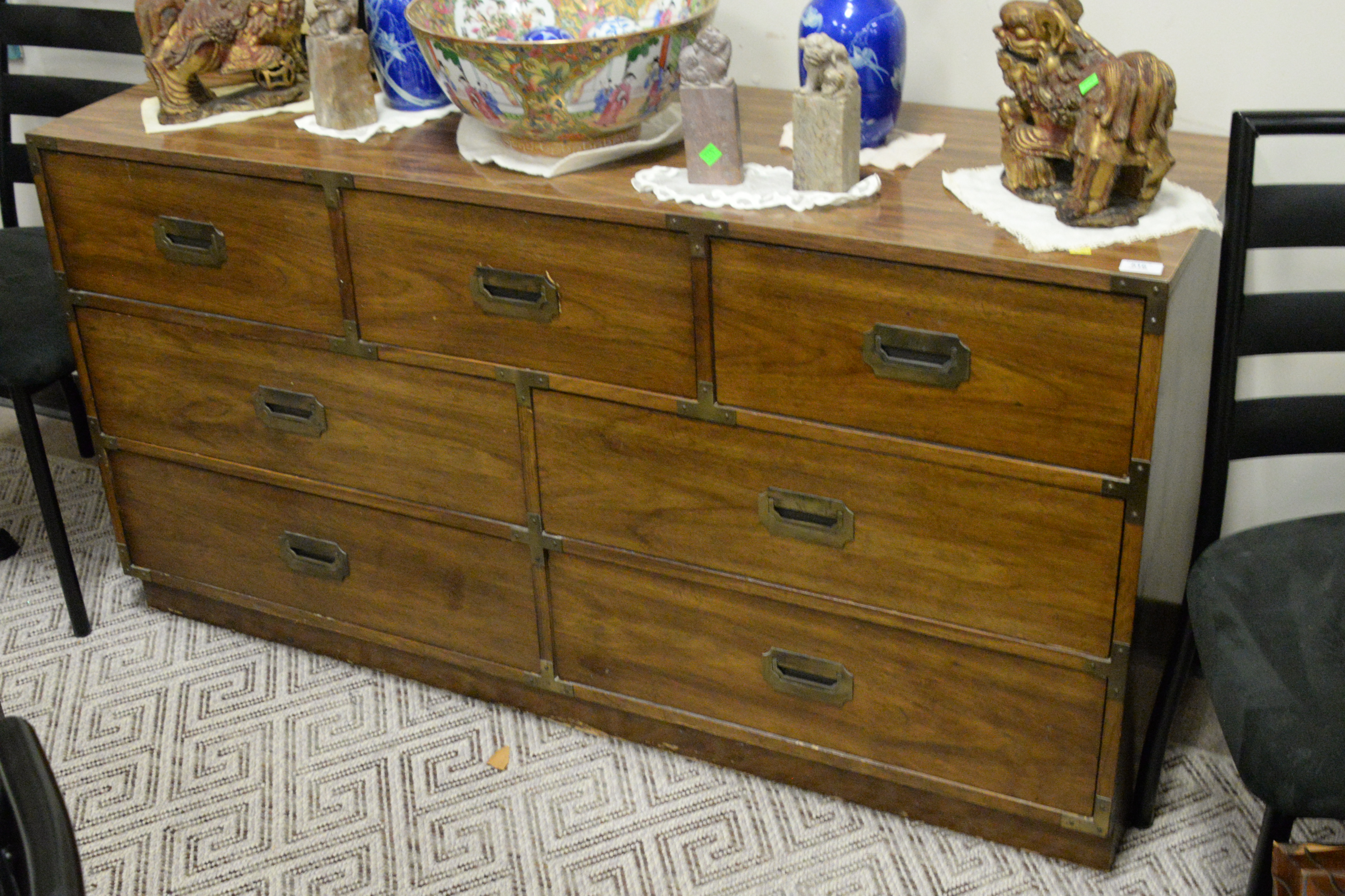 Two Piece Campaign Furniture Lot to Include, double chest and a desk, height 17 inches, top 18 1/4×56″