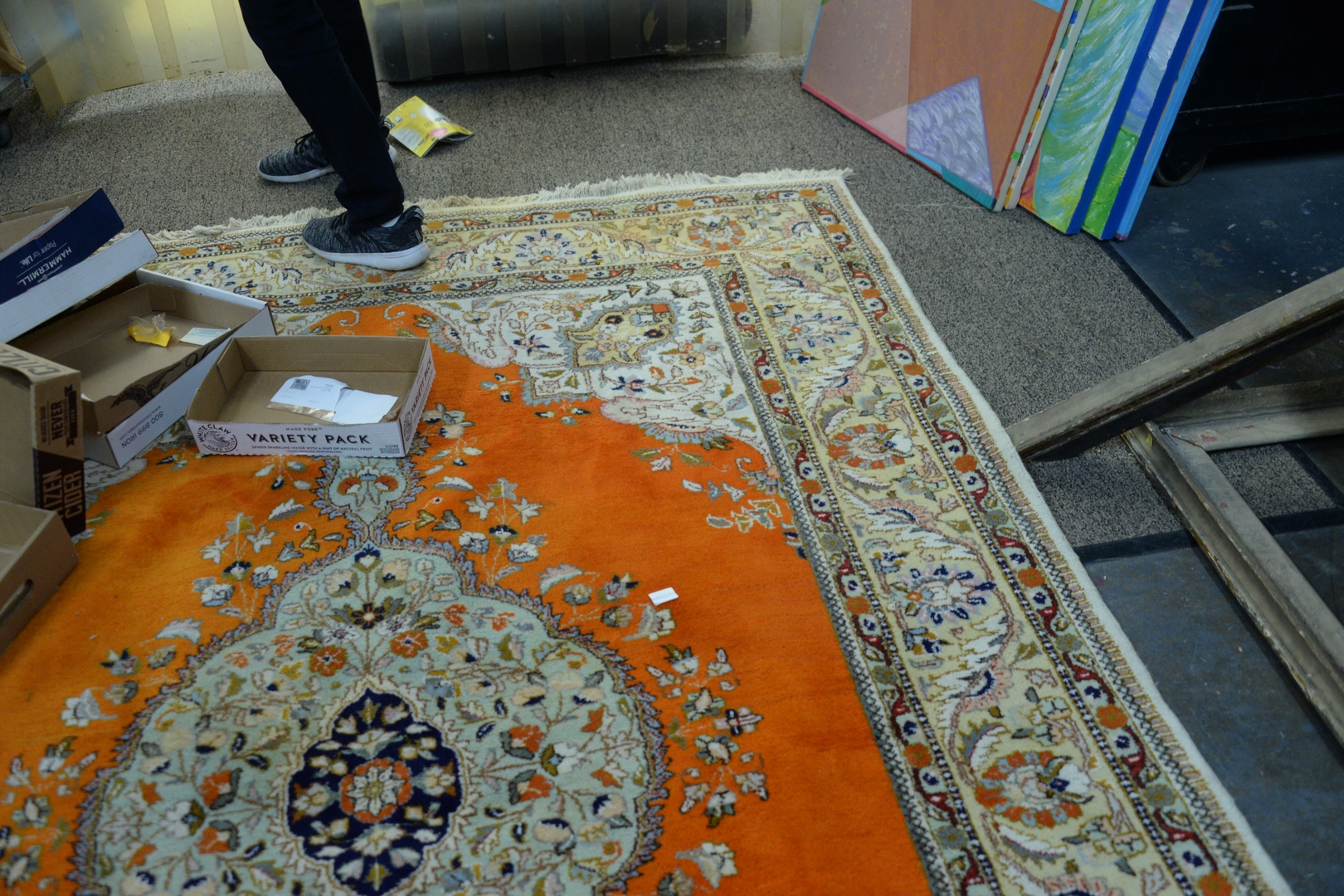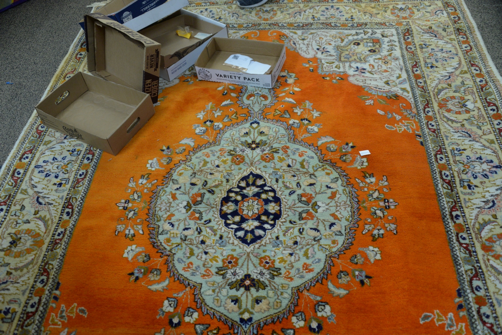 Lot 516: Two Room Size Carpets, to include Oriental with orange ground, 6′ 8″ x 10′; along with light tan, custom carpet, 8′ x 10′ 6″. Provenance: From the Robert Cerciello Collection, West Hartford, Connecticut.