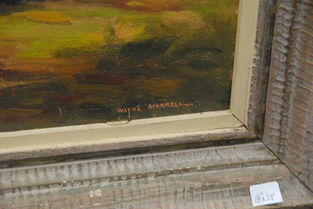 Lot 516: Wayne Beam Morrell b. 1923 SUNNY SPRING LANDSCAPE WITH BARN oil on board signed lower right Wayne Morrell 18…