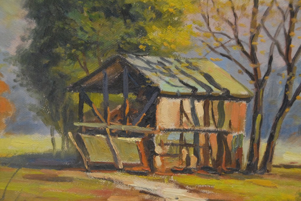 Wayne Beam Morrell b. 1923 SUNNY SPRING LANDSCAPE WITH BARN oil on board signed lower right Wayne Morrell 18 x 24