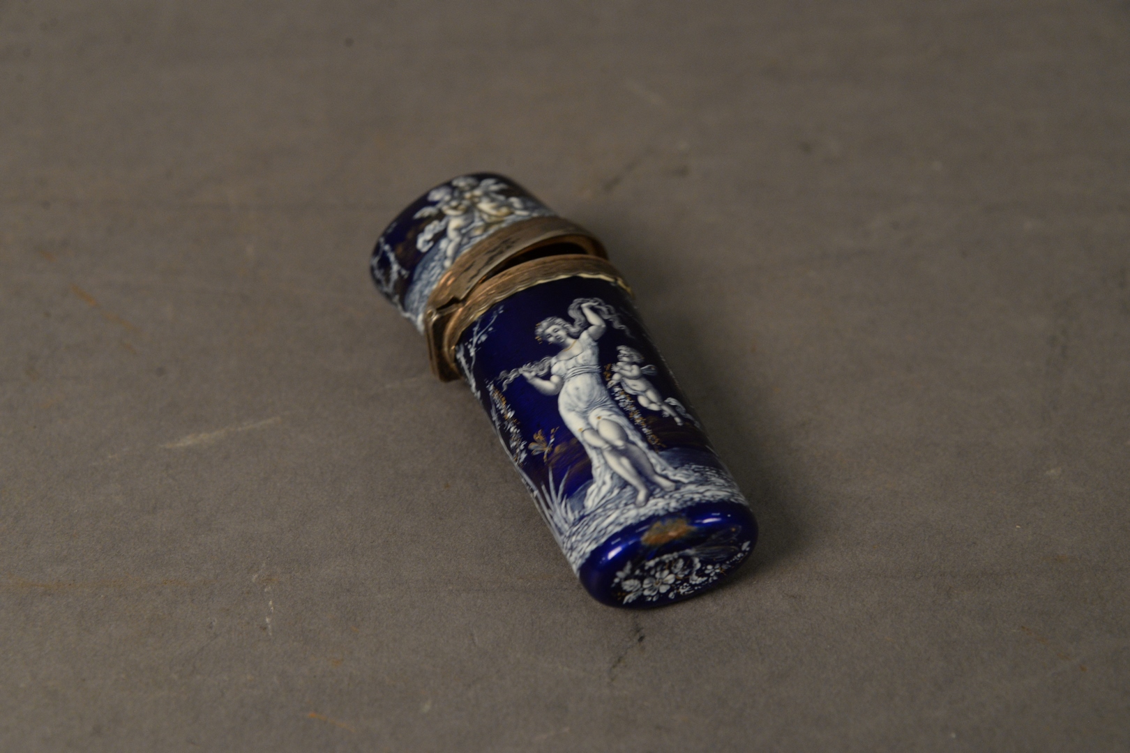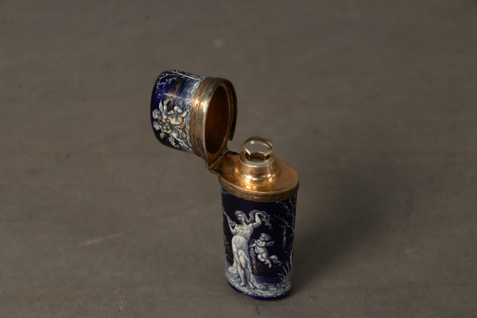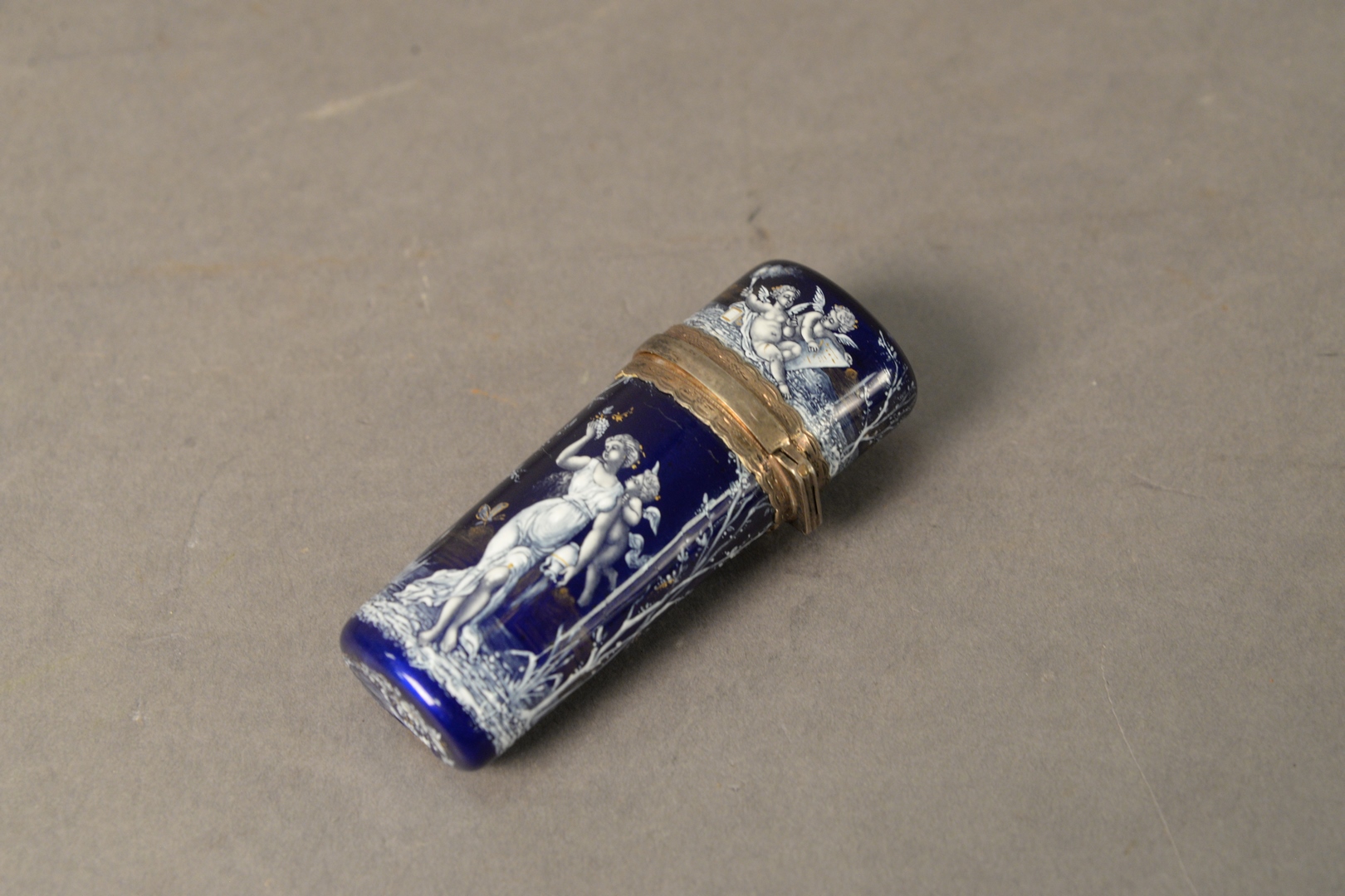 Lot 517: Enameled Perfume Bottle having cobalt blue enamel with white and gilt gold painted figures, opening to glass stopper and gold wash i…