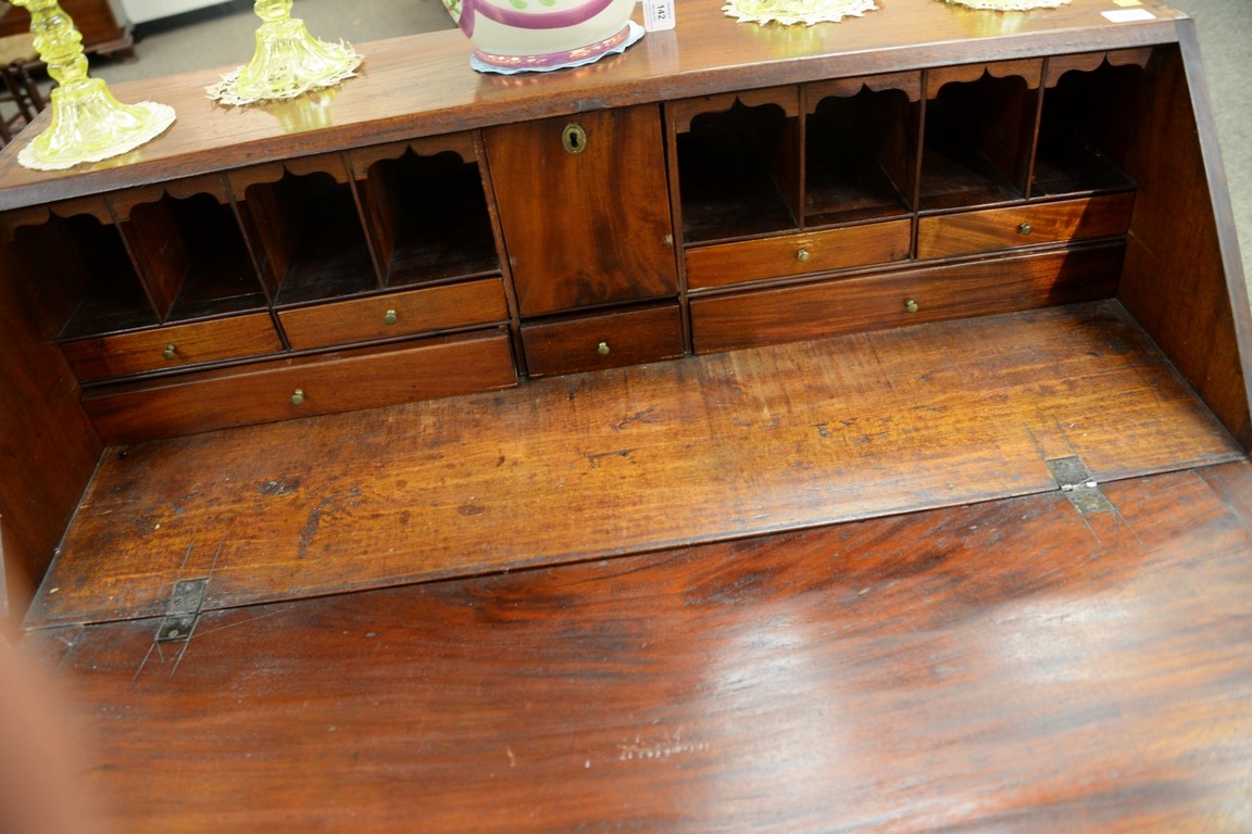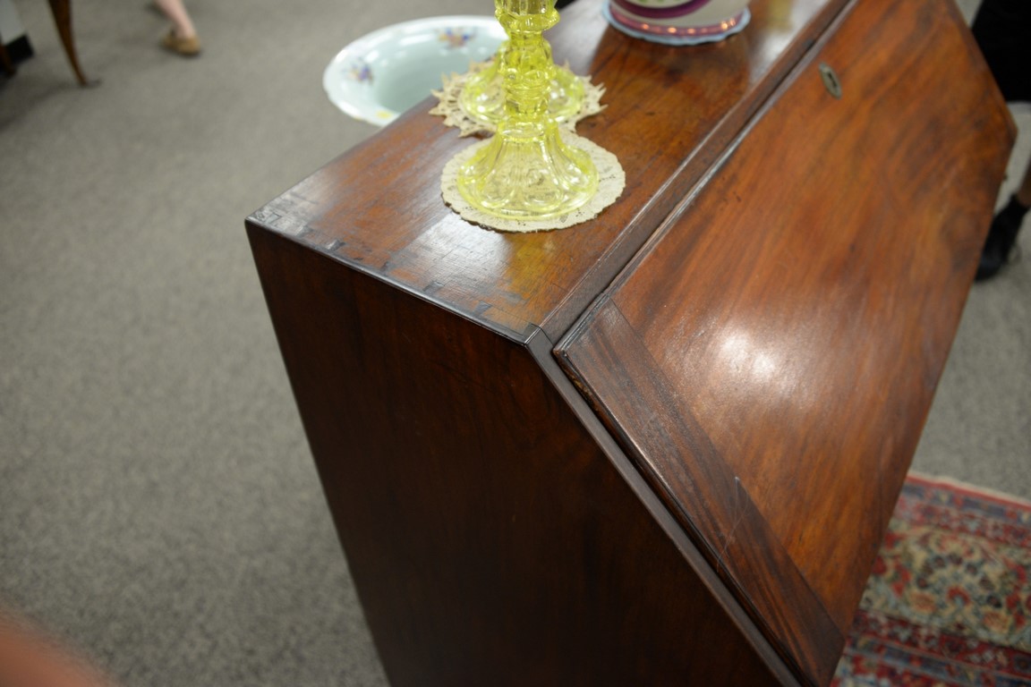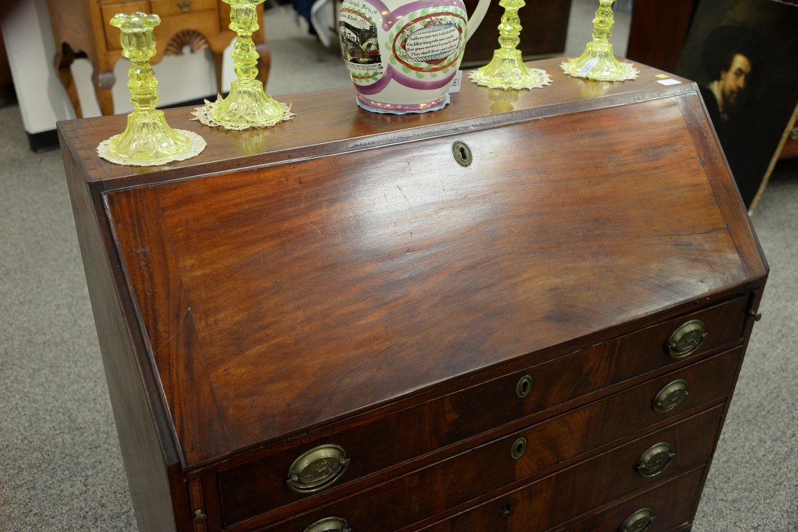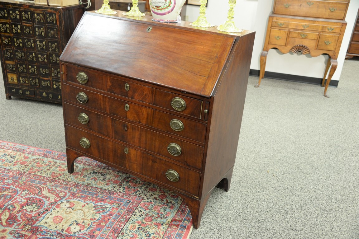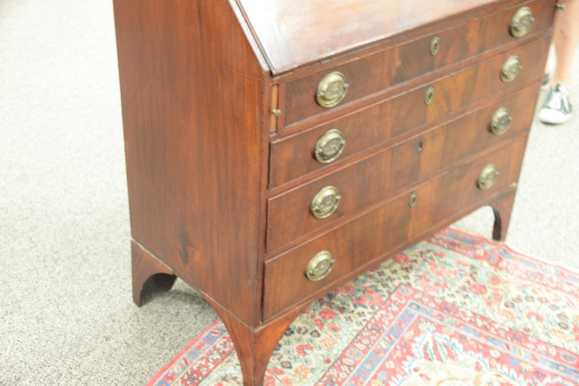 Lot 517: Federal mahogany desk having slant lid over four drawers set on bracket feet, circa 1790. ht. 43in., wd. 42in.