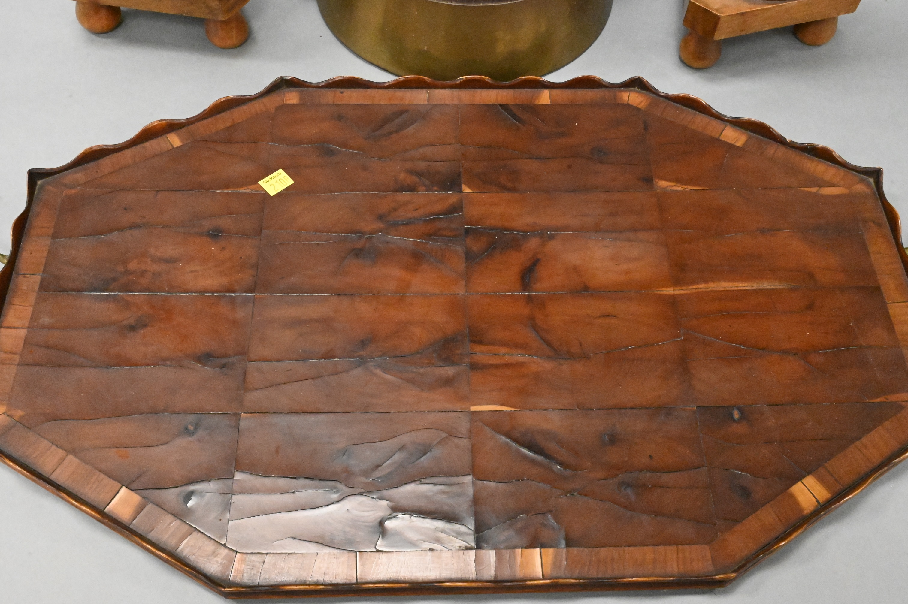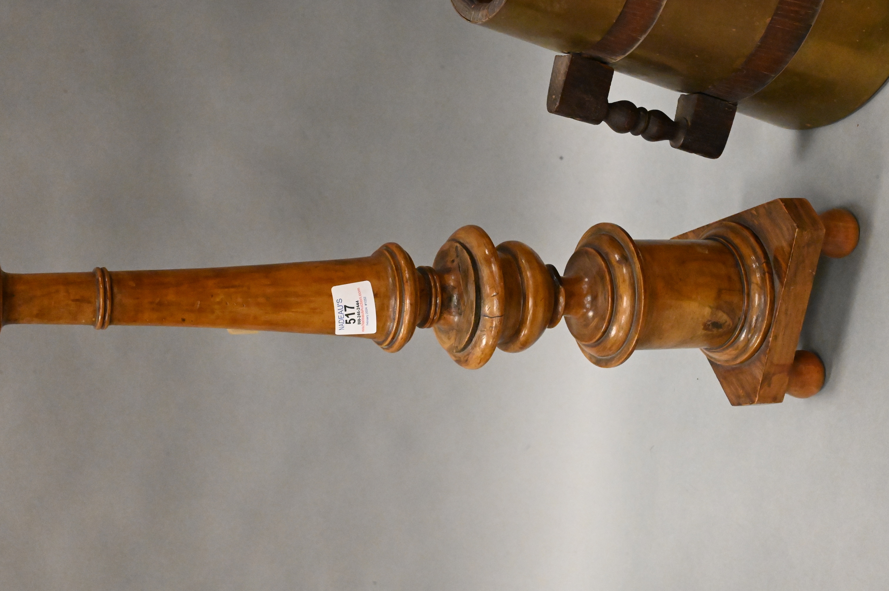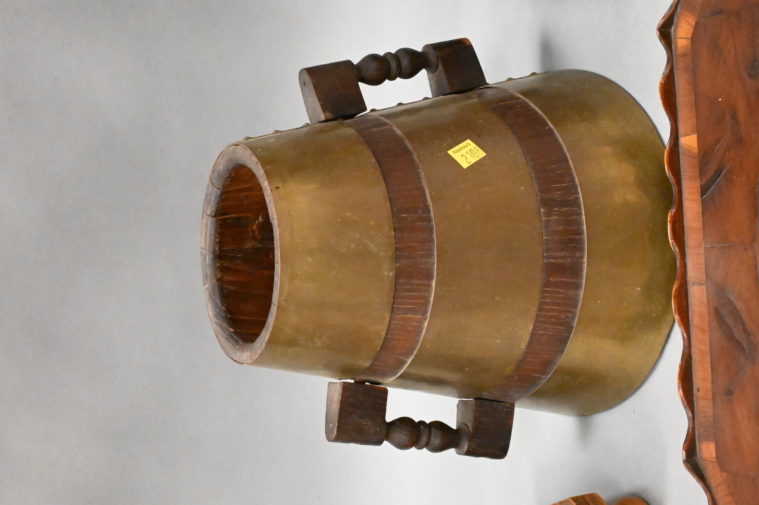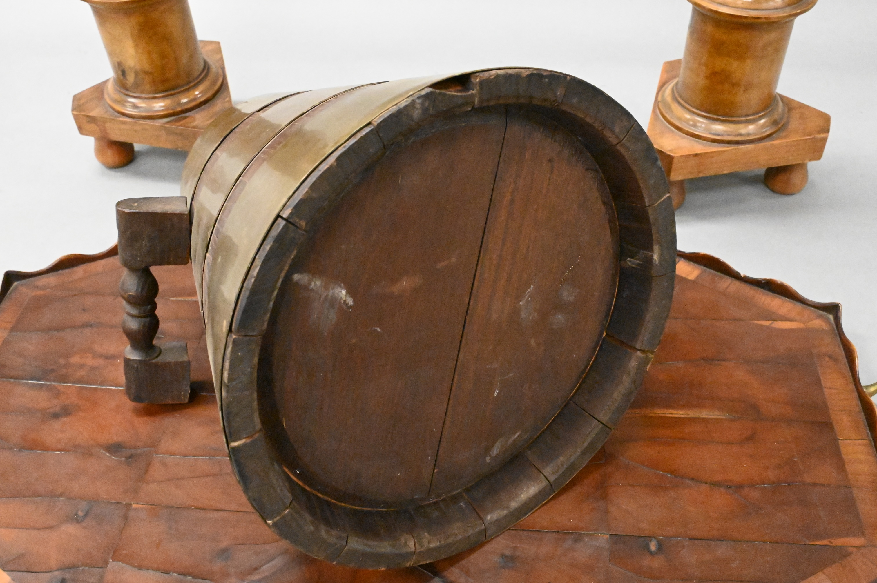 to include veneer tray, a pair of turned wood prickets and a brass bound oak barrel