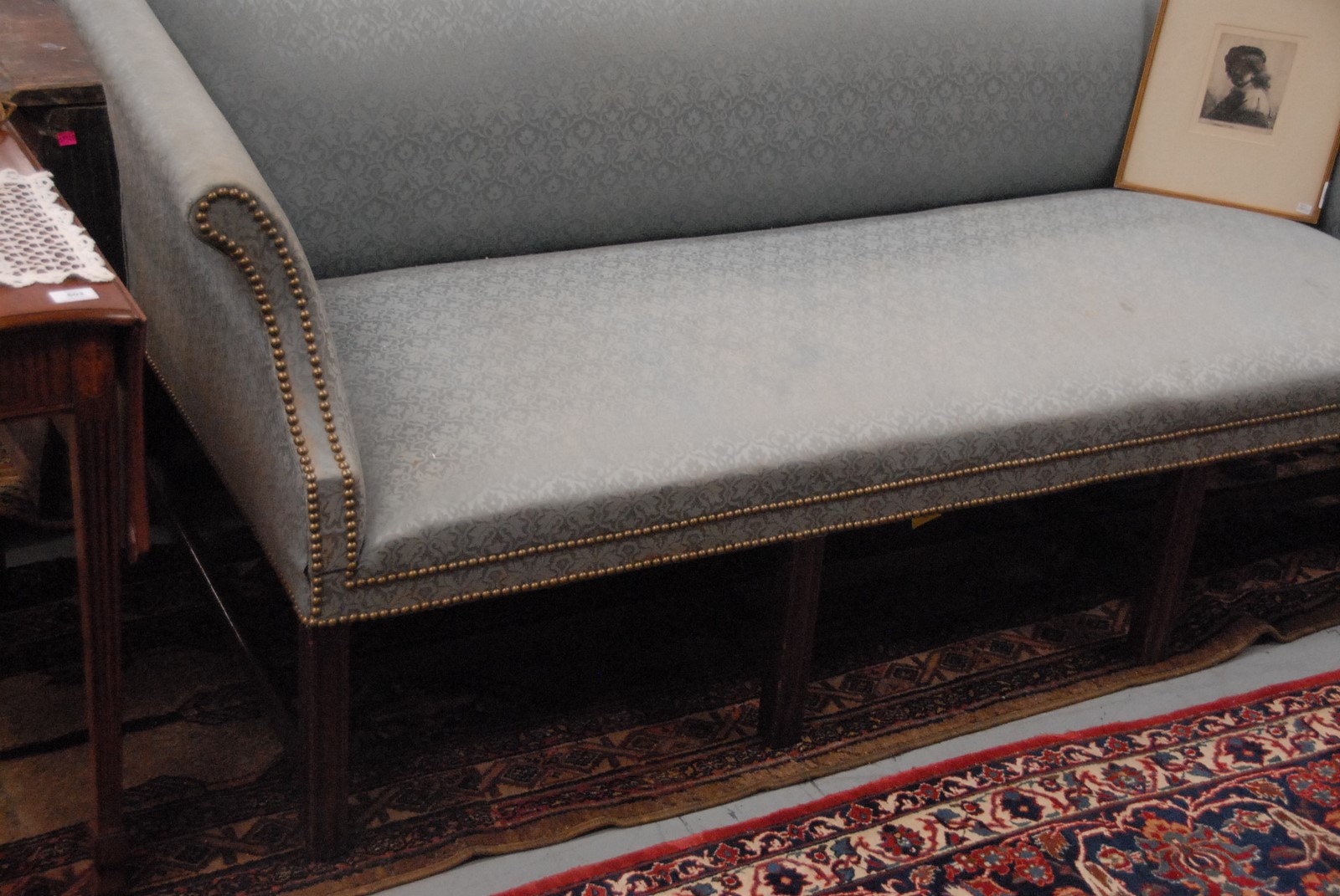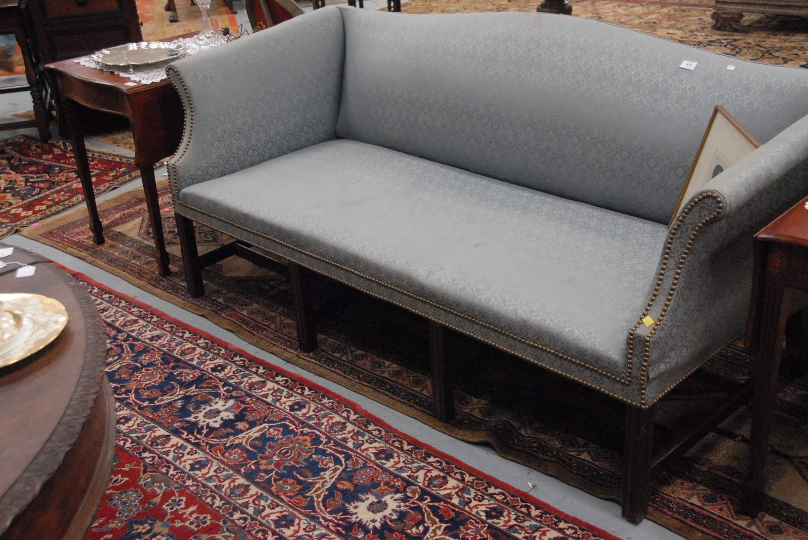Lot 517: George III upholstered sofa with camel back and upholstered seat on eight legs, front legs square and molded with stretchers, English probably 18th century. wd. 74 in.