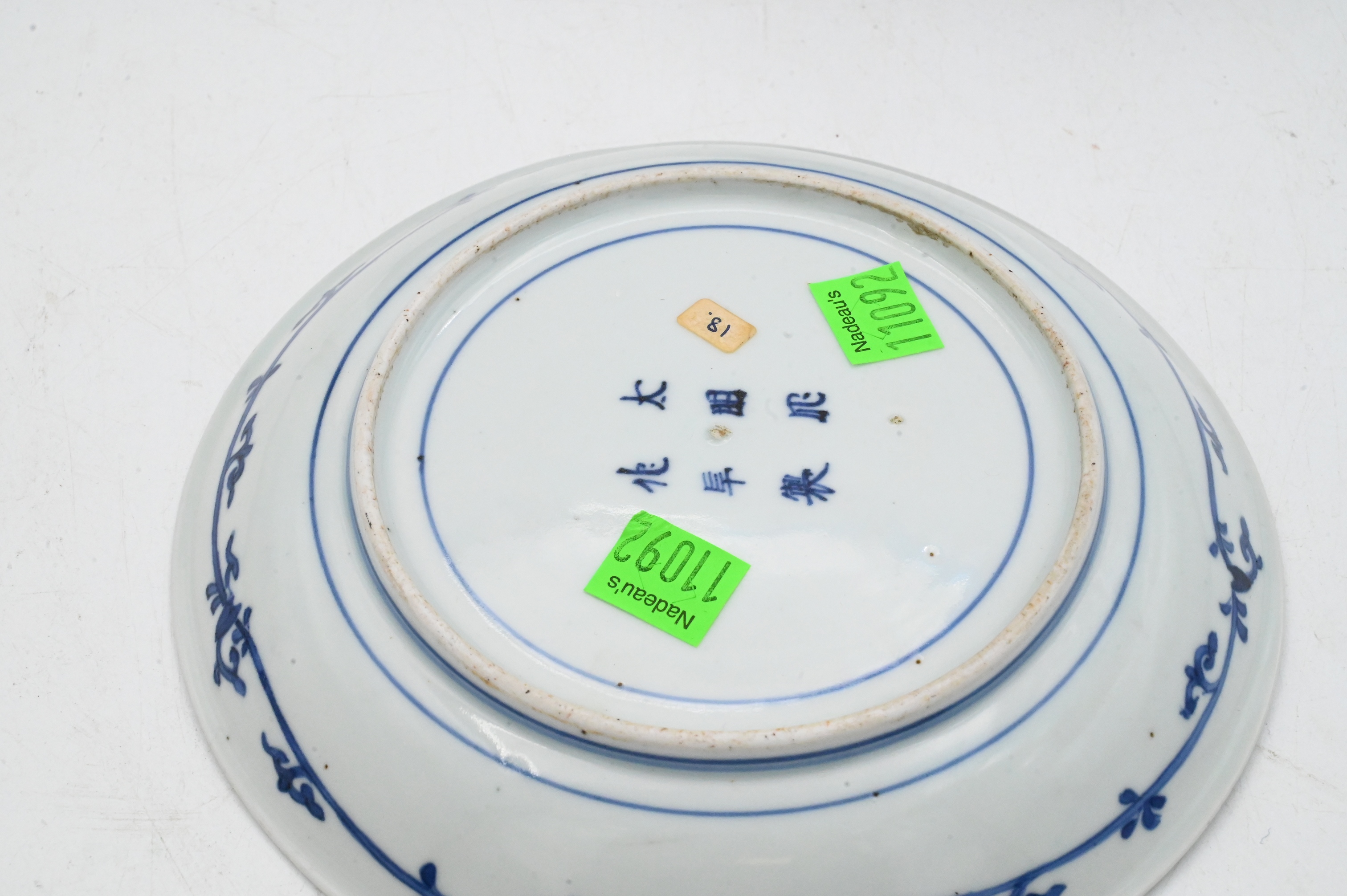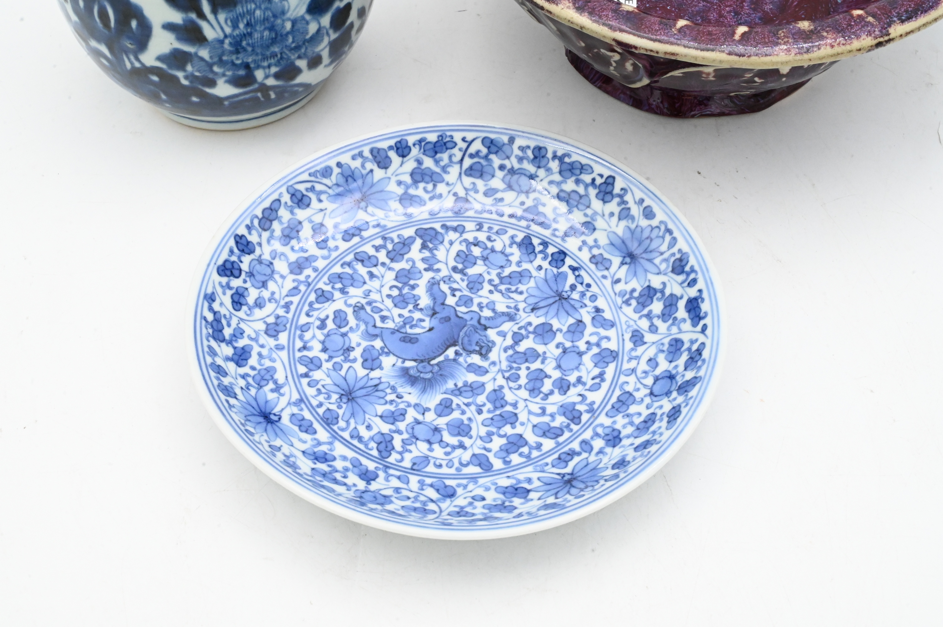 A Chinese red-glazed porcelain bowl with mottled purple-red glaze pooling to cream at the rim and base. Diameter 9 1/4 inches, a Chinese blue and white porcelain bottle vase, painted in underglaze blue with phoenix and peony motifs above a lappet border, with banded decoration at the neck. Height 9 inches along with a Chinese blue and white porcelain dish decorated with dense floral scrollwork within double-line borders. Diameter 7 inches