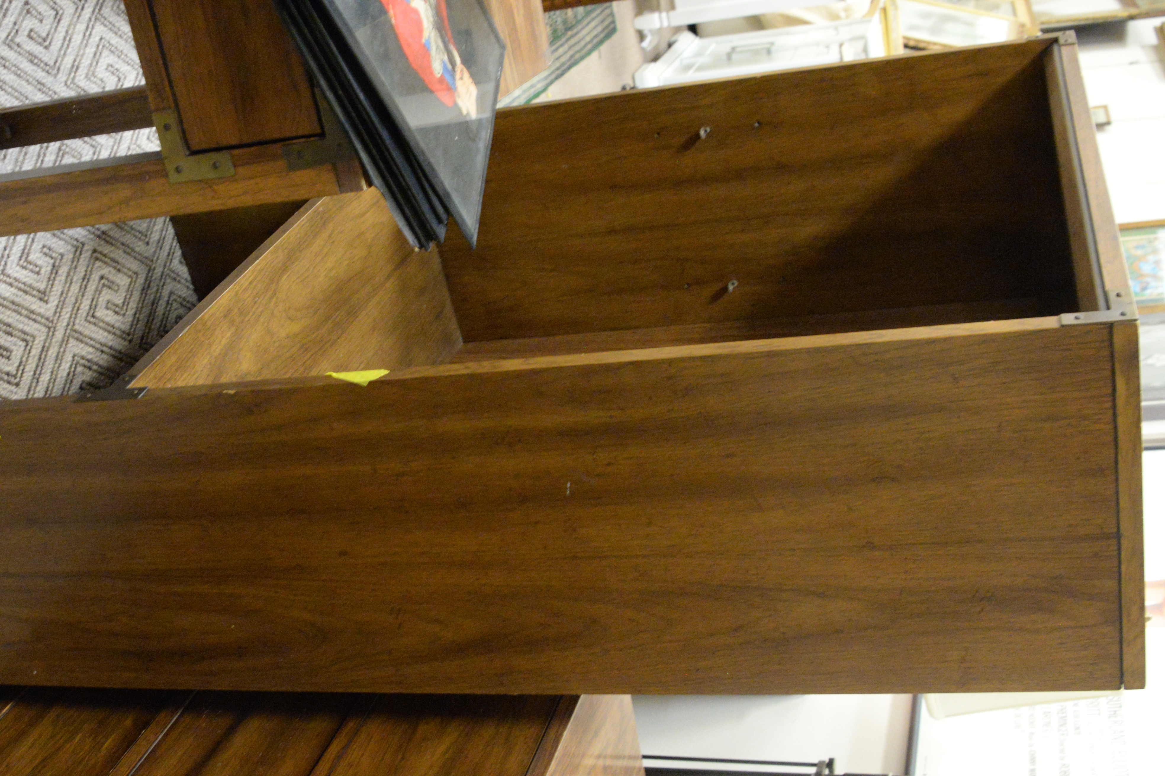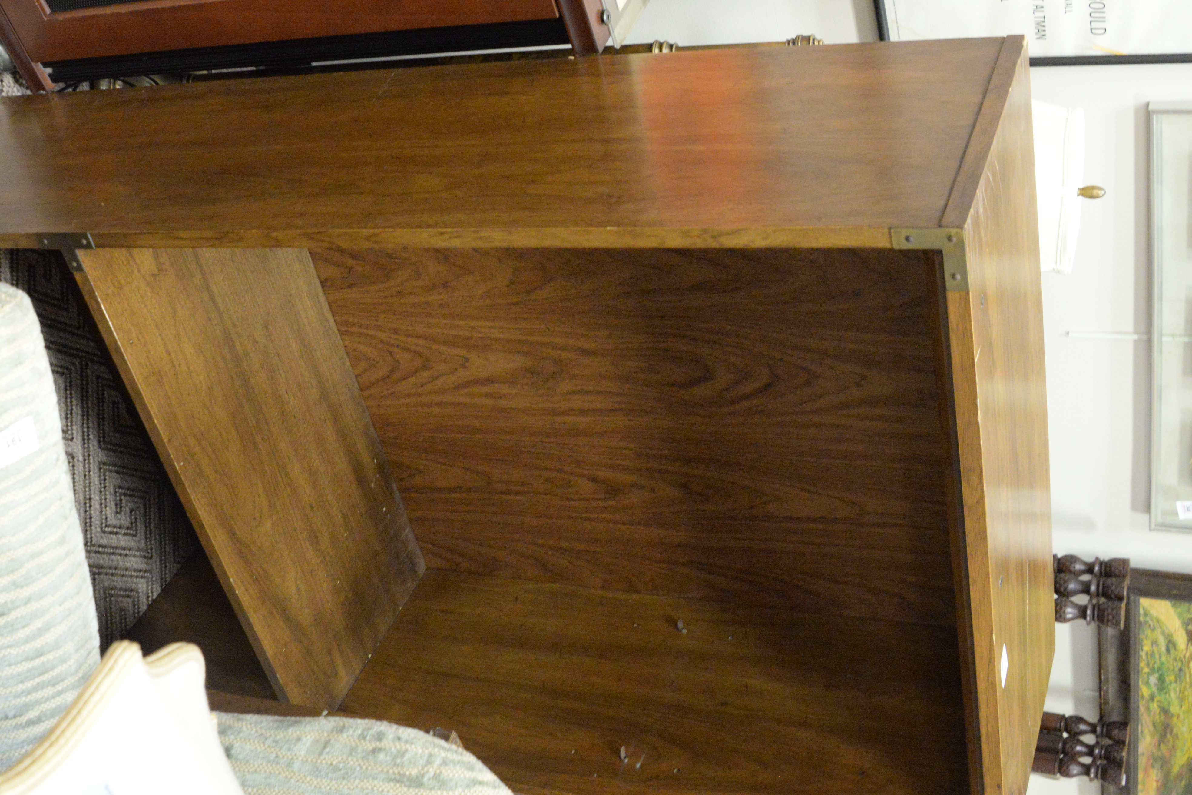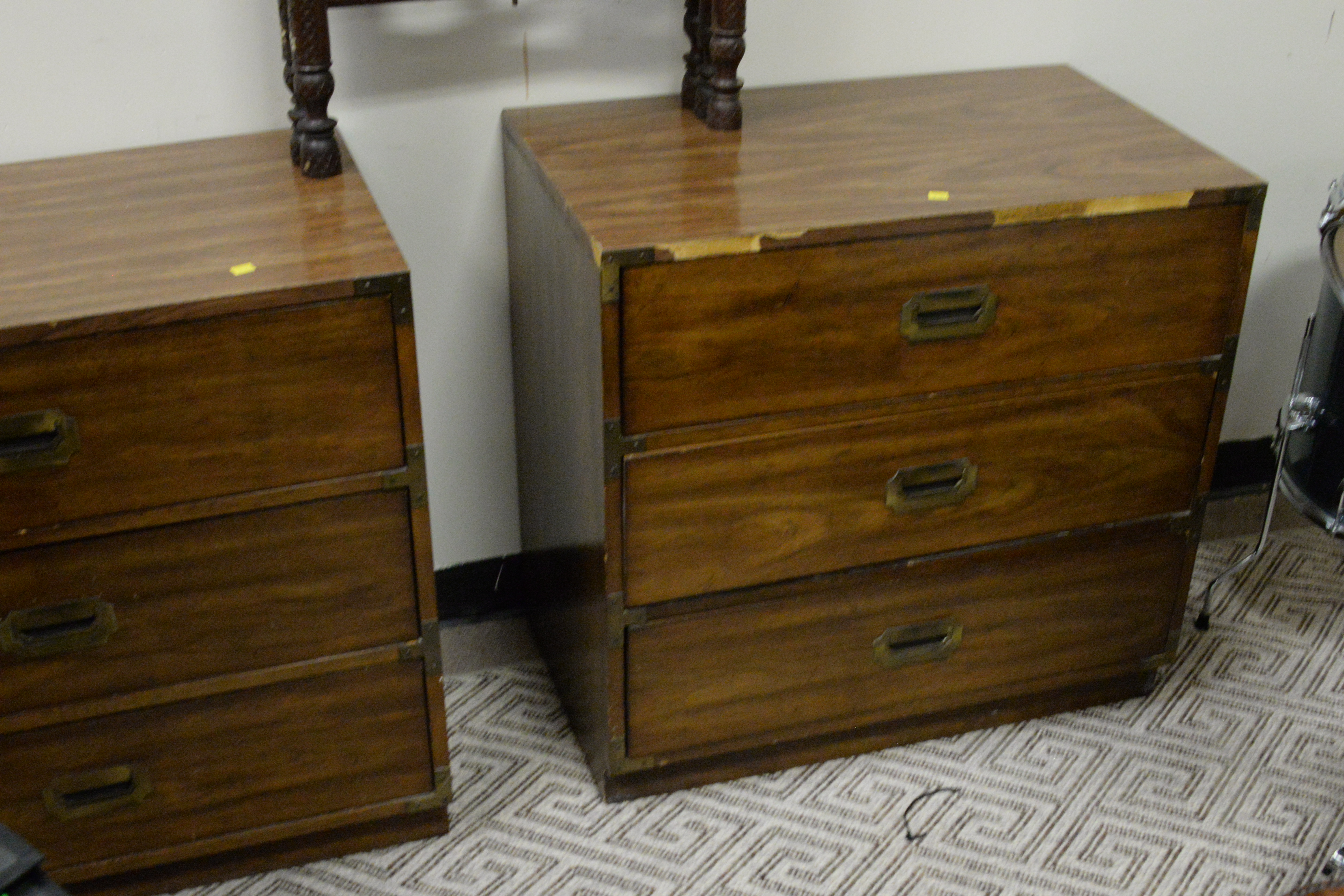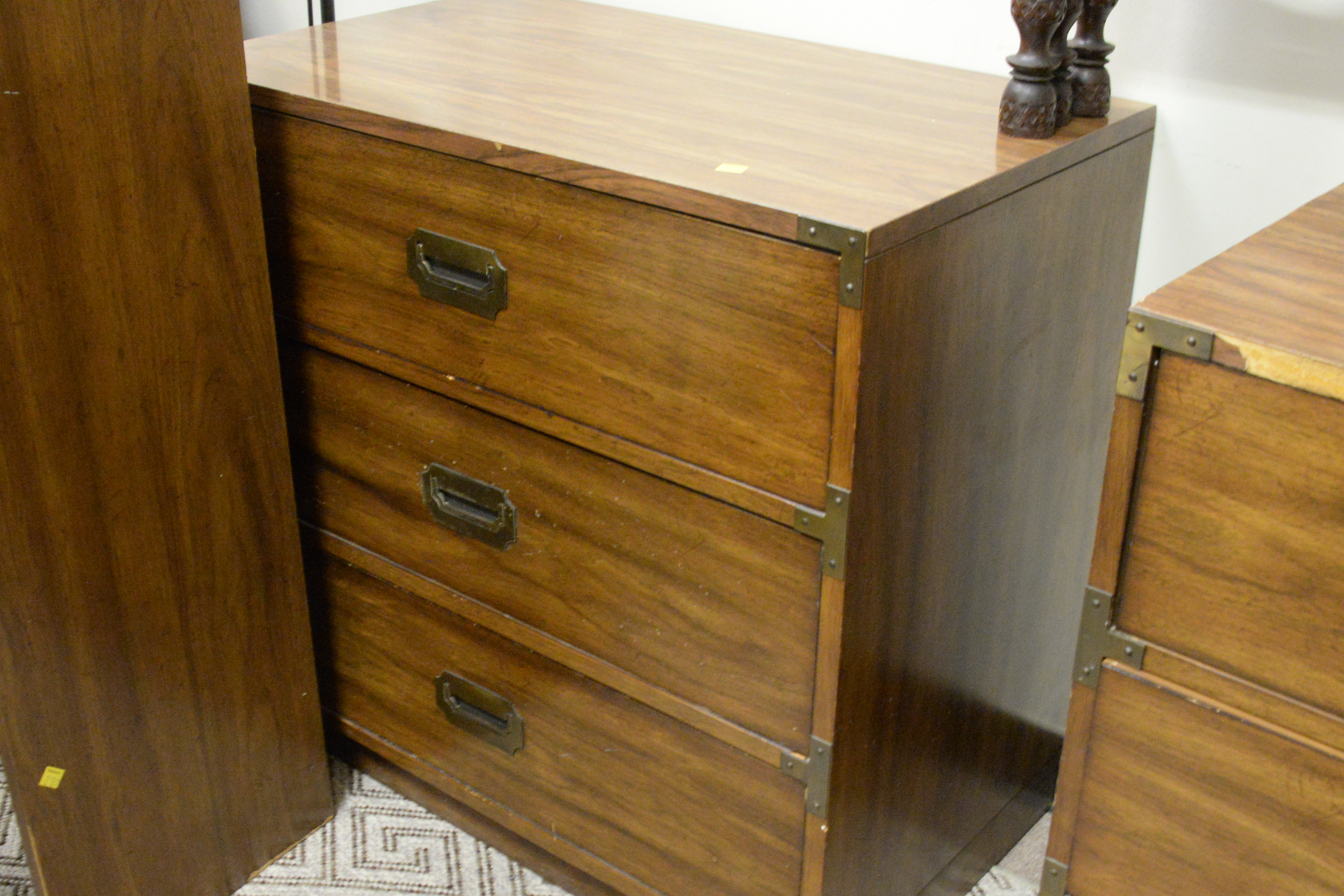 Three Piece Campaign Furniture lot to include, pair of two part bookcases along with three drawer chest, height 68 inches, width 30 inches