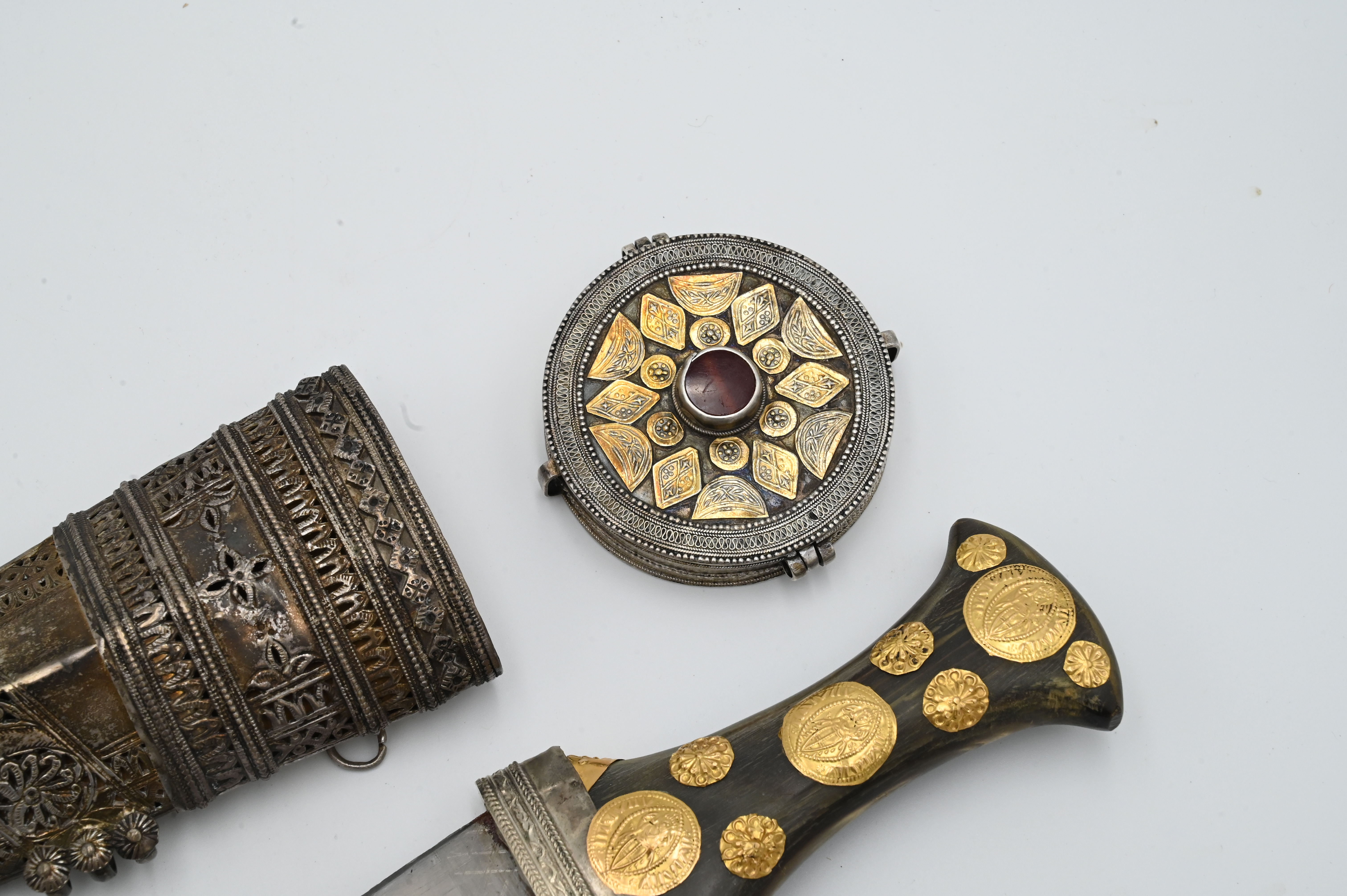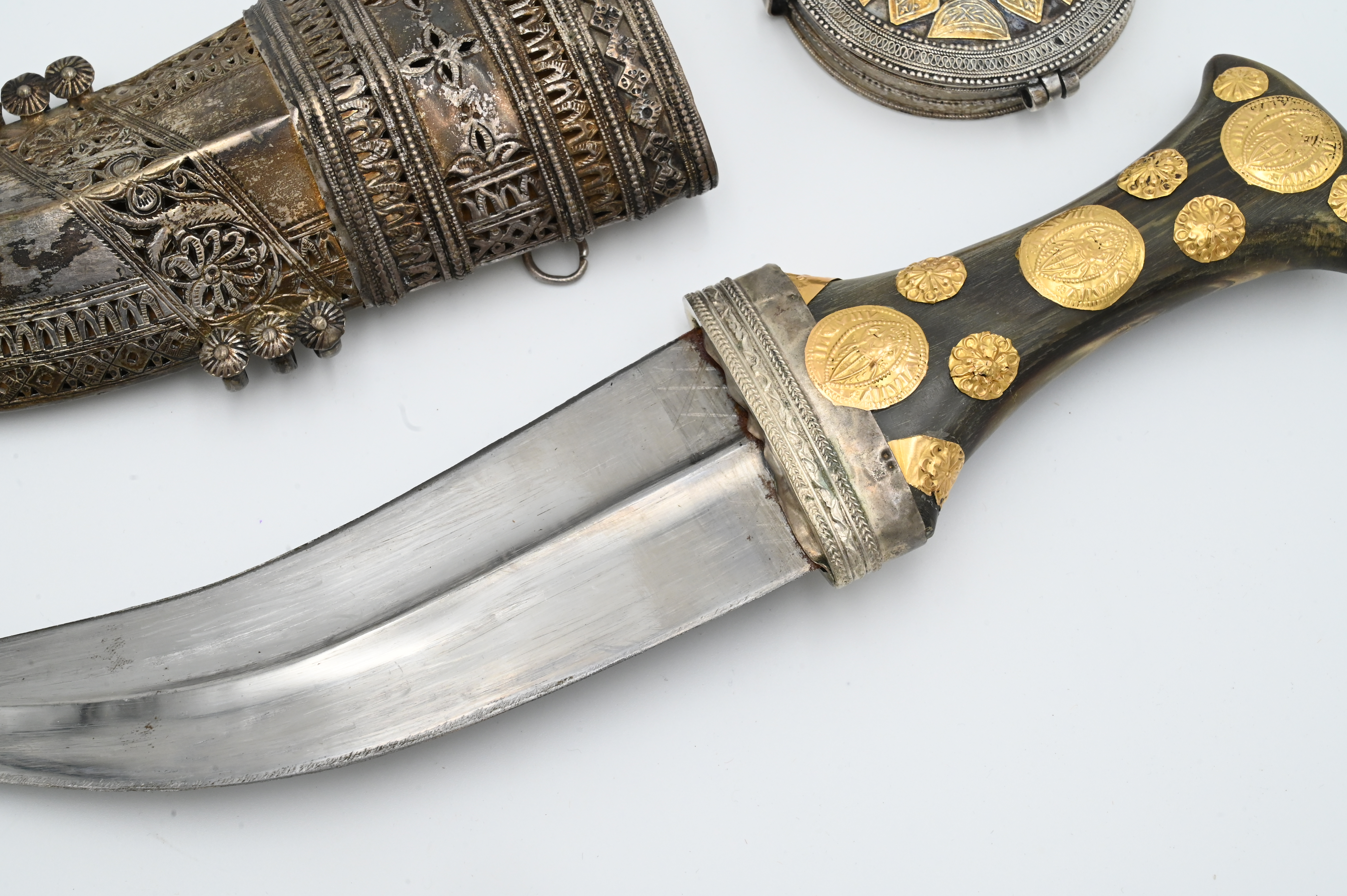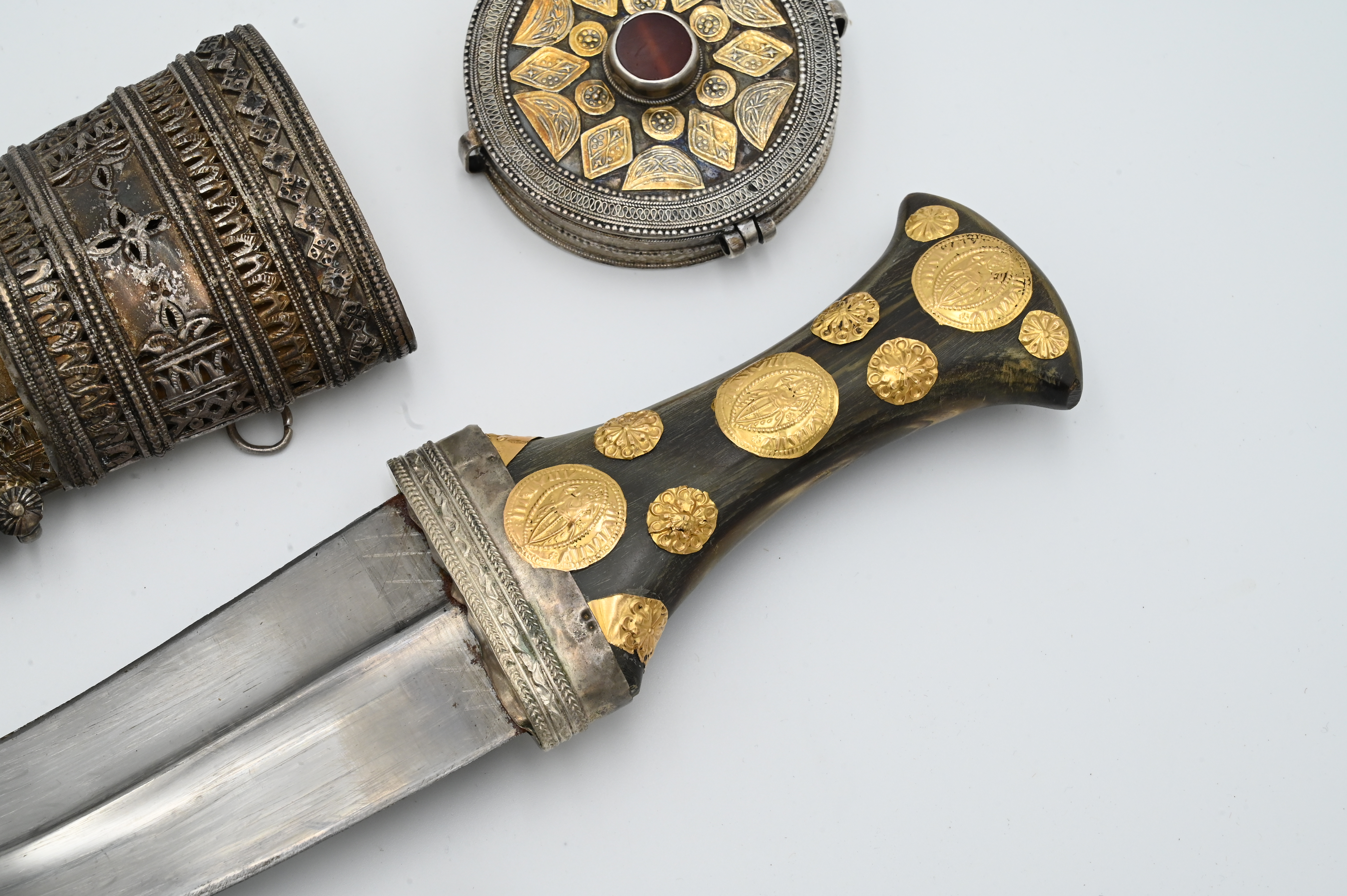 including presentation dagger, length 13 1/4 inches, having horn handle with silver sheath and gold applied faux coins