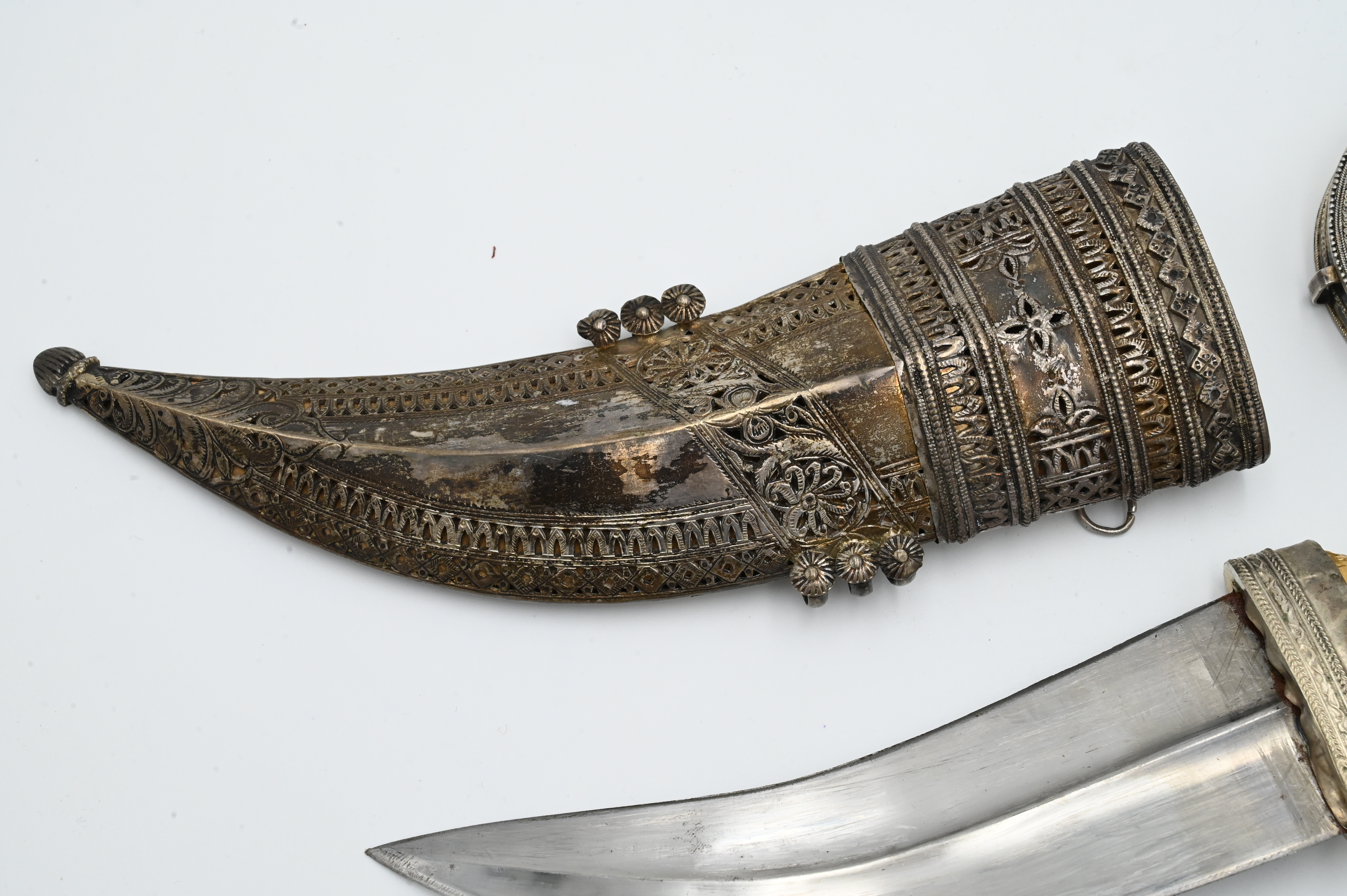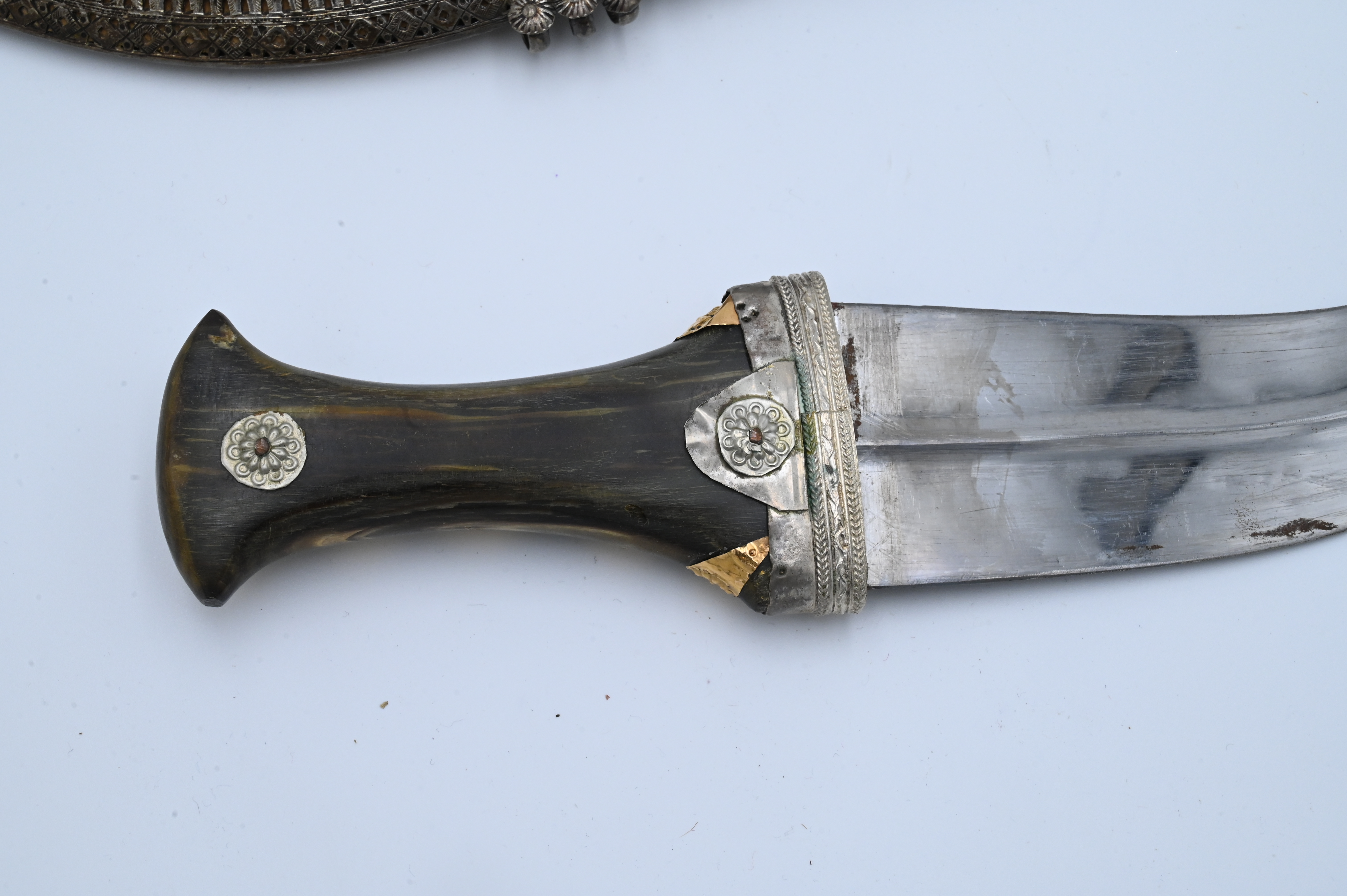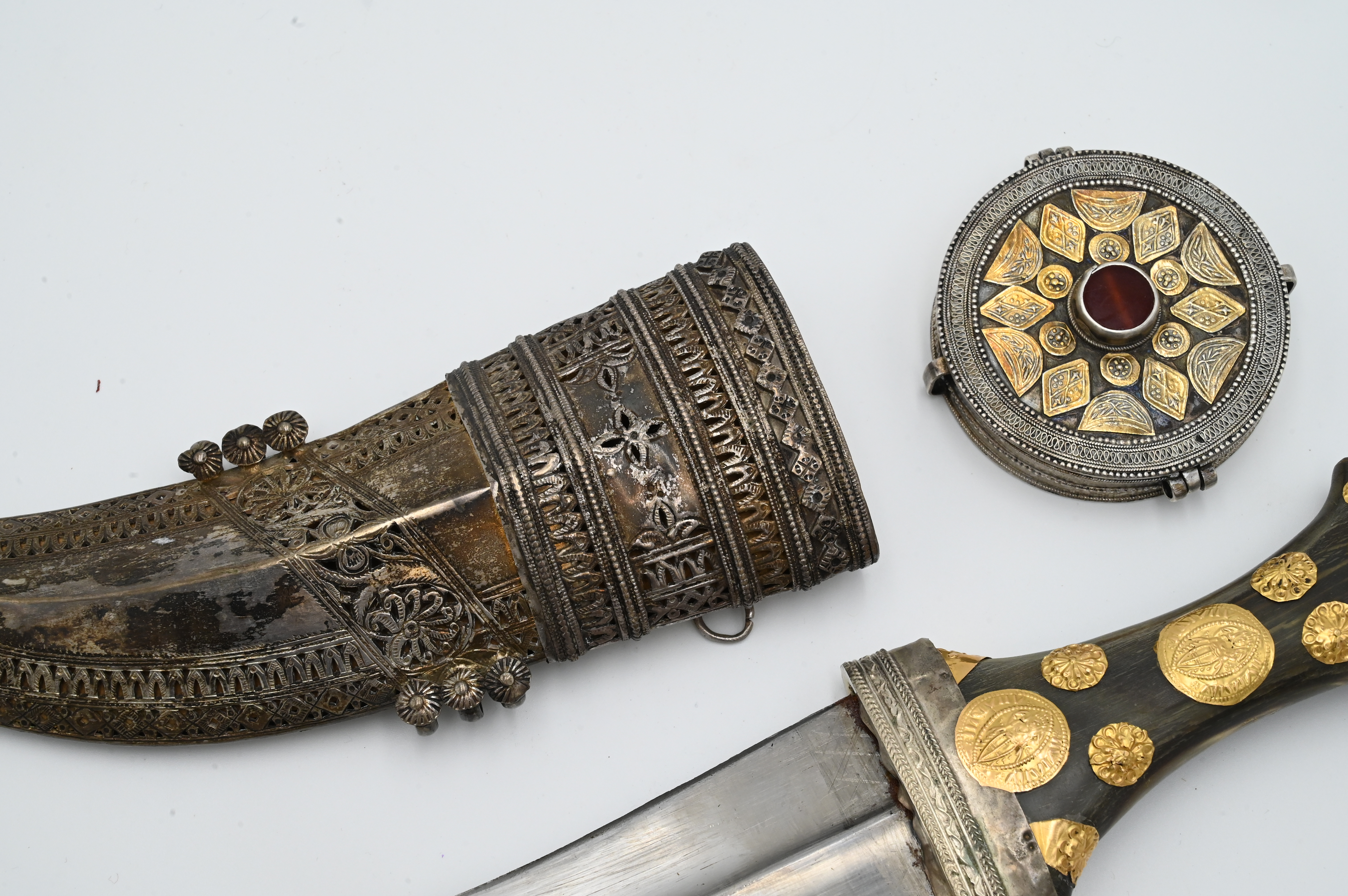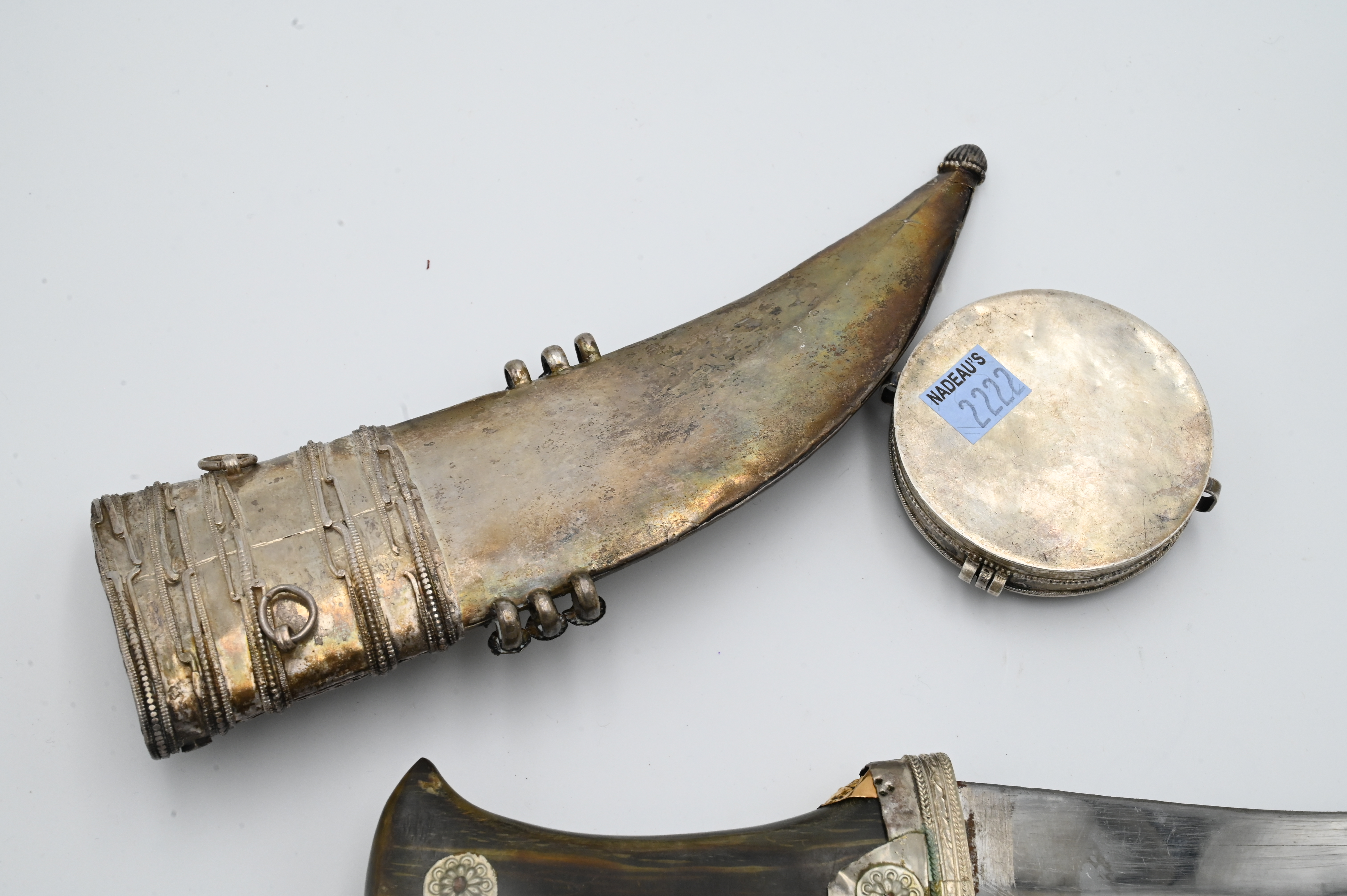 including presentation dagger, length 13 1/4 inches, having horn handle with silver sheath and gold applied faux coins