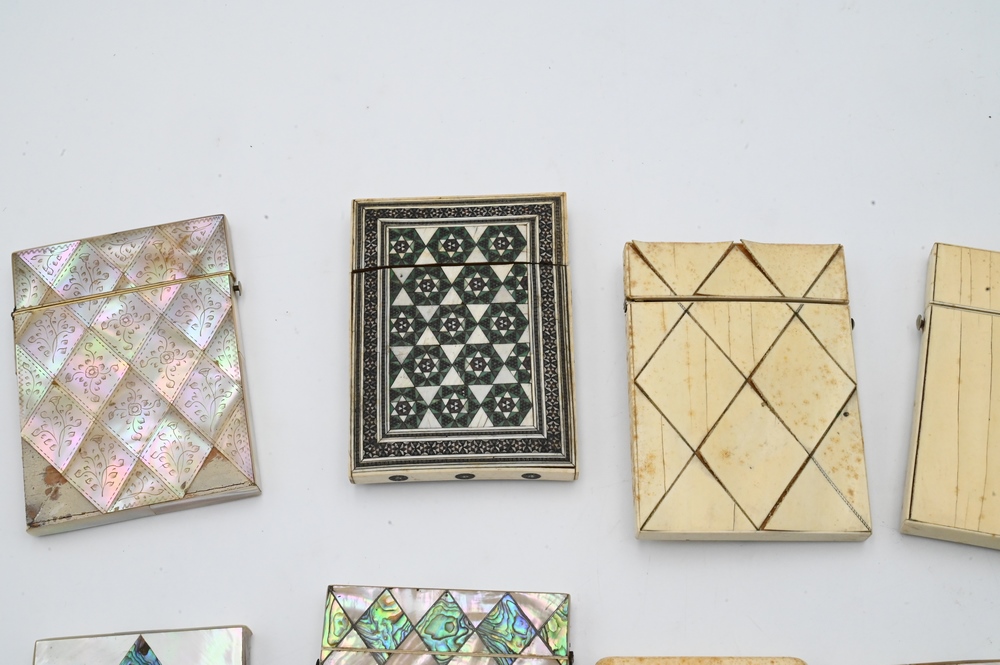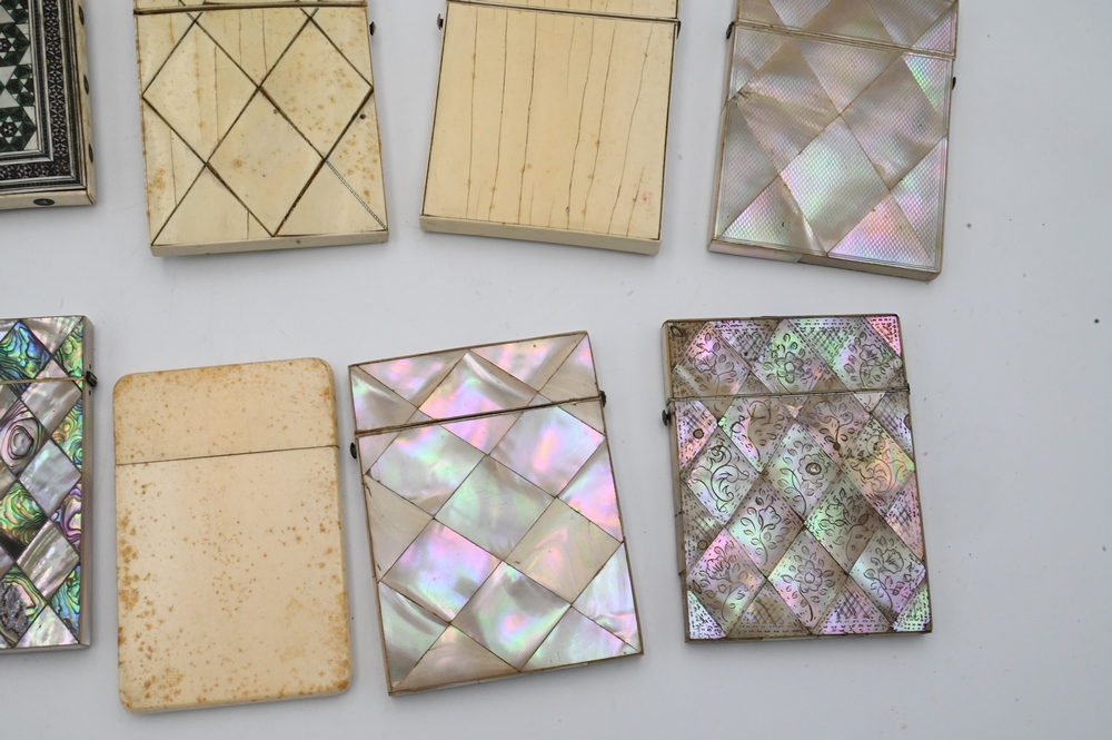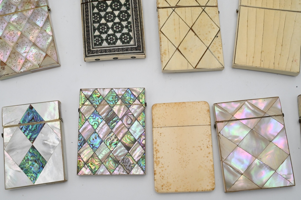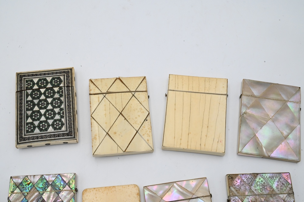 Collection of 10 Cigarette Cases or Boxes, to include 6 mother of pearl , along with four bone or other materials; largest case 3 1/8″ x 4″. Please note: Items containing ivory cannot be purchased or shipped by bidders residing outside of the United States or California, Hawaii, Nevada, New Jersey, New York, Washington, Oregon, or District of Columbia. If an ivory item is purchased by a bidder in one of the above mentioned locations or attempts to ship ivory to one of the above mentioned locations, bidder will forfeit the item and be responsible for any incurred fees such as a restocking fee.