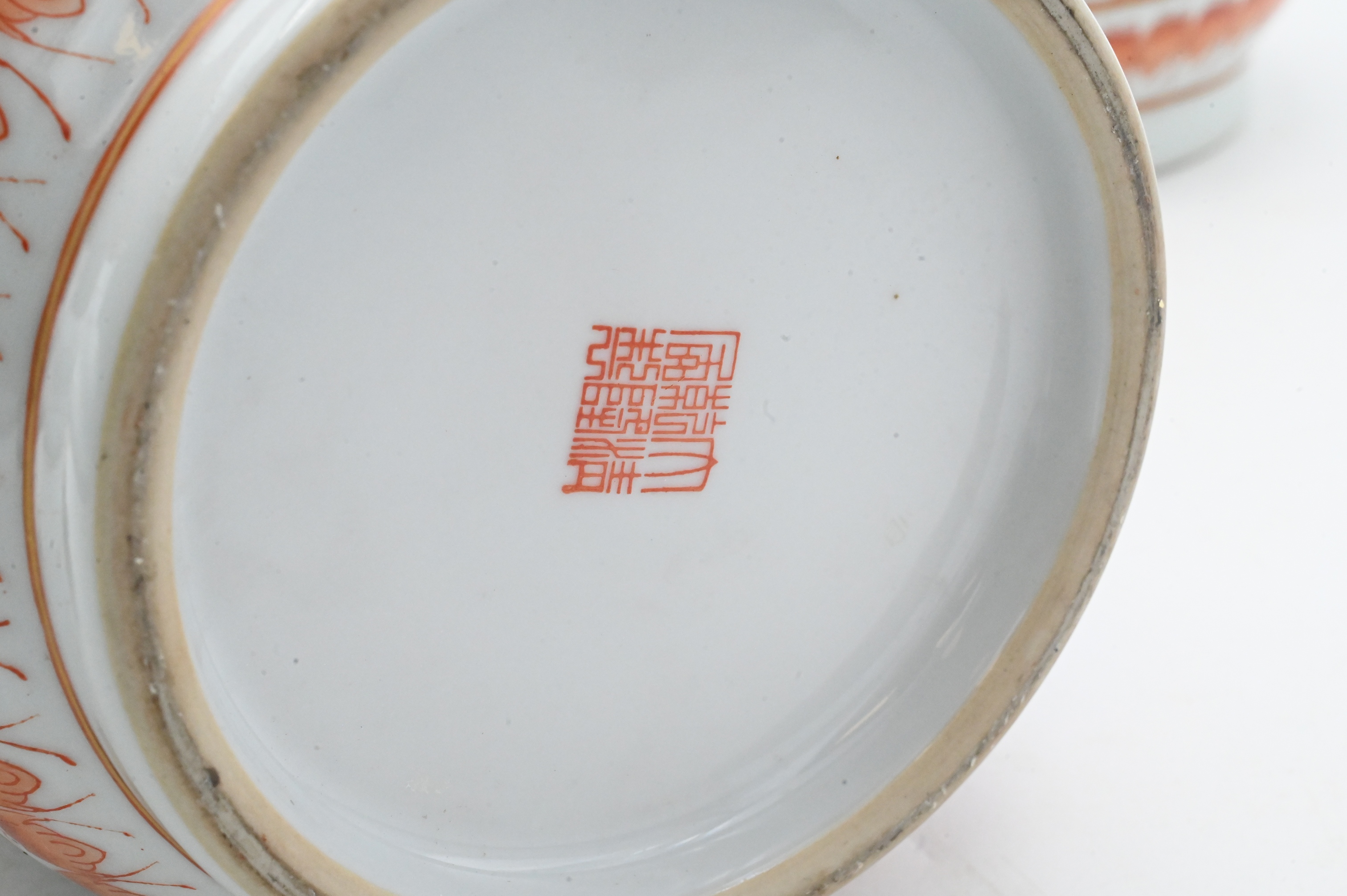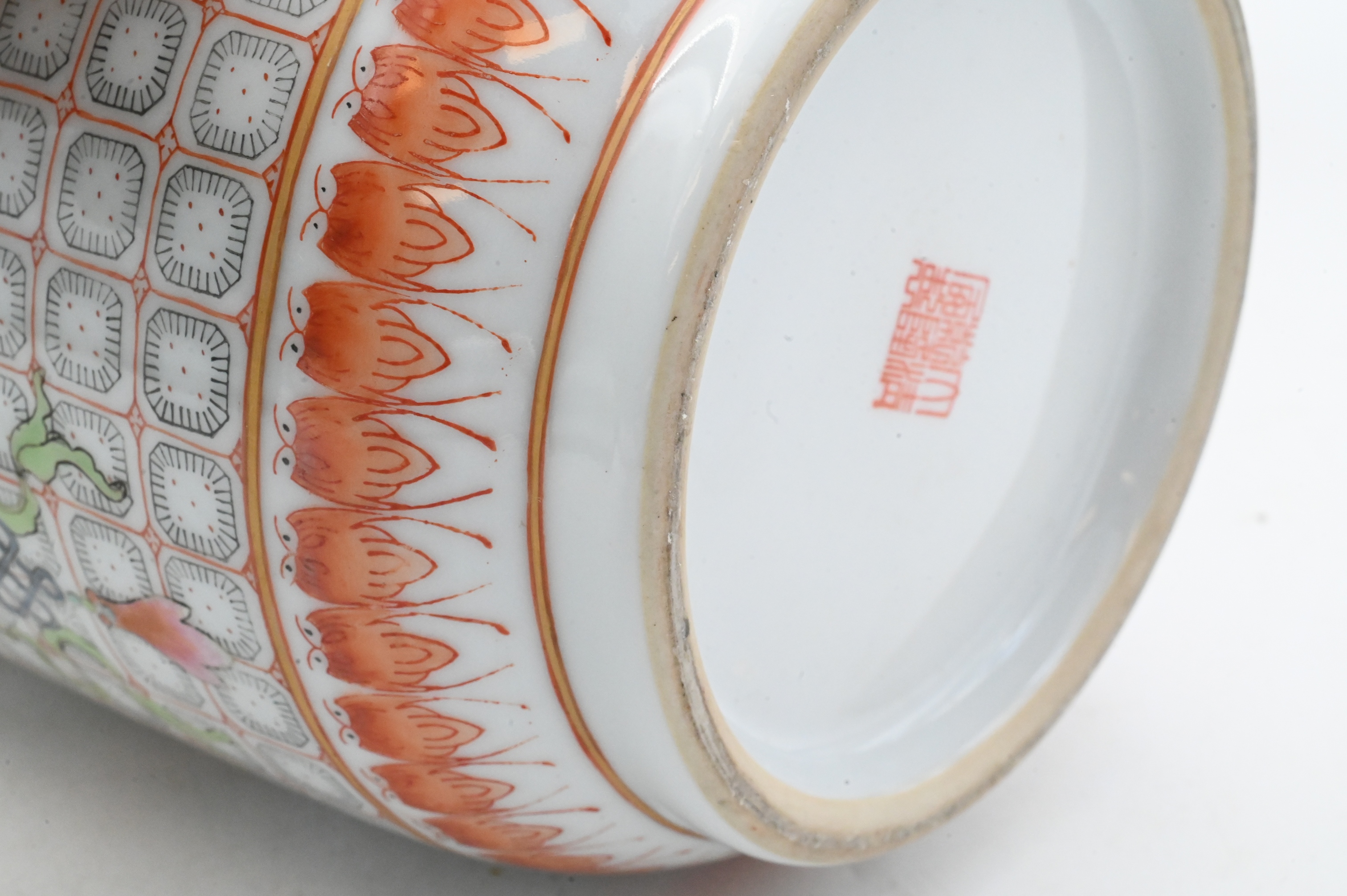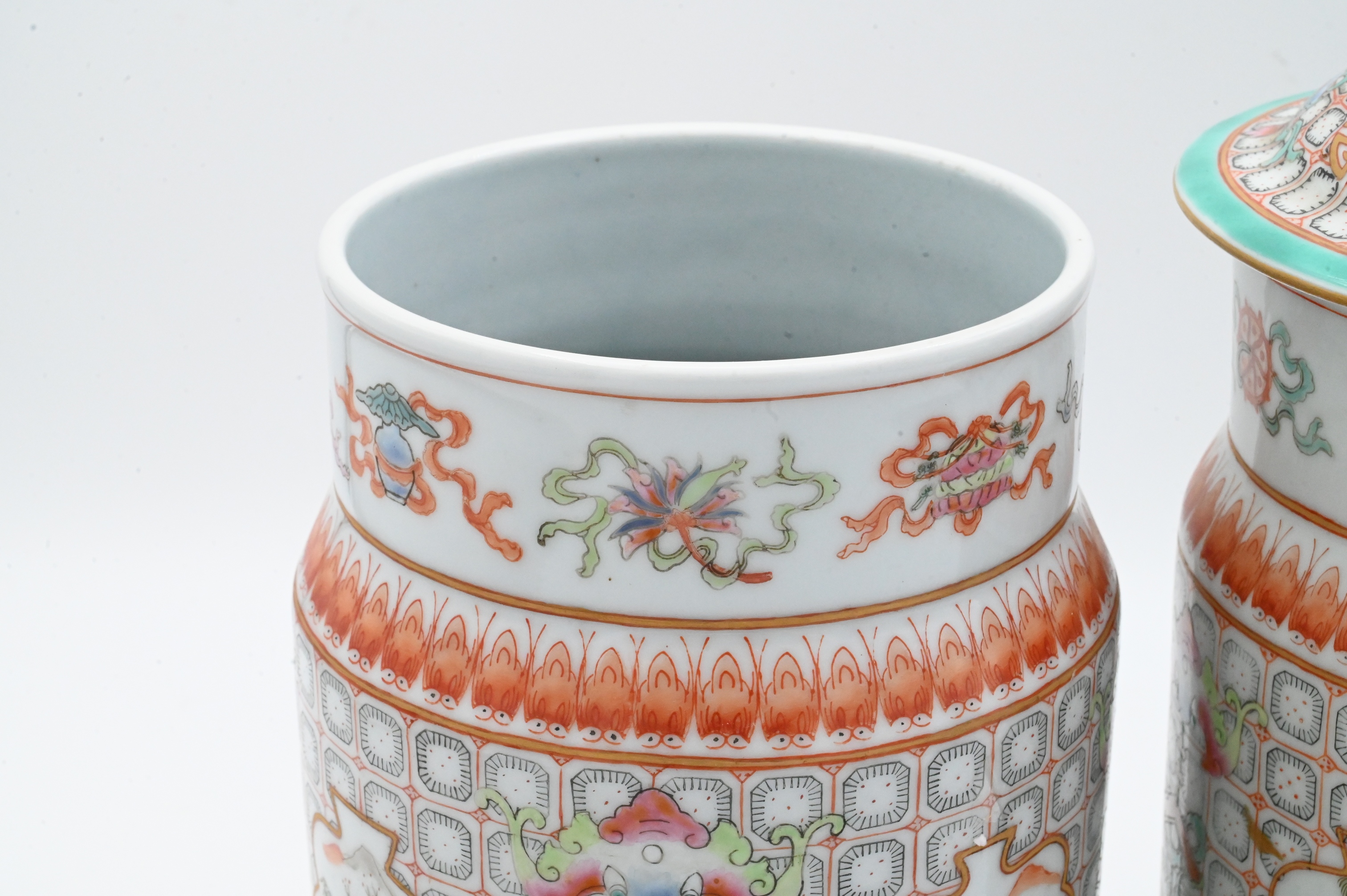 Republic Period, cylindrical porcelain jars with domed covers and gilt finials, each decorated in famille rose enamels with repeating diaper grounds inset with figural landscape cartouches, interspersed with auspicious objects, bats and ribboned emblems.