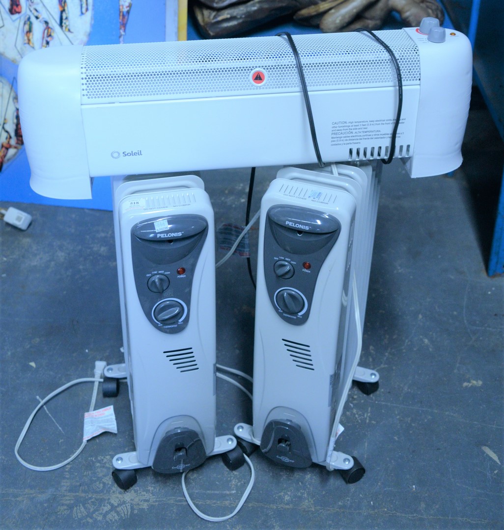 Three Heaters, to include two Pelonis space heaters, new retails for $100 each; along with a Soleil heater.
