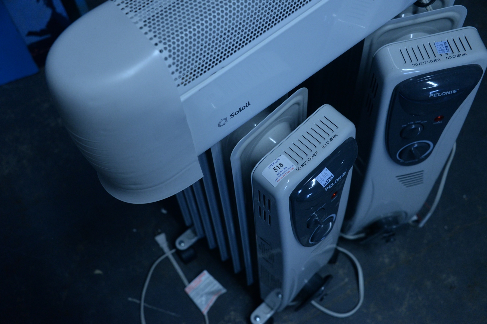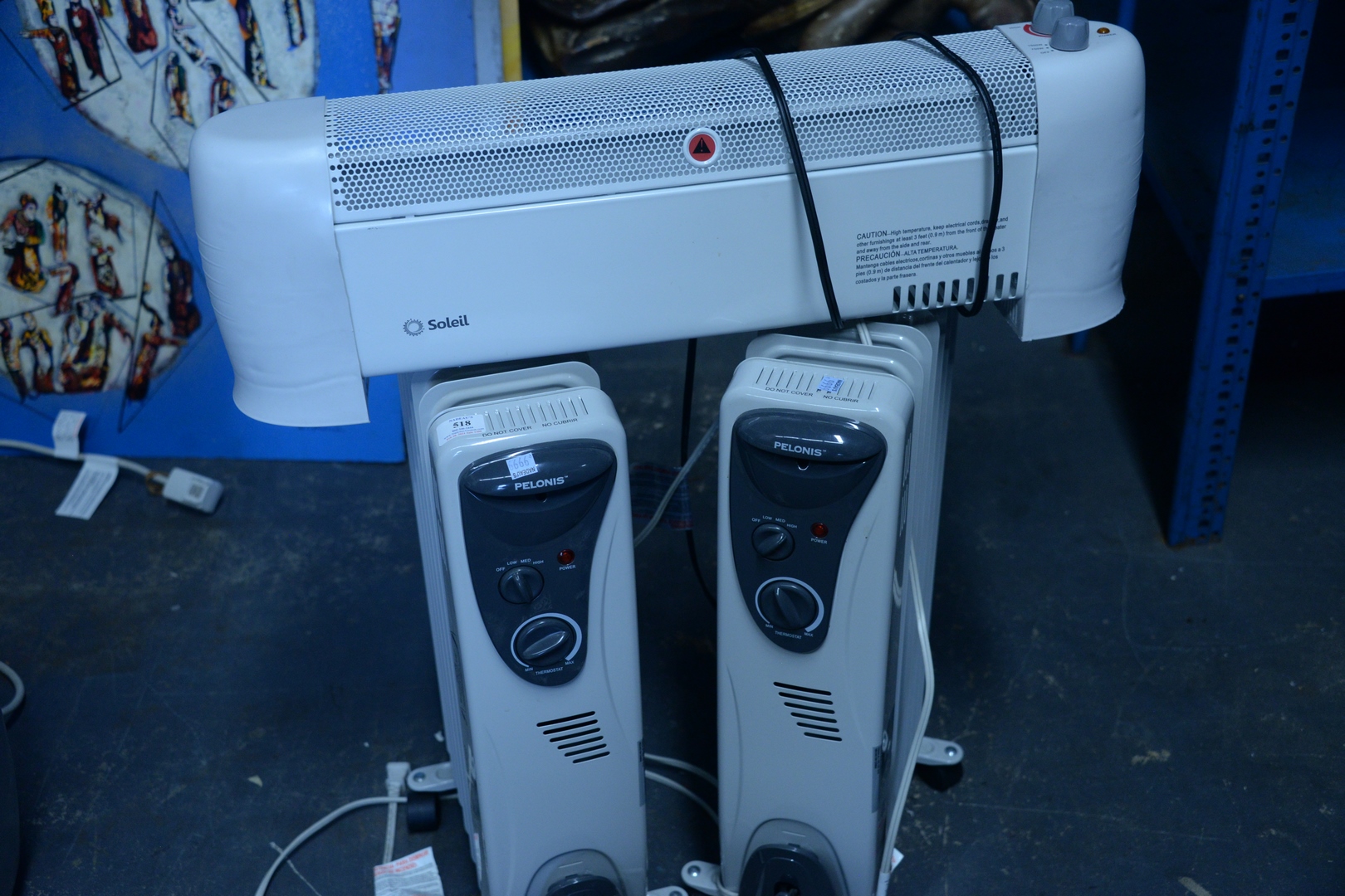 Lot 518: Three Heaters, to include two Pelonis space heaters, new retails for $100 each; along with a Soleil heater.