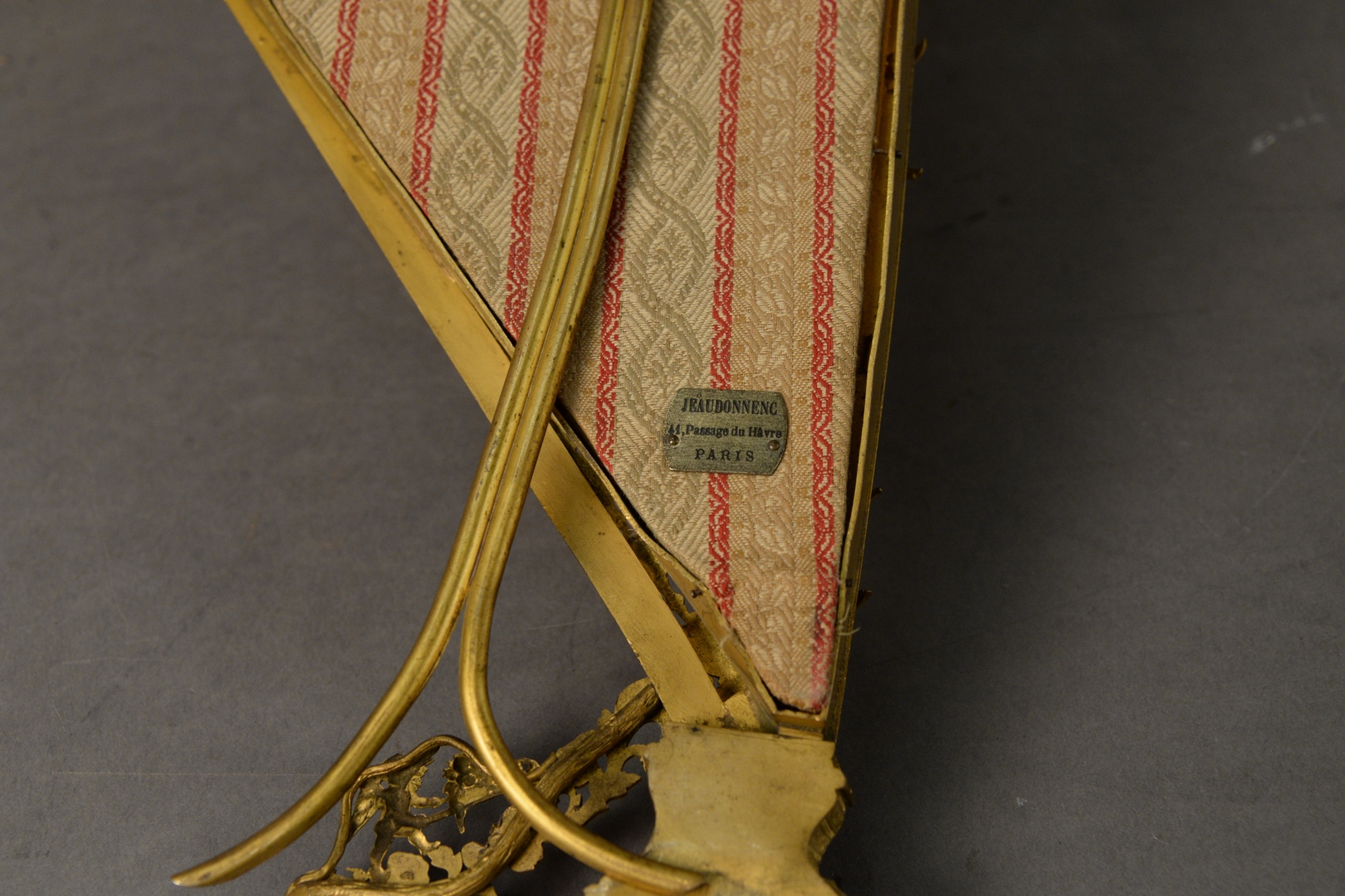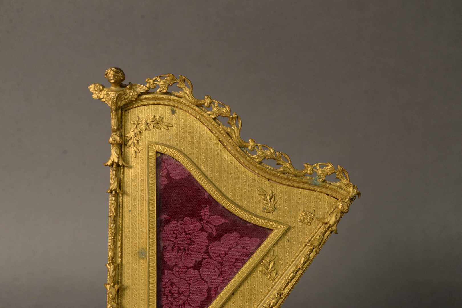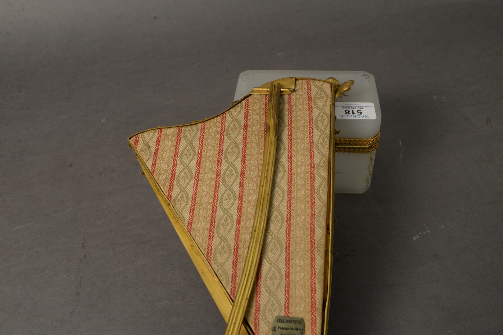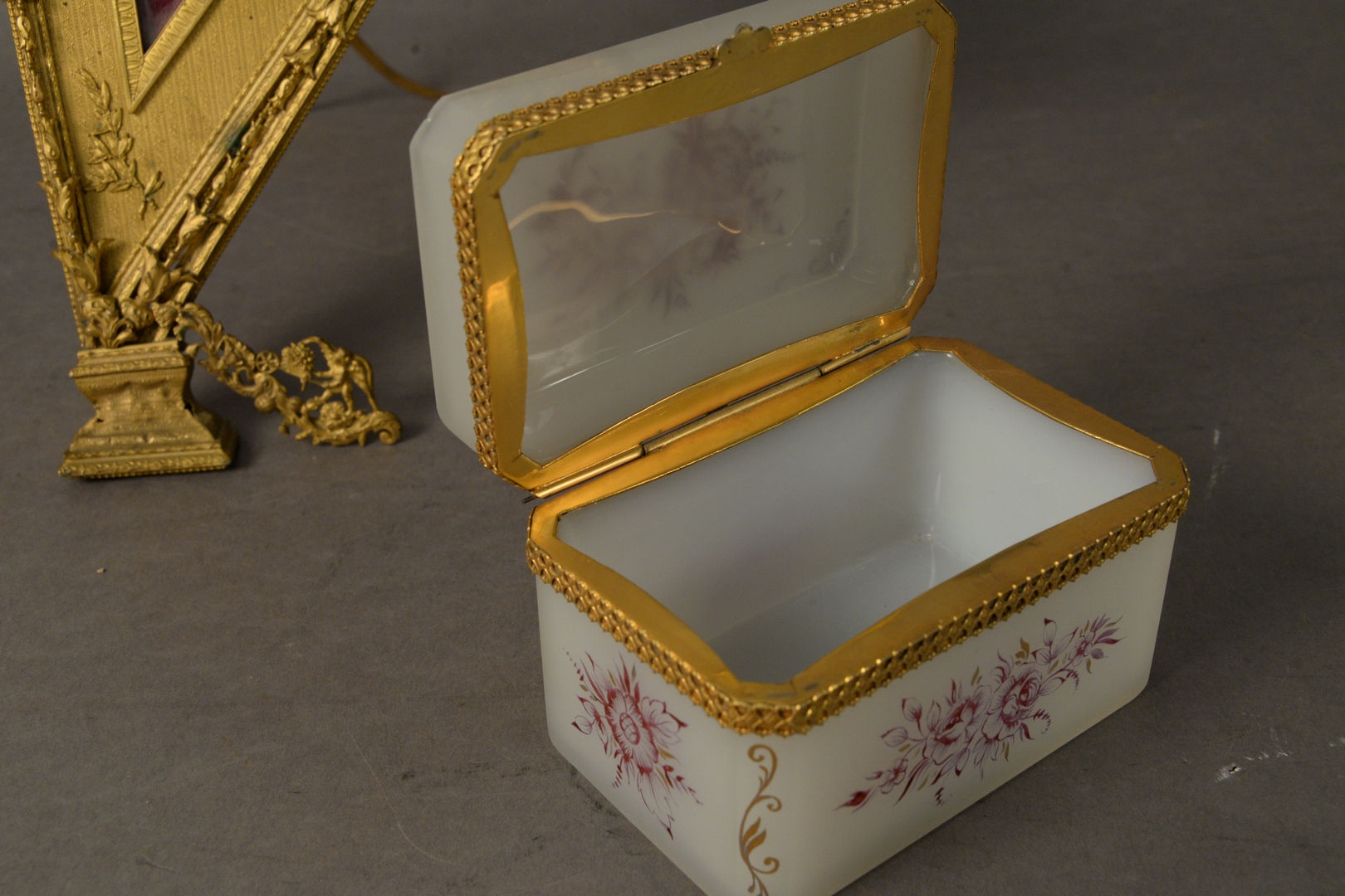 Two Piece Lot to include an opaline and brass mounted box, having painted floral and foliate decoration along with a gilt bronze harp form frame, marked ‘Paris’ on the reverse, height 12 1/2 inches, width 7 1/2 inches.