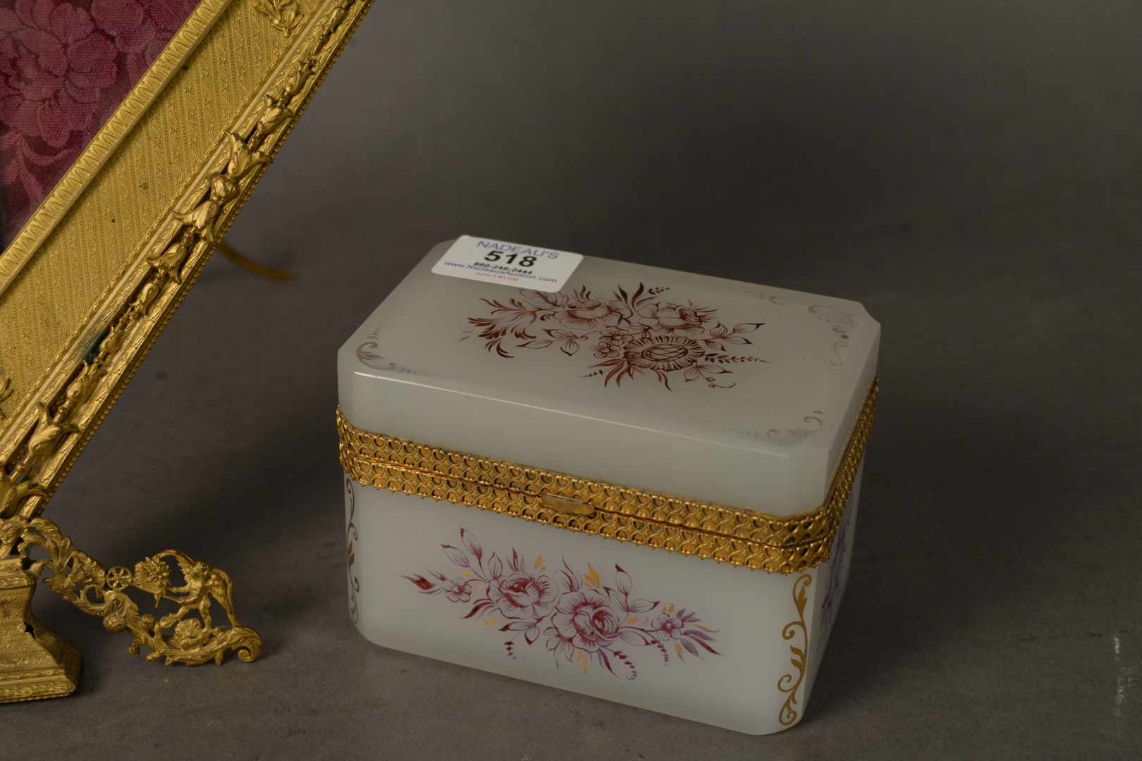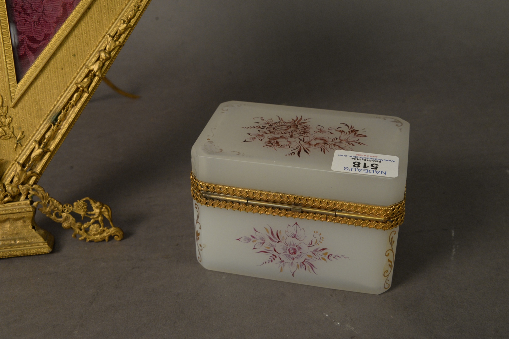 Lot 518: Two Piece Lot to include an opaline and brass mounted box, having painted floral and foliate decoration along with a gilt bronze ha…