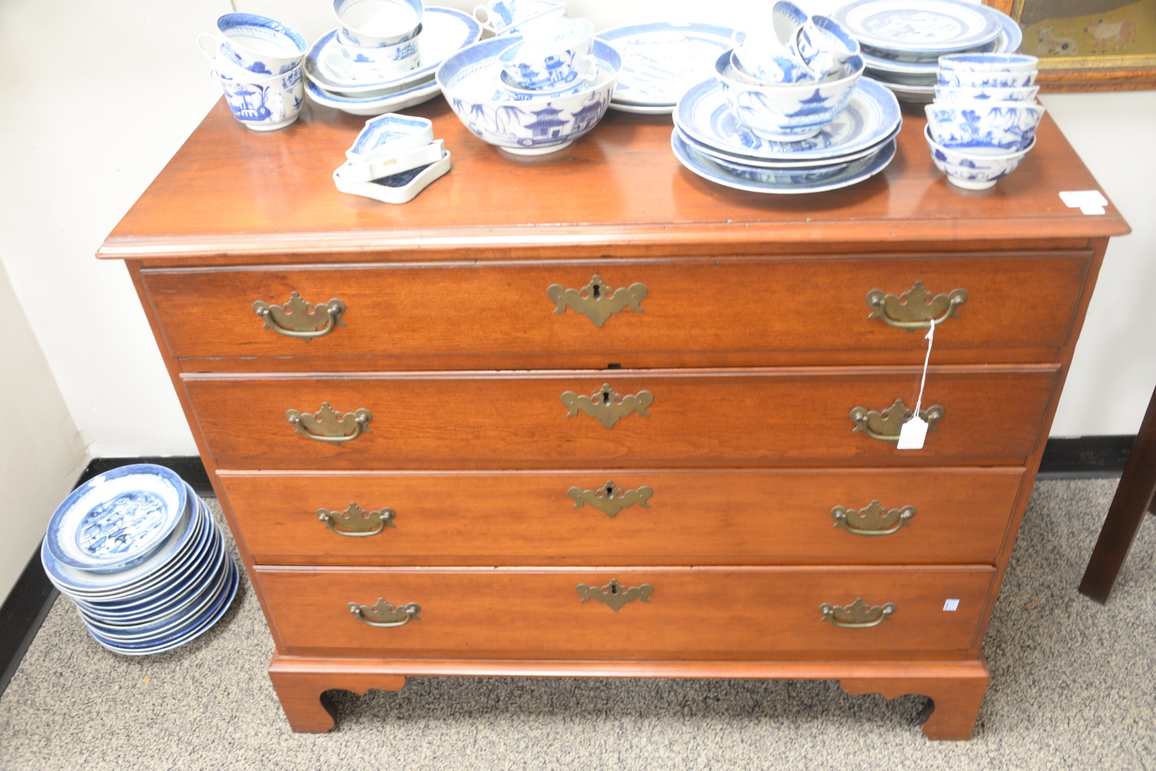 Lot 519: Chippendale Cherry Four Drawer Chest on bracket feet, circa 1770, replaced feet, height 34 1/2 inches, top 20 x 40 1/4.