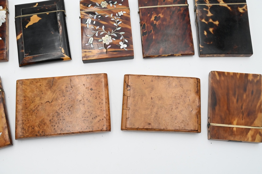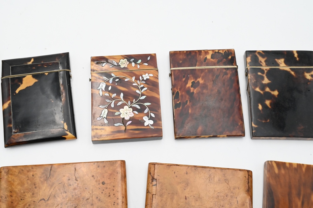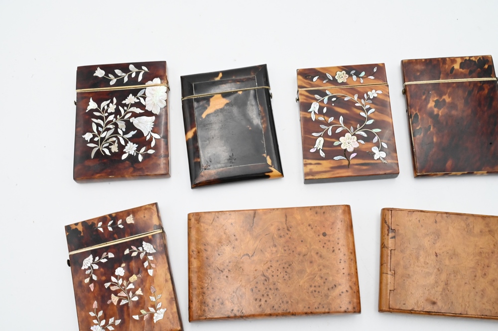 Collection of Nine Cigarette Cases and Boxes, to include three tortoise shell with mother of pearl inlaid flowers; four tortoise shell; along with two burl wood; largest 3 1/4″ x 5 1/4″. Please note: Items containing ivory cannot be purchased or shipped by bidders residing outside of the United States or California, Hawaii, Nevada, New Jersey, New York, Washington, Oregon, or District of Columbia. If an ivory item is purchased by a bidder in one of the above mentioned locations or attempts to ship ivory to one of the above mentioned locations, bidder will forfeit the item and be responsible for any incurred fees such as a restocking fee.