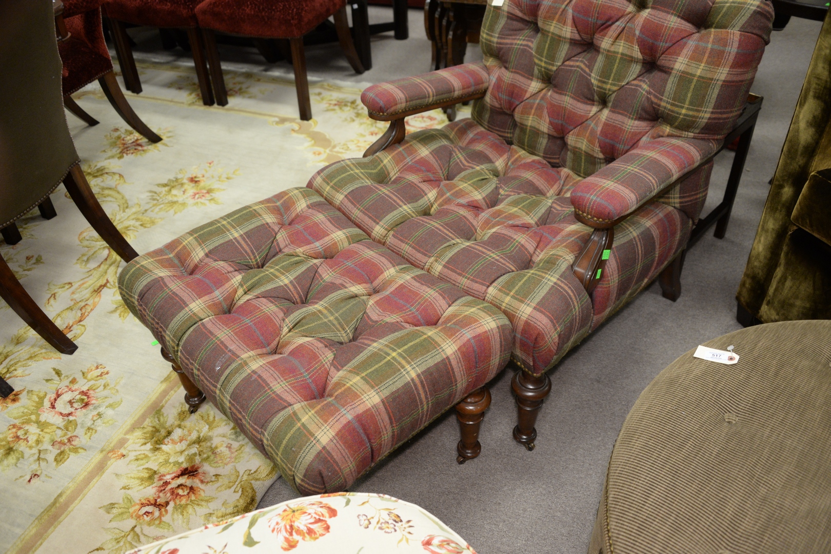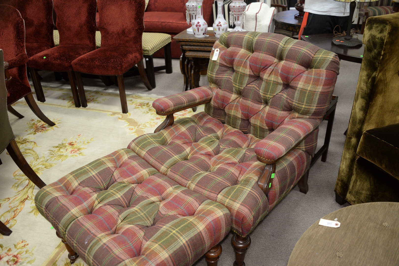 Lot 519: Edward Farrell Custom Upholstered Chair and Ottoman, height 37 inches, width 31 inches. Provenance: David and Cynthia Kim, 22 Stoney Wylde Lane, Greenwich, Connecticut. View home by visiting: https://www.zillow.com/homedetails/22-Stoney-Wylde-Ln-Greenwich-CT-06830/177238281_zpid/